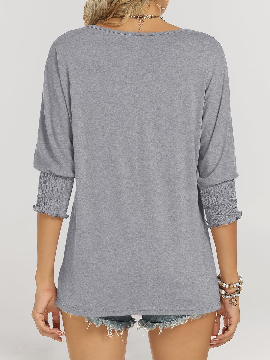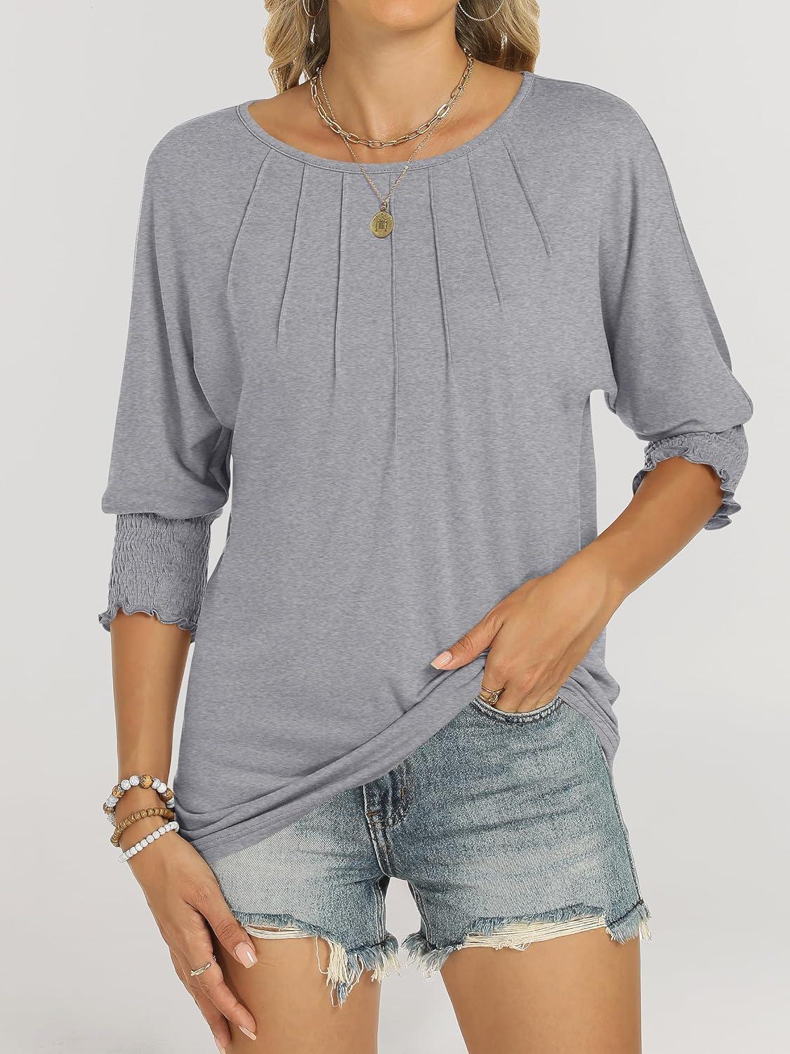 ANRABESS Womens Tops 3/4 Sleeve Crewneck Pleated Dressy Casual Shirts 2025 Summer Business Basic Tee Blouses Work Outfits(Grey)