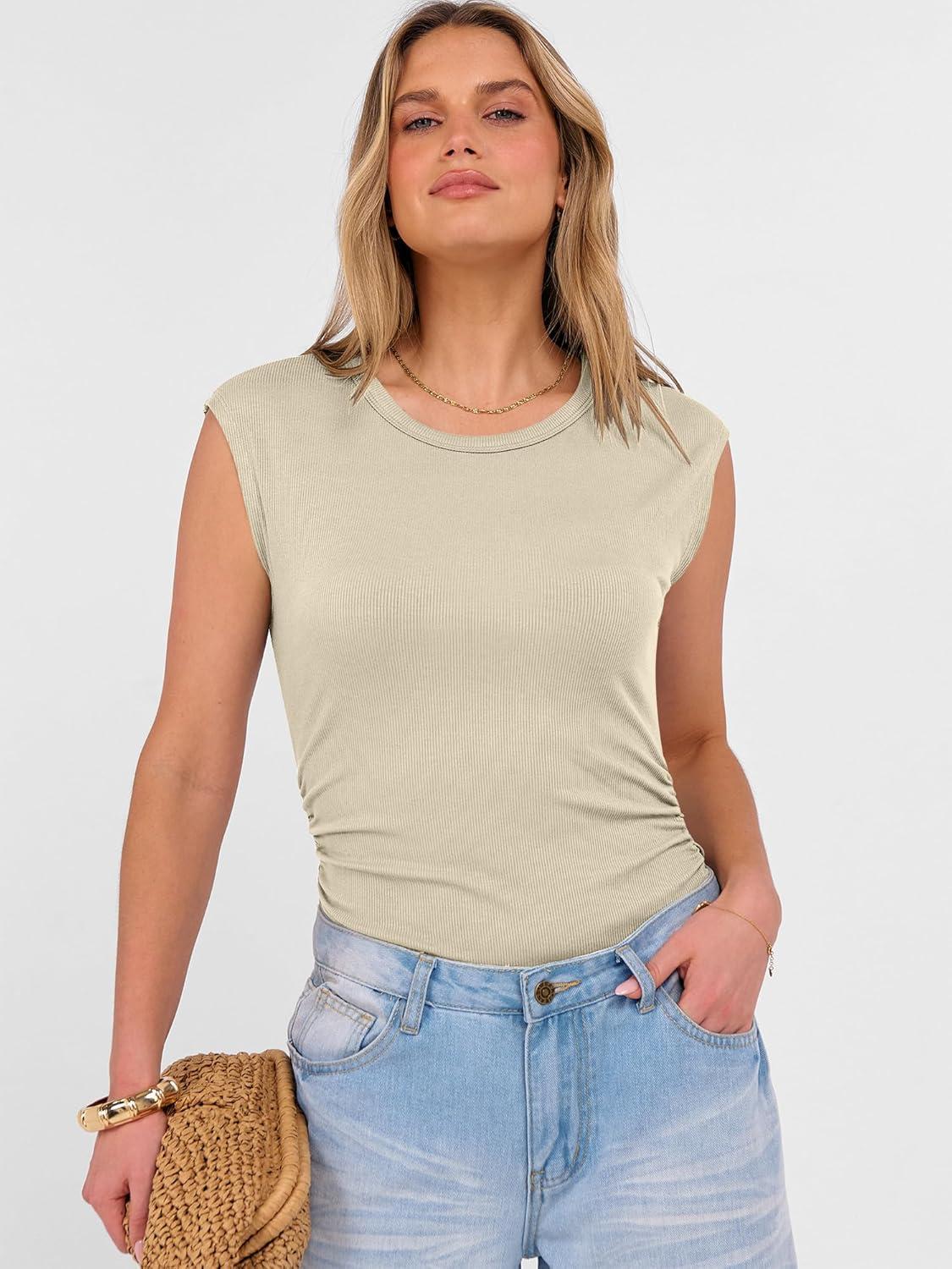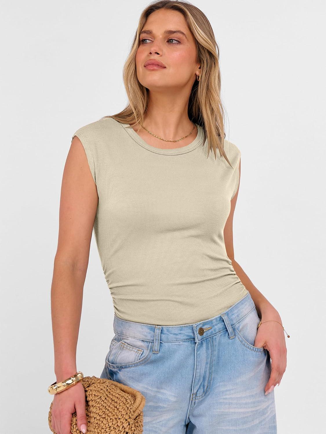 ANRABESS Womens Tops Cap Sleeve Crewneck Shirts Casual Ribbed Knit Slim Fit Ruched Summer Basic Tee Tank 2026 Trendy Clothes(Beige)