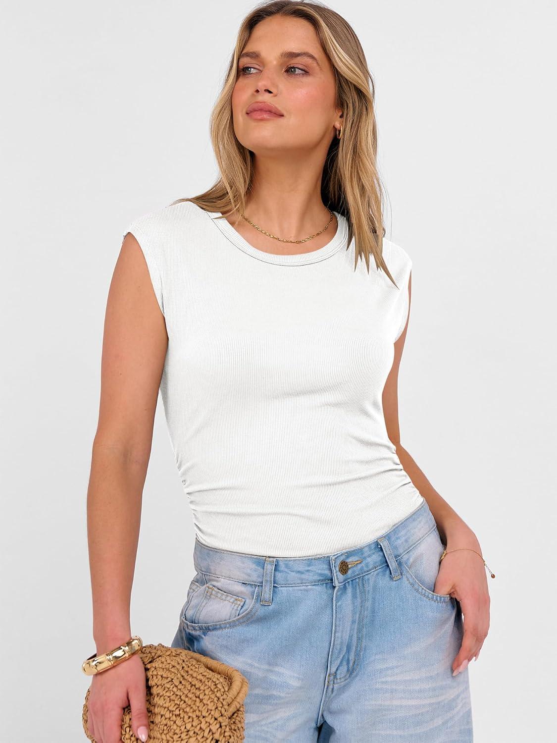 ANRABESS Womens Tops Cap Sleeve Crewneck Shirts Casual Ribbed Knit Slim Fit Ruched Summer Basic Tee Tank 2026 Trendy Clothes(White)