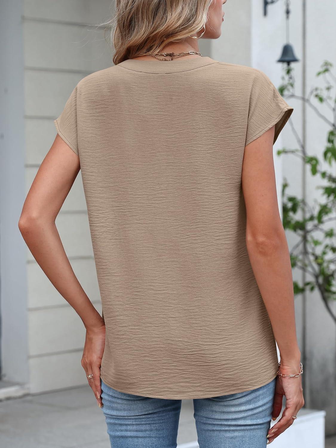 ANRABESS Womens Tops Dressy Casual Cap Sleeve Summer Work Blouses Textured V Neck Henley Shirts 2026 Trendy Business Outfits(Yellow Khaki)