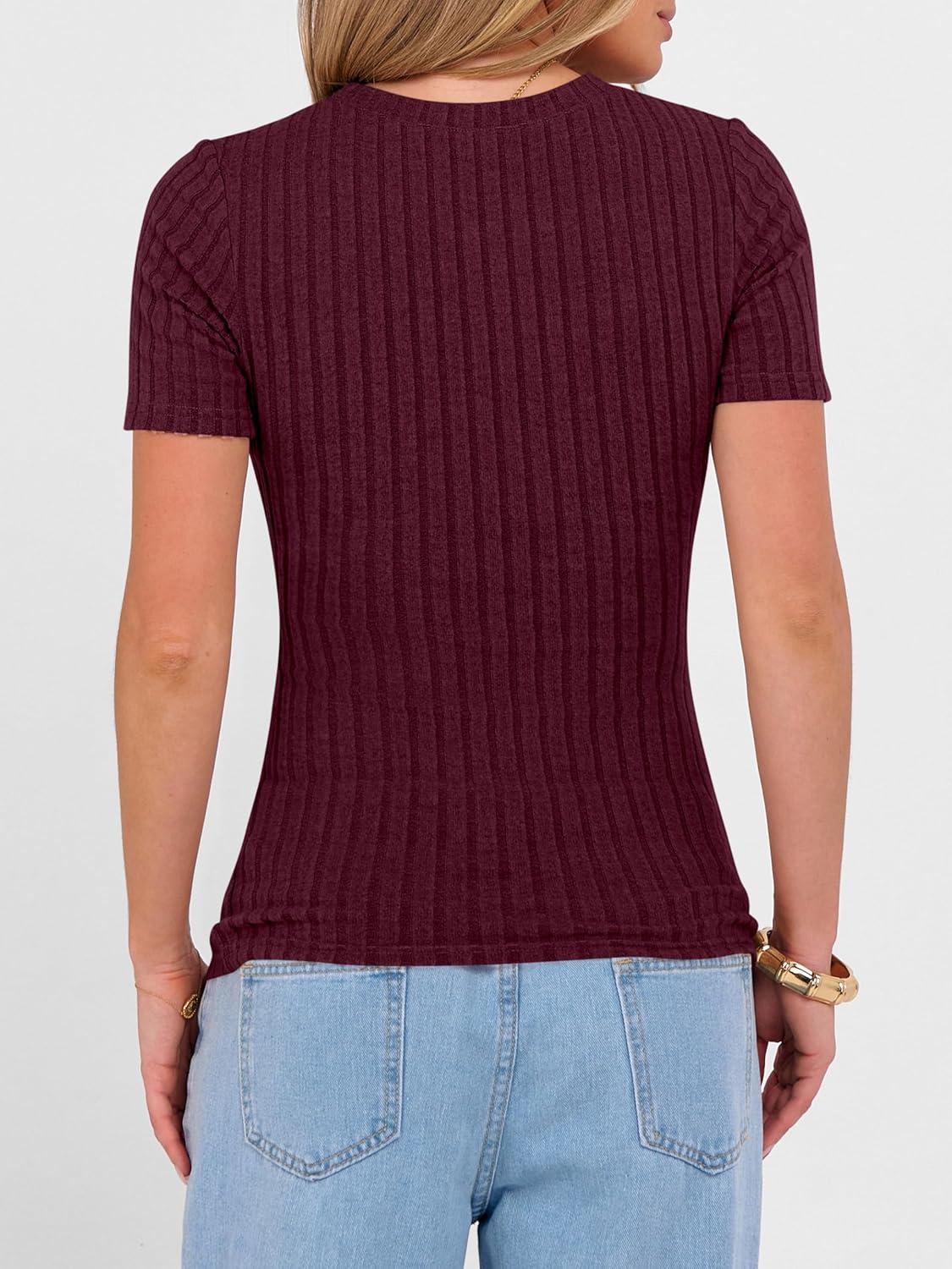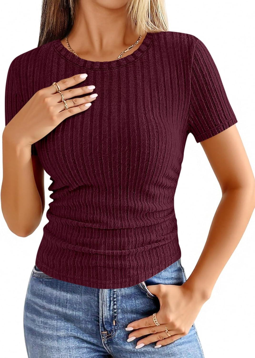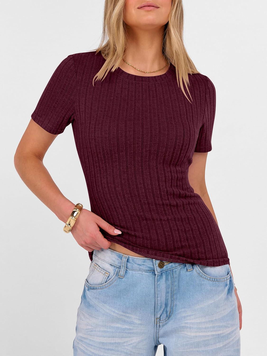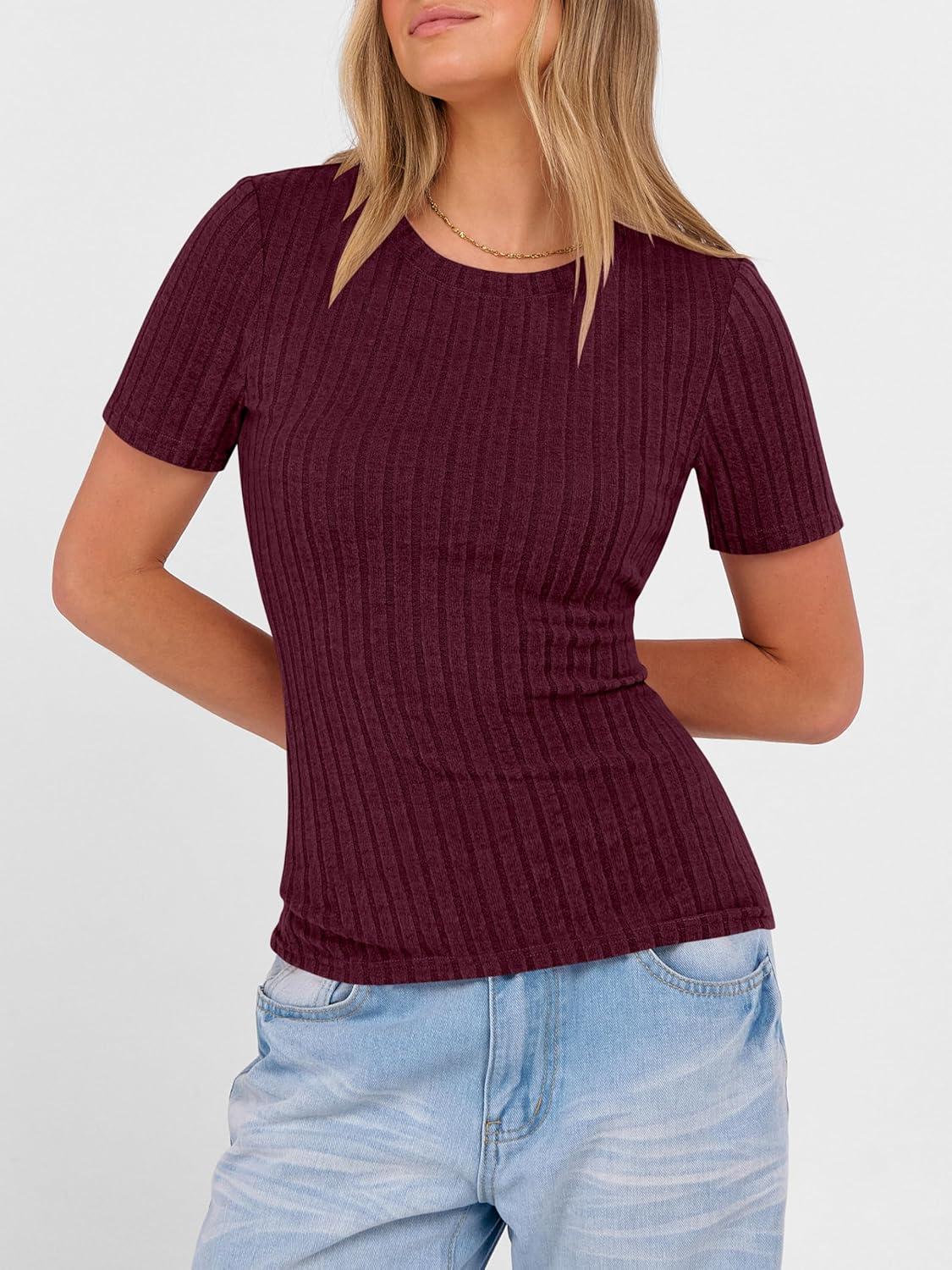 ANRABESS Womens Tops Short Sleeve Crewneck Shirts Slim Fit Ribbed Knit Lightweight Sweater 2026 Summer Dressy Casual T-Shirts(Burgundy)