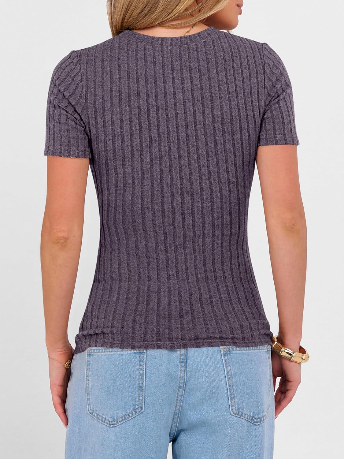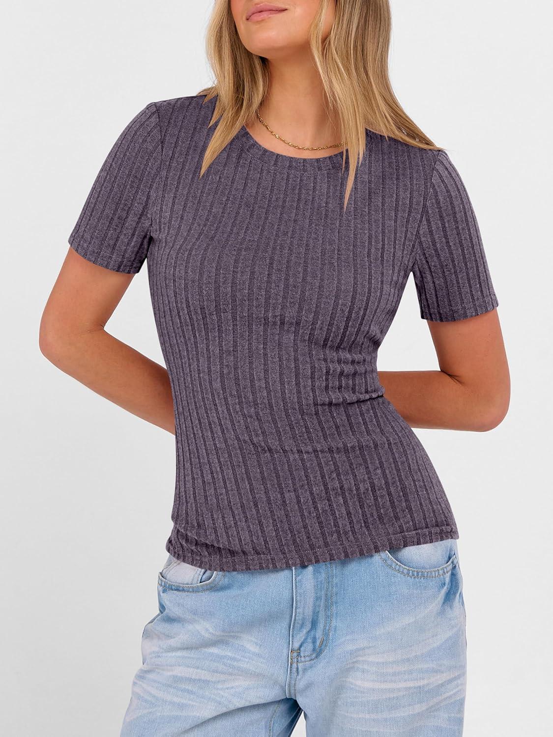 ANRABESS Womens Tops Short Sleeve Crewneck Shirts Slim Fit Ribbed Knit Lightweight Sweater 2026 Summer Dressy Casual T-Shirts(Purple)