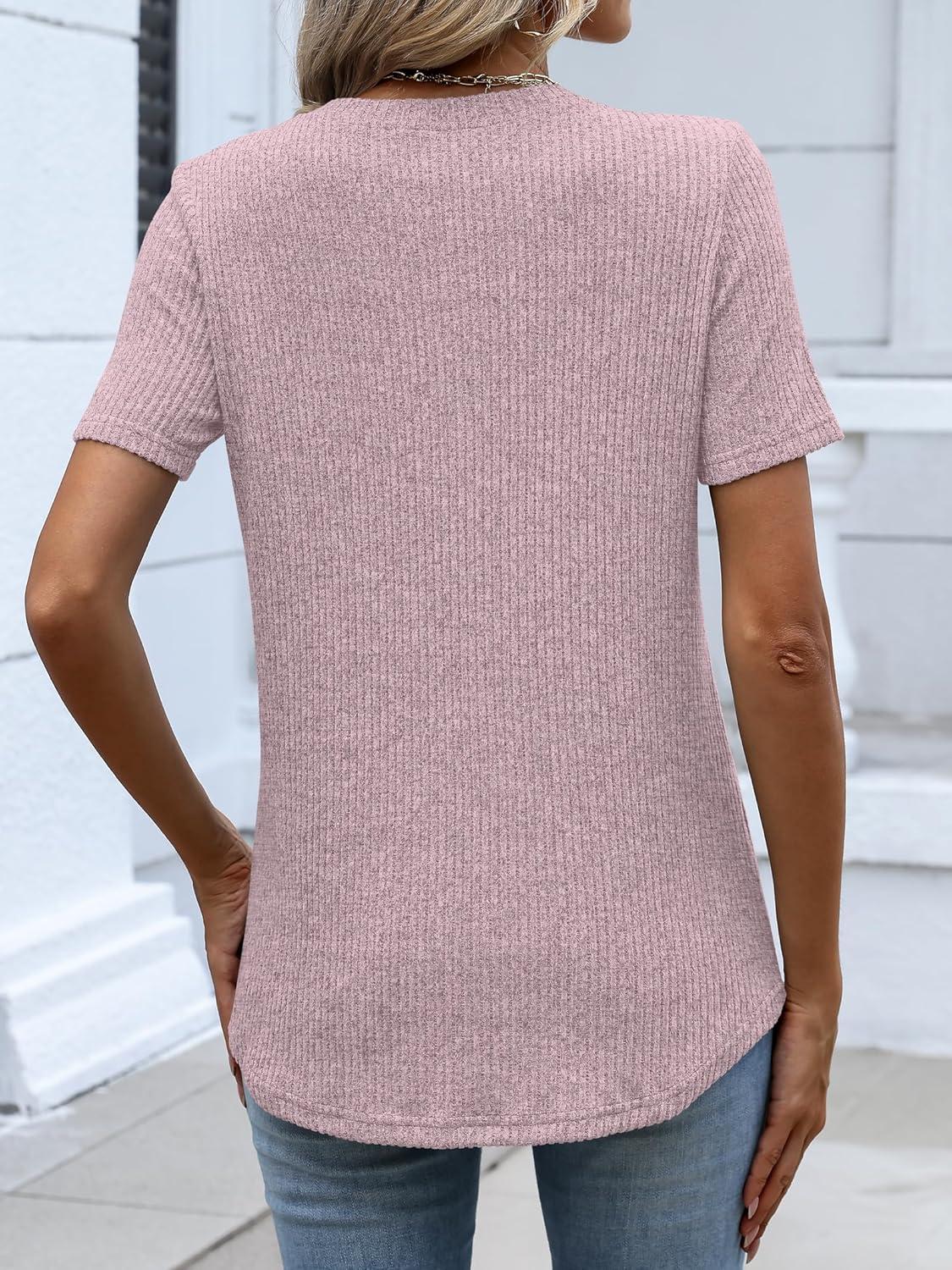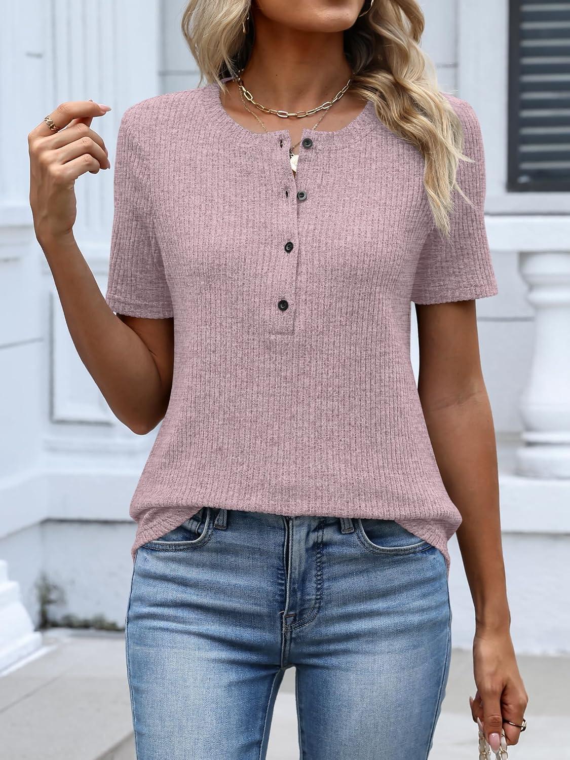 ANRABESS Womens Tops Short Sleeve Henley Shirts Dressy Casual Blouse Summer Cute Tshirt 2026 Spring Lightweight Tunic Sweater(Pink)