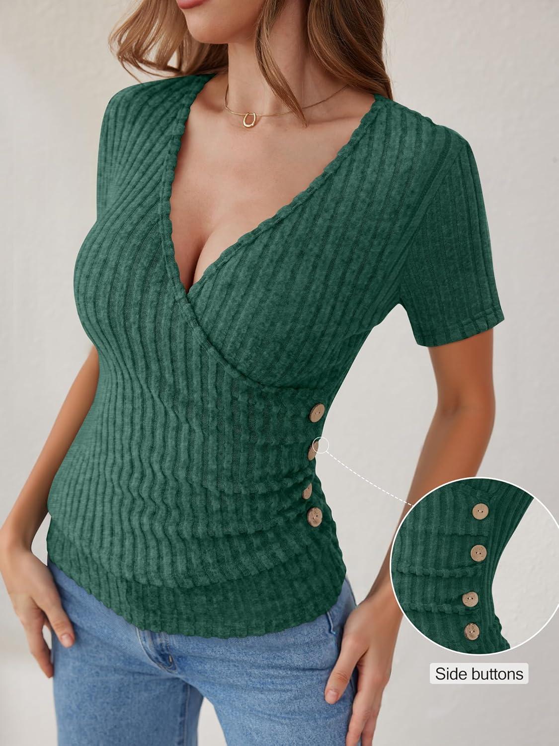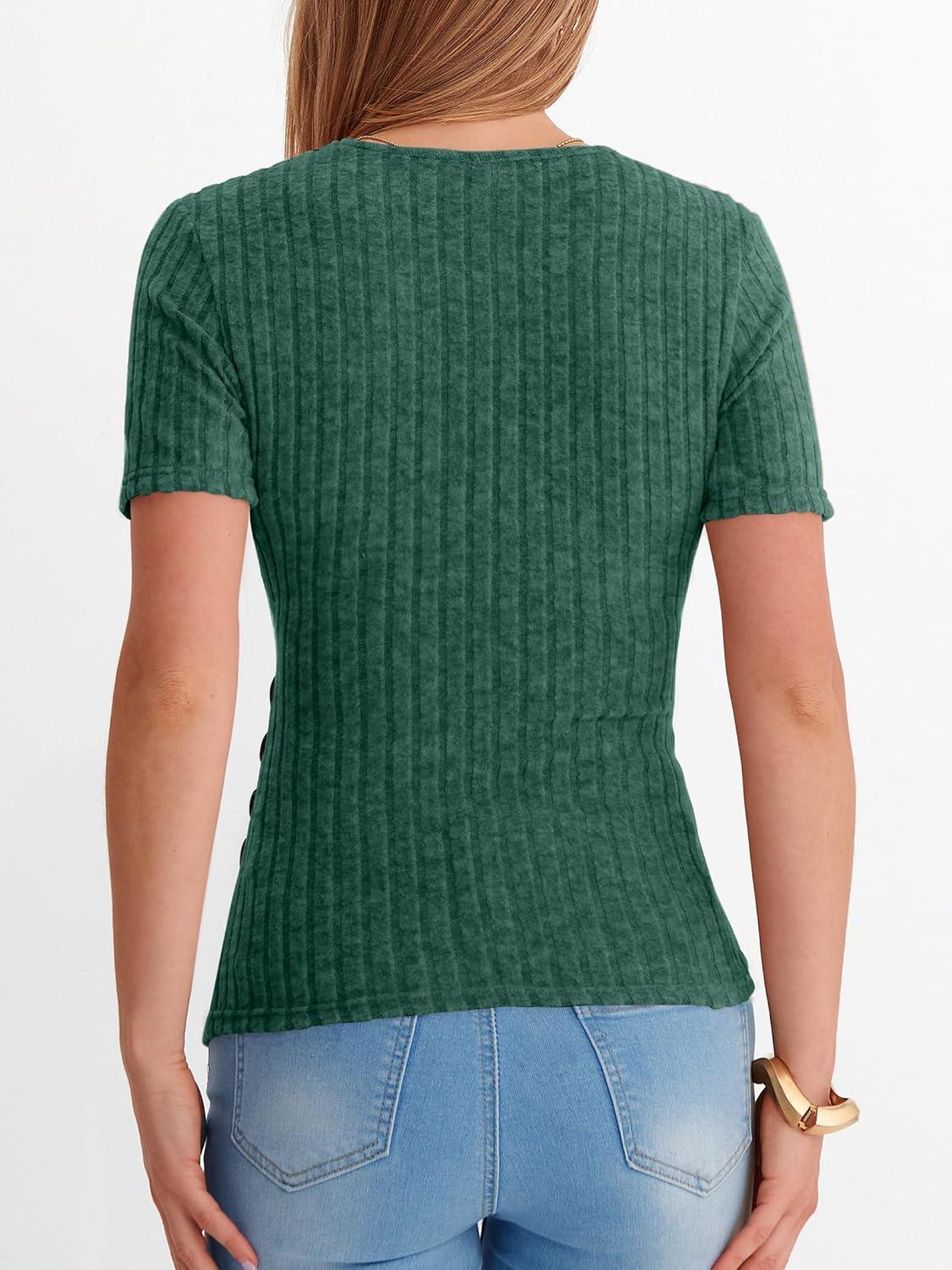 ANRABESS Womens Tops Short Sleeve V Neck Sexy Ribbed Knit Slim Fit Lightweight Sweater 2026 Summer Dressy Casual T-Shirts(Green)
