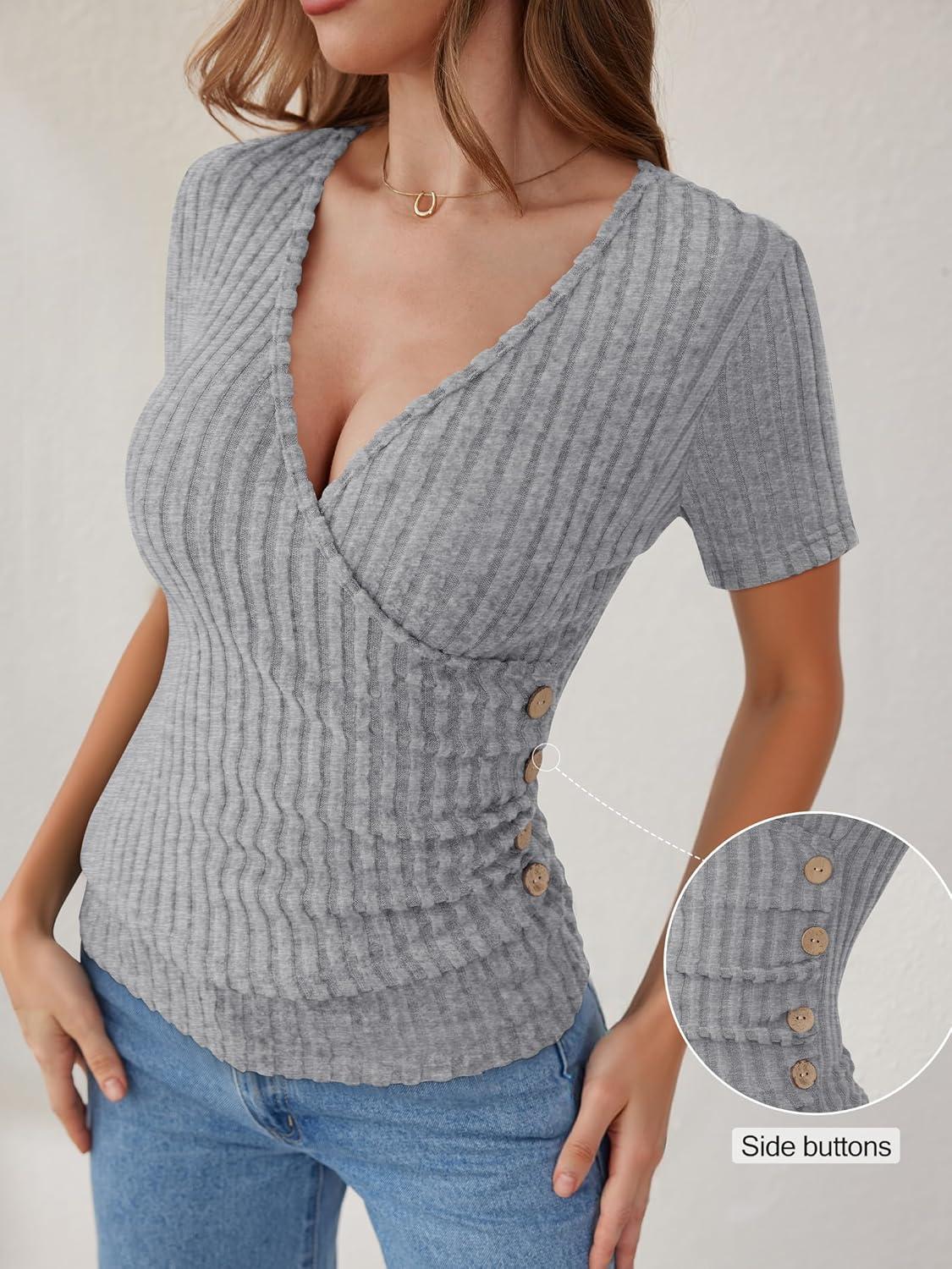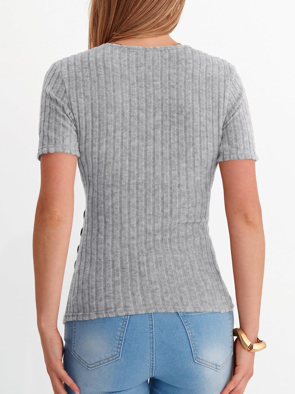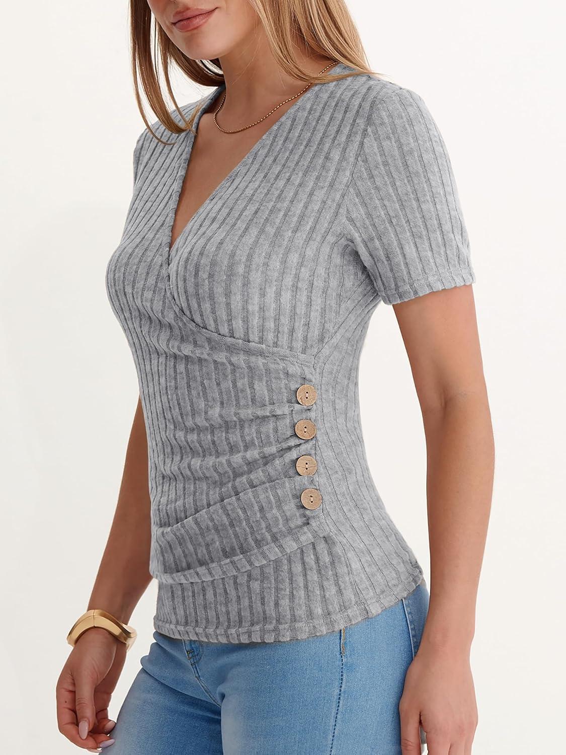 ANRABESS Womens Tops Short Sleeve V Neck Sexy Ribbed Knit Slim Fit Lightweight Sweater 2026 Summer Dressy Casual T-Shirts(Grey)