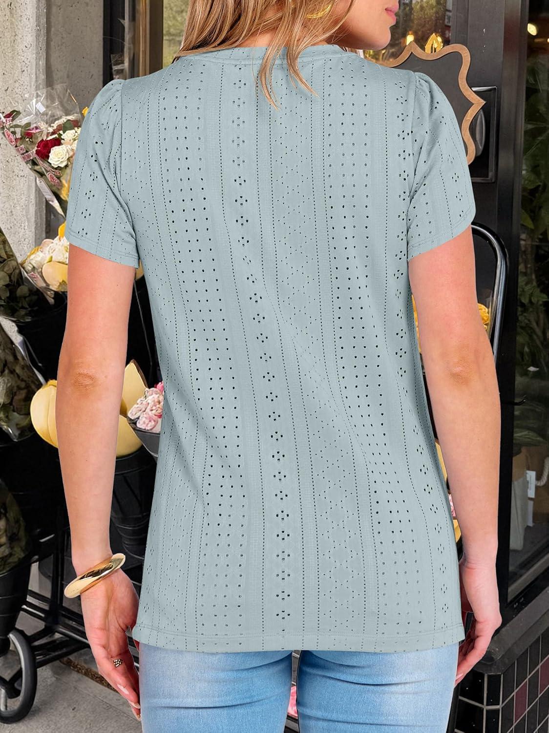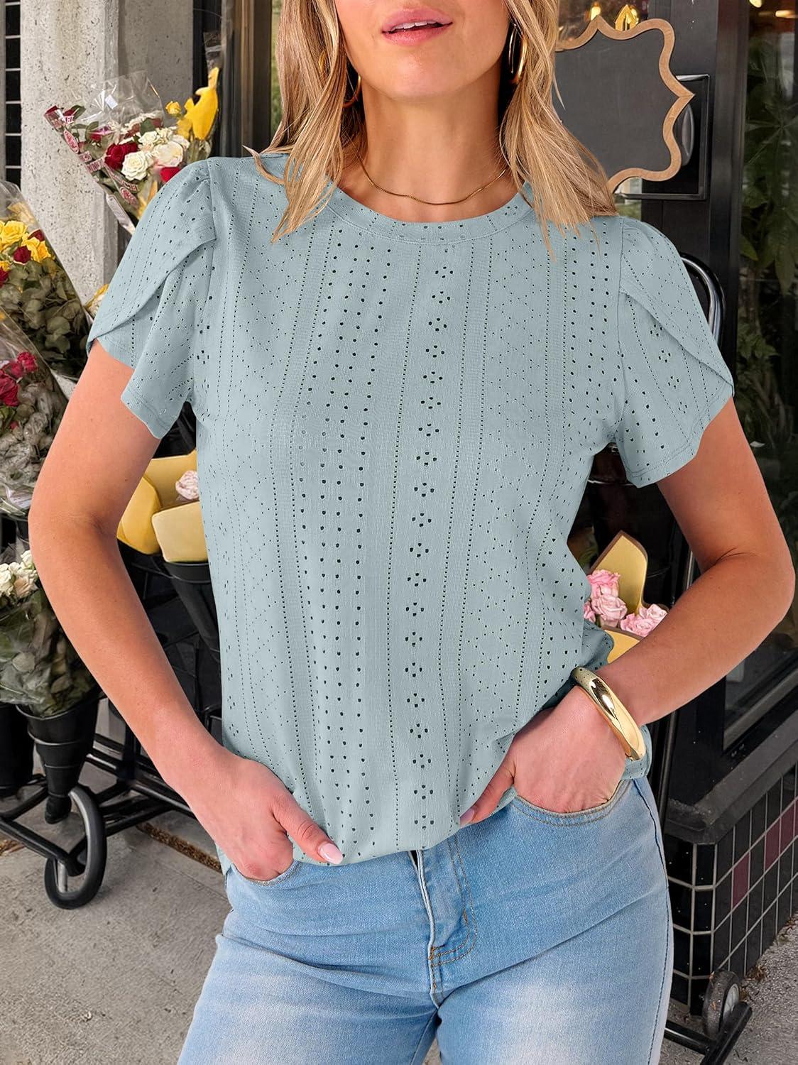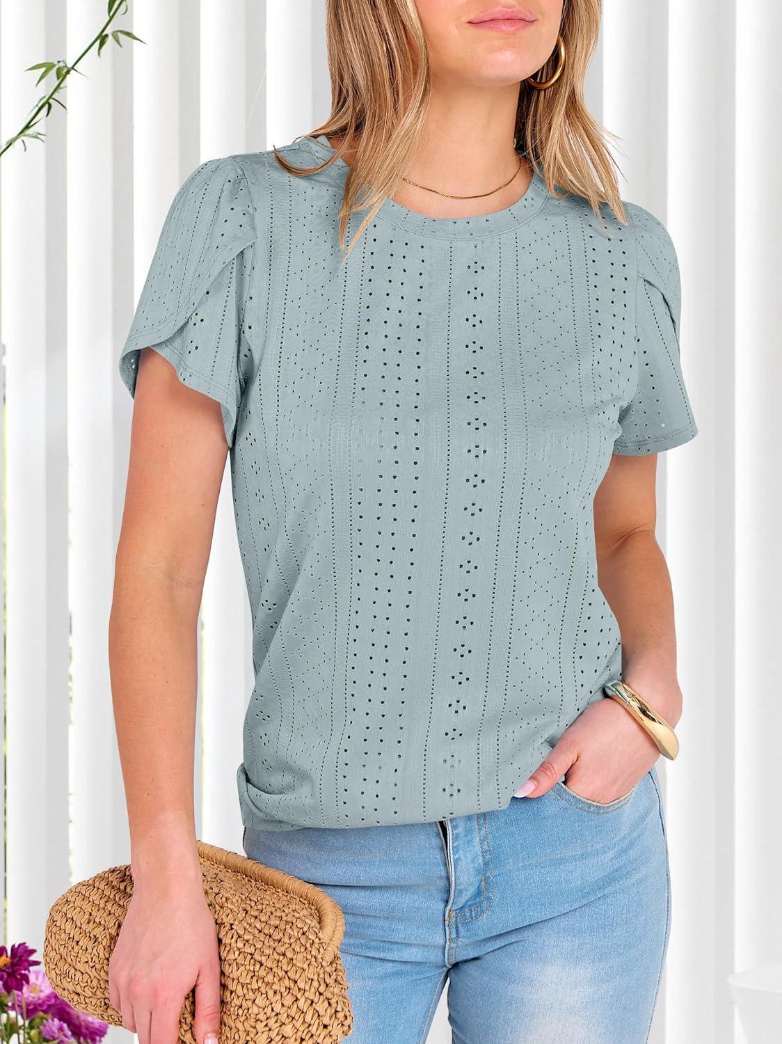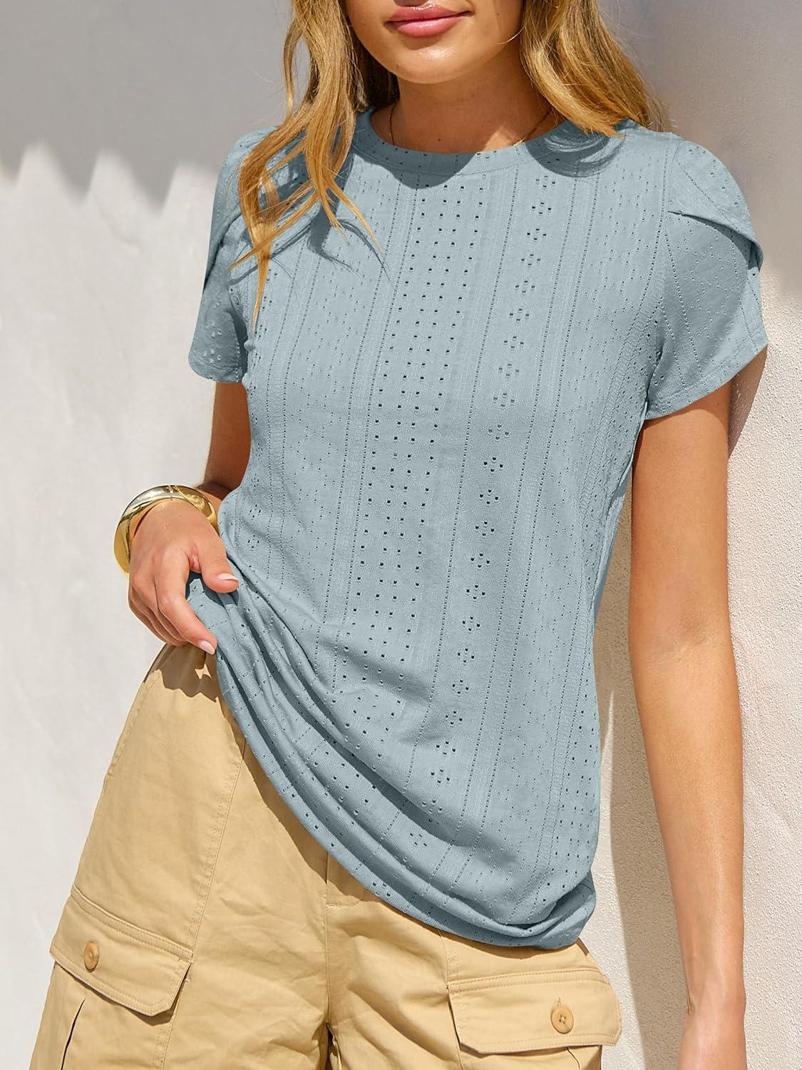 ANRABESS Womens Tops Summer Eyelet Petal Short Sleeve T Shirts Dressy Casual Blouses Ladies Basic Tees 2026 Spring Clothes(Sky Blue)
