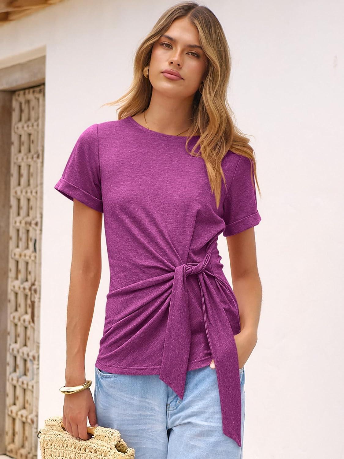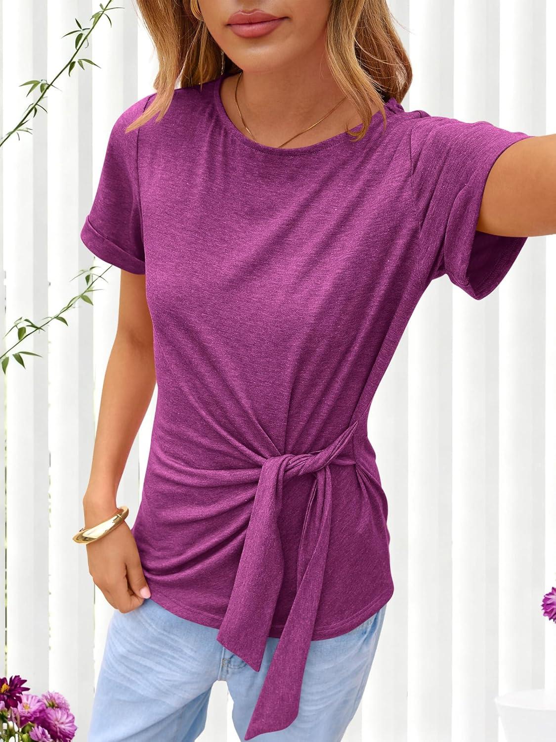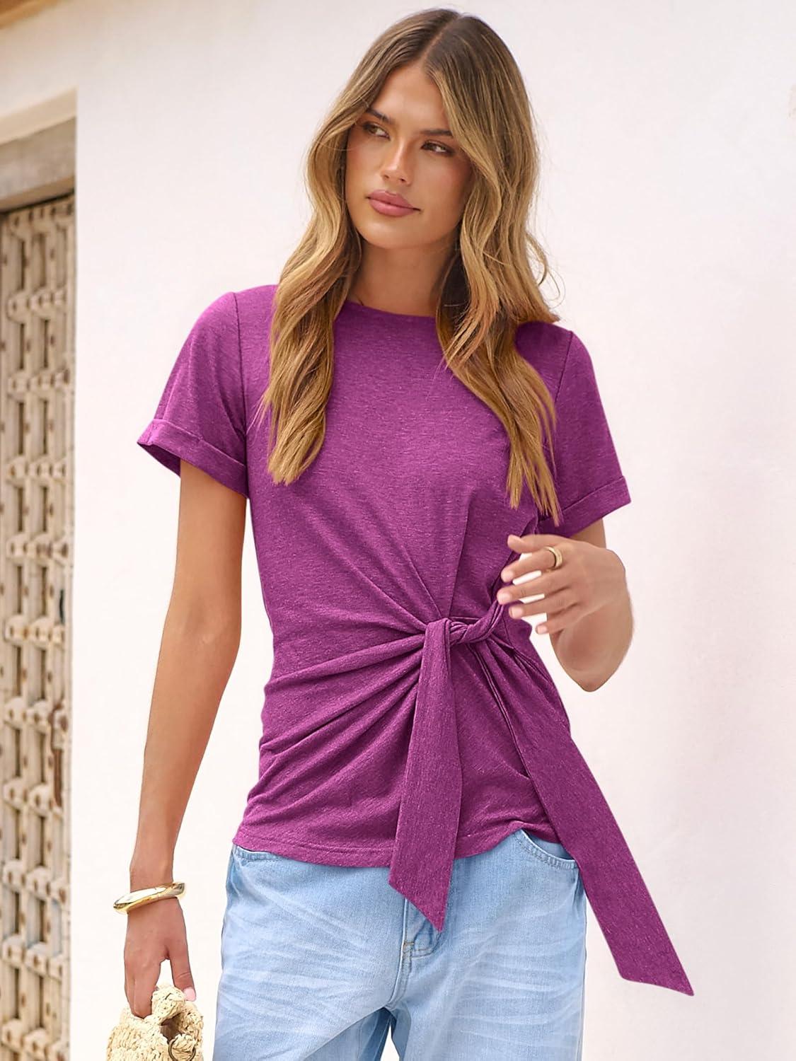 ANRABESS Womens Tops Summer Short Sleeve Crewneck Tie Waist Shirts Dressy Casual Blouse Tee 2026 Business Work Trendy Clothes(Fuchsia)