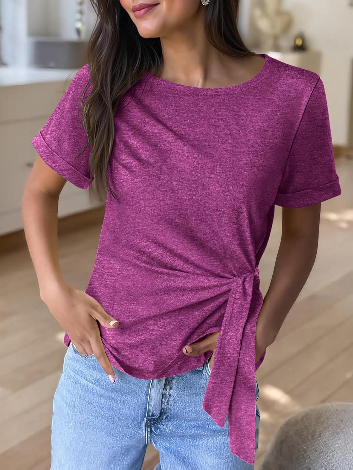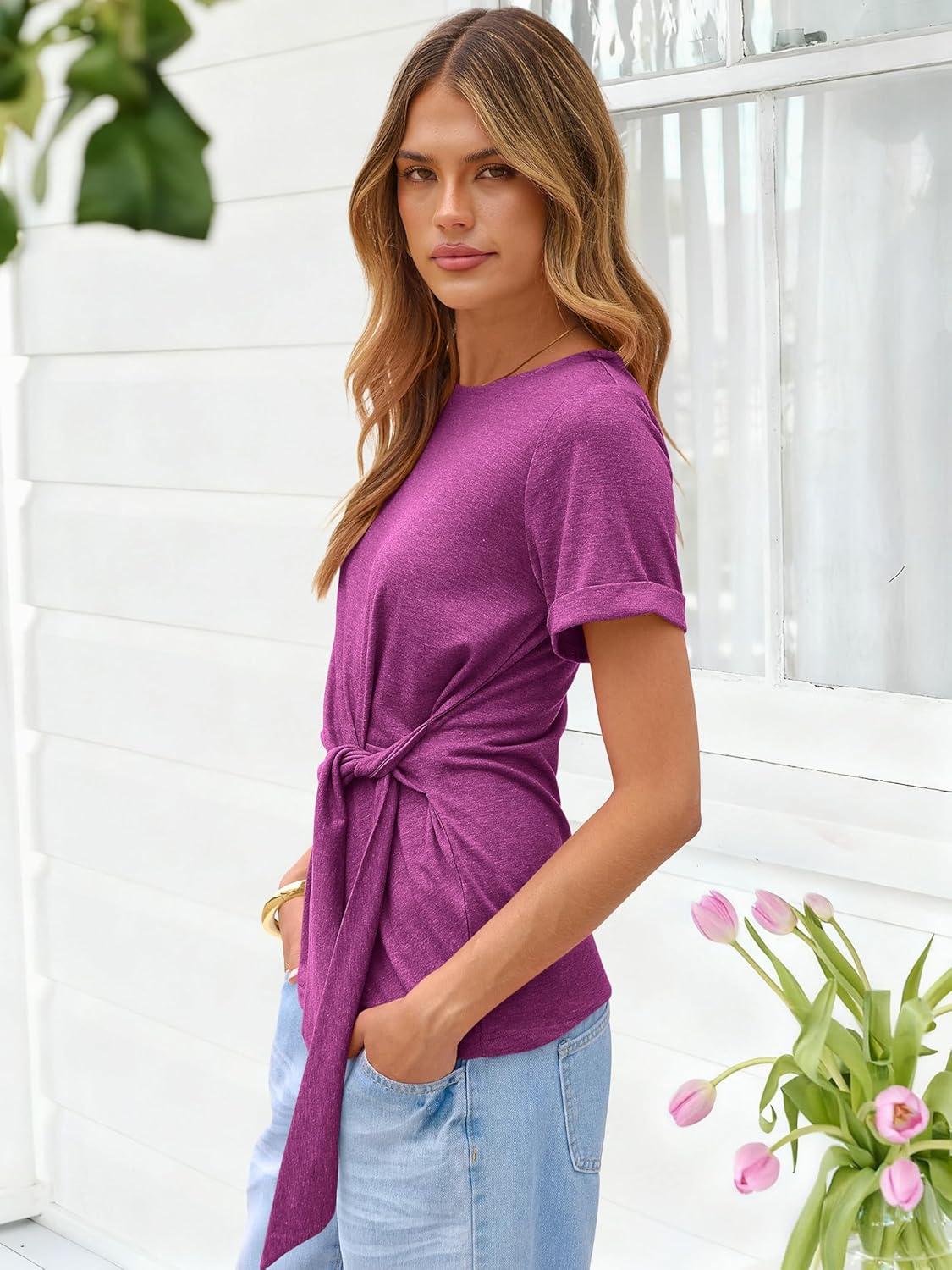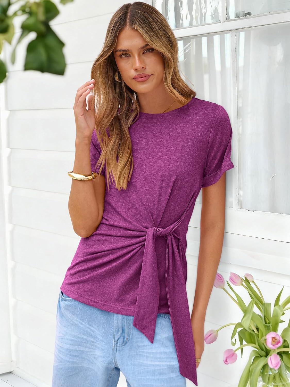 ANRABESS Womens Tops Summer Short Sleeve Crewneck Tie Waist Shirts Dressy Casual Blouse Tee 2026 Business Work Trendy Clothes(Fuchsia)