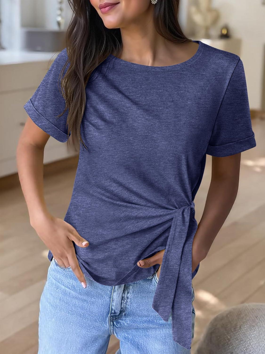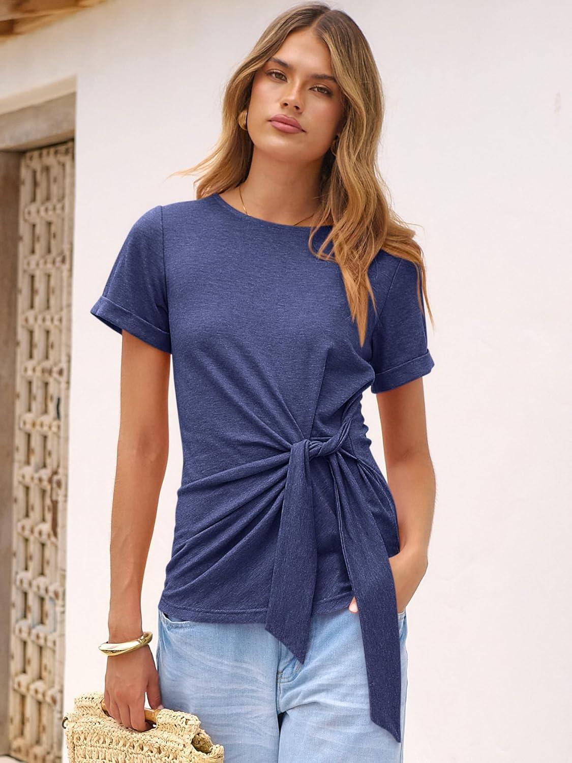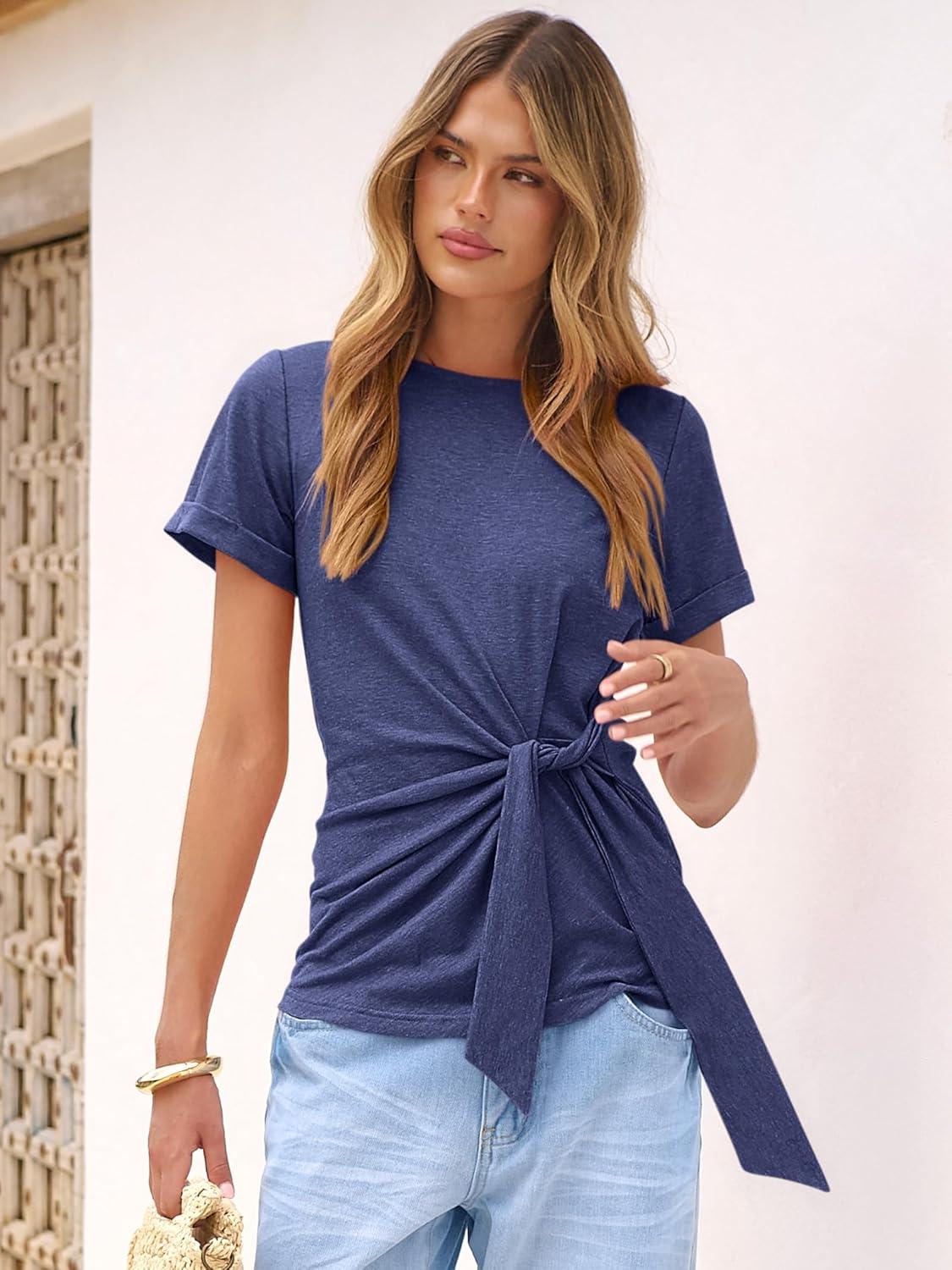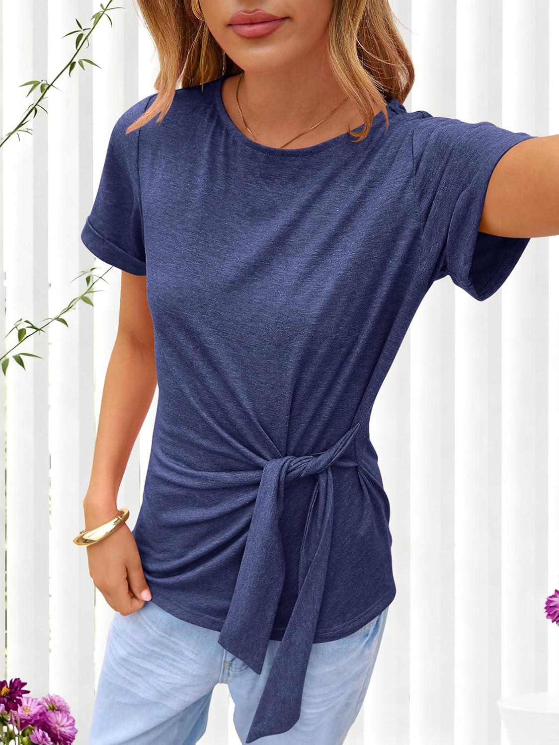 ANRABESS Womens Tops Summer Short Sleeve Crewneck Tie Waist Shirts Dressy Casual Blouse Tee 2026 Business Work Trendy Clothes(Navy Blue)