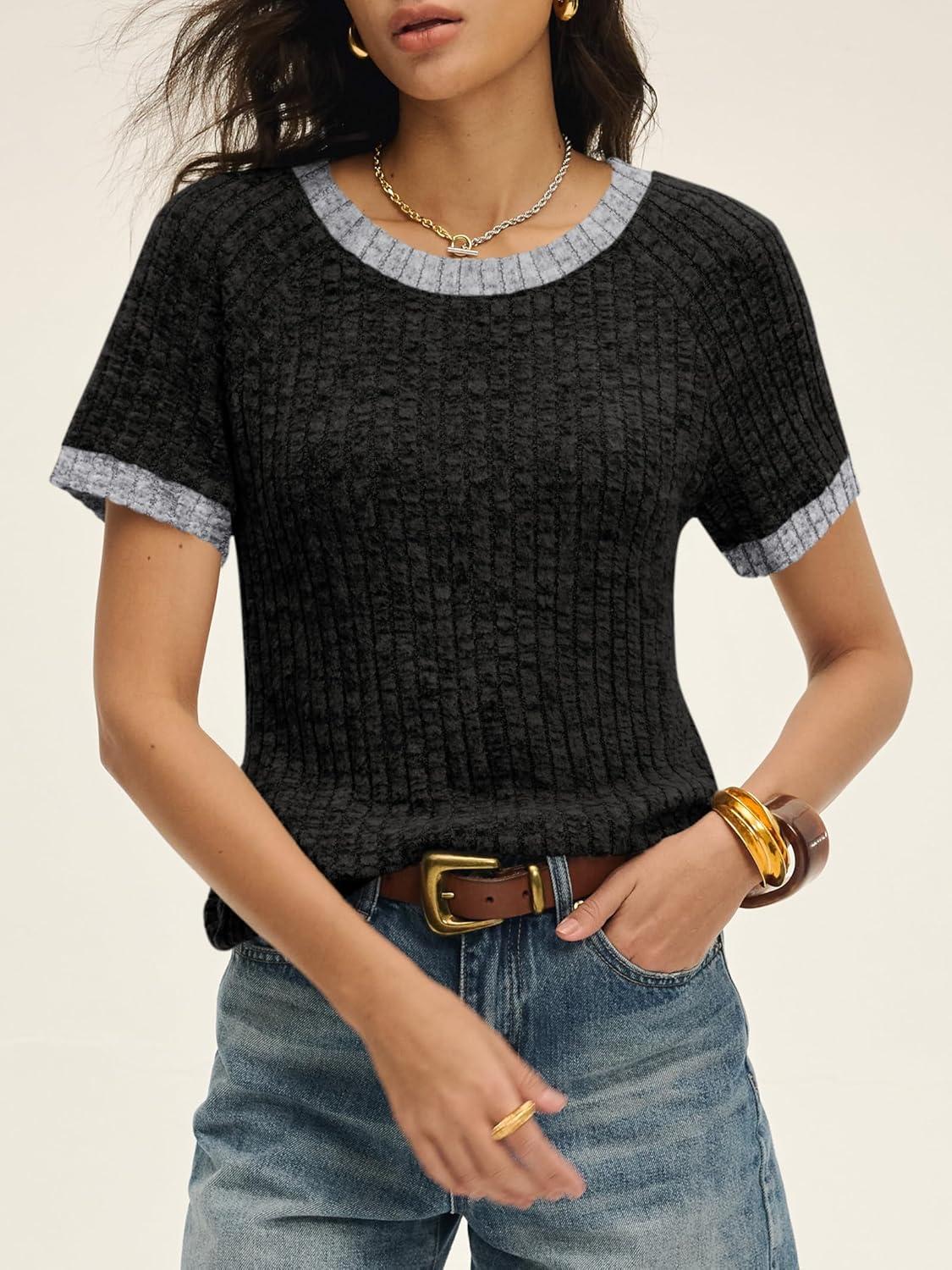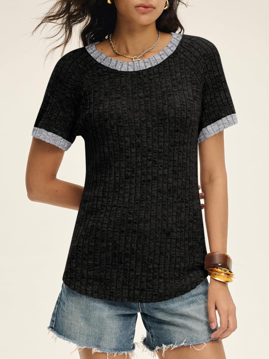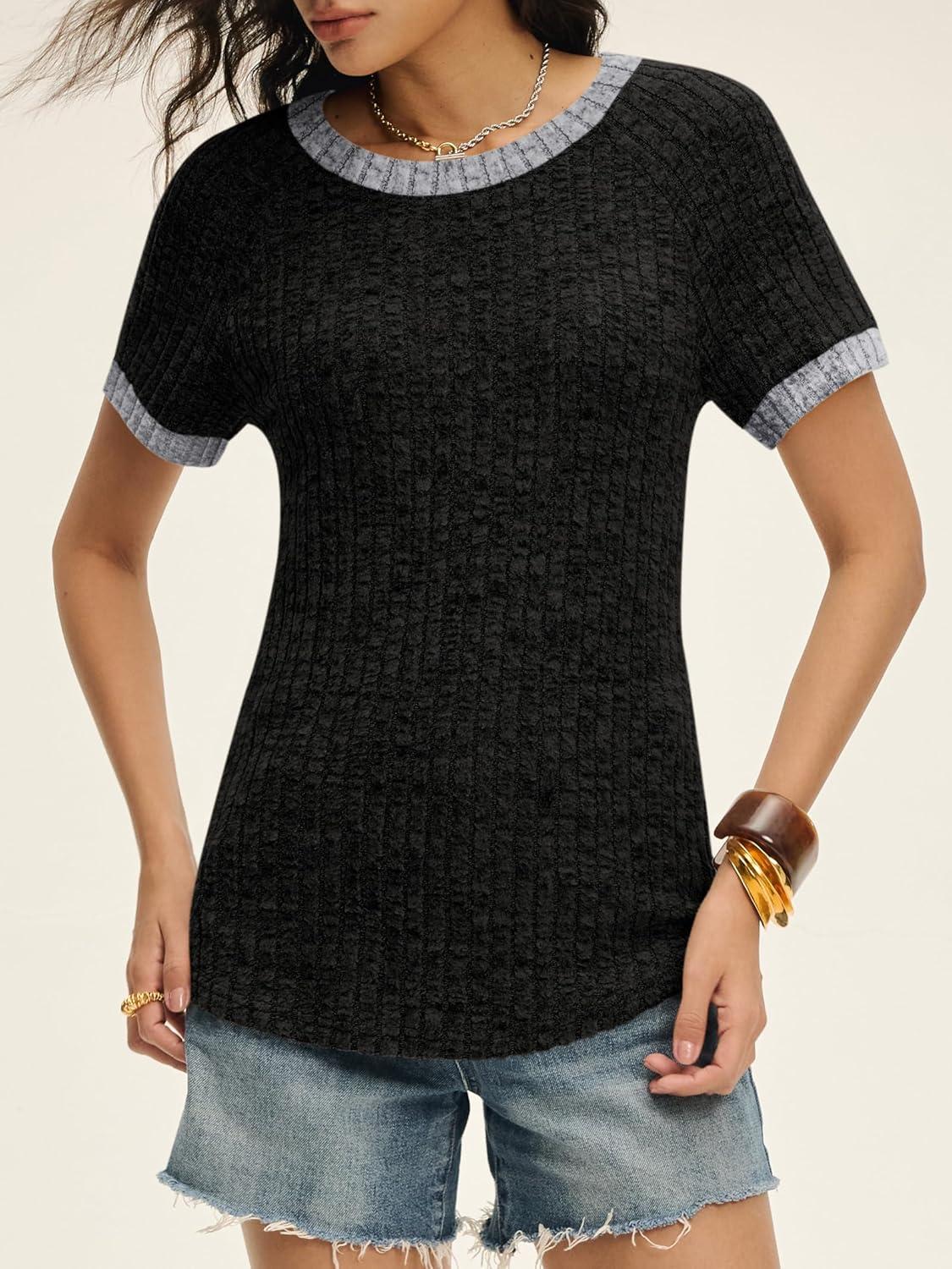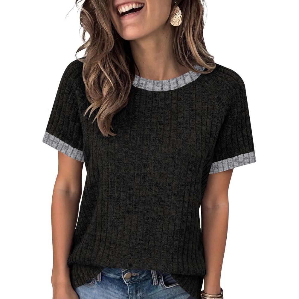 ANRABESS Womens Tops Summer Short Sleeve Shirts Dressy Casual Color Block Work Blouse 2026 Spring Trendy Lightweight Sweater(Black)