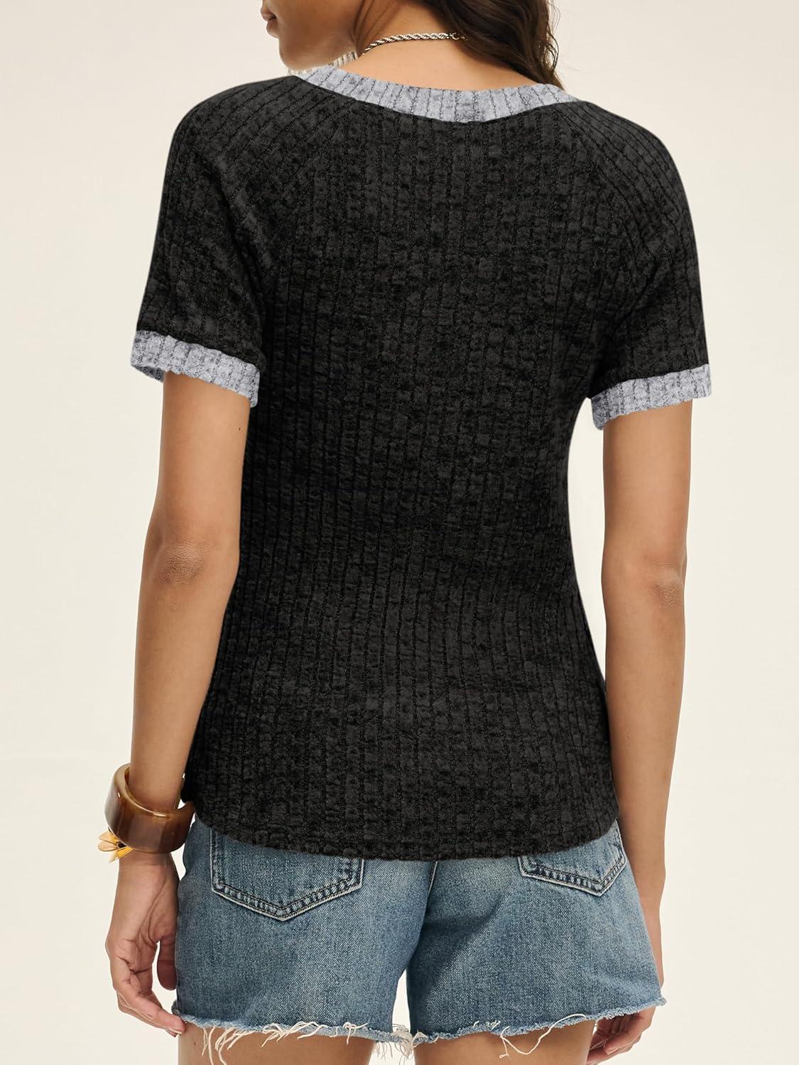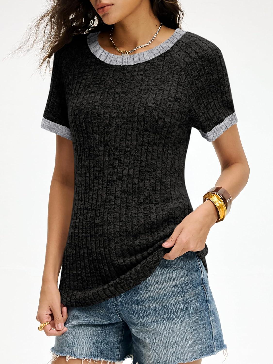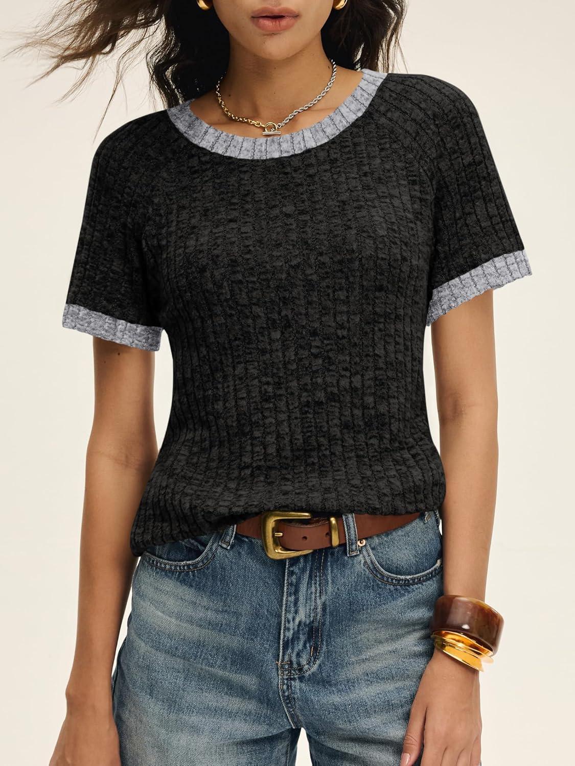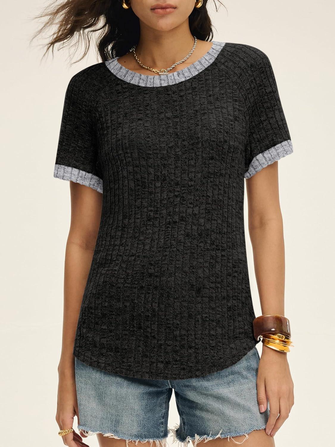 ANRABESS Womens Tops Summer Short Sleeve Shirts Dressy Casual Color Block Work Blouse 2026 Spring Trendy Lightweight Sweater(Black)