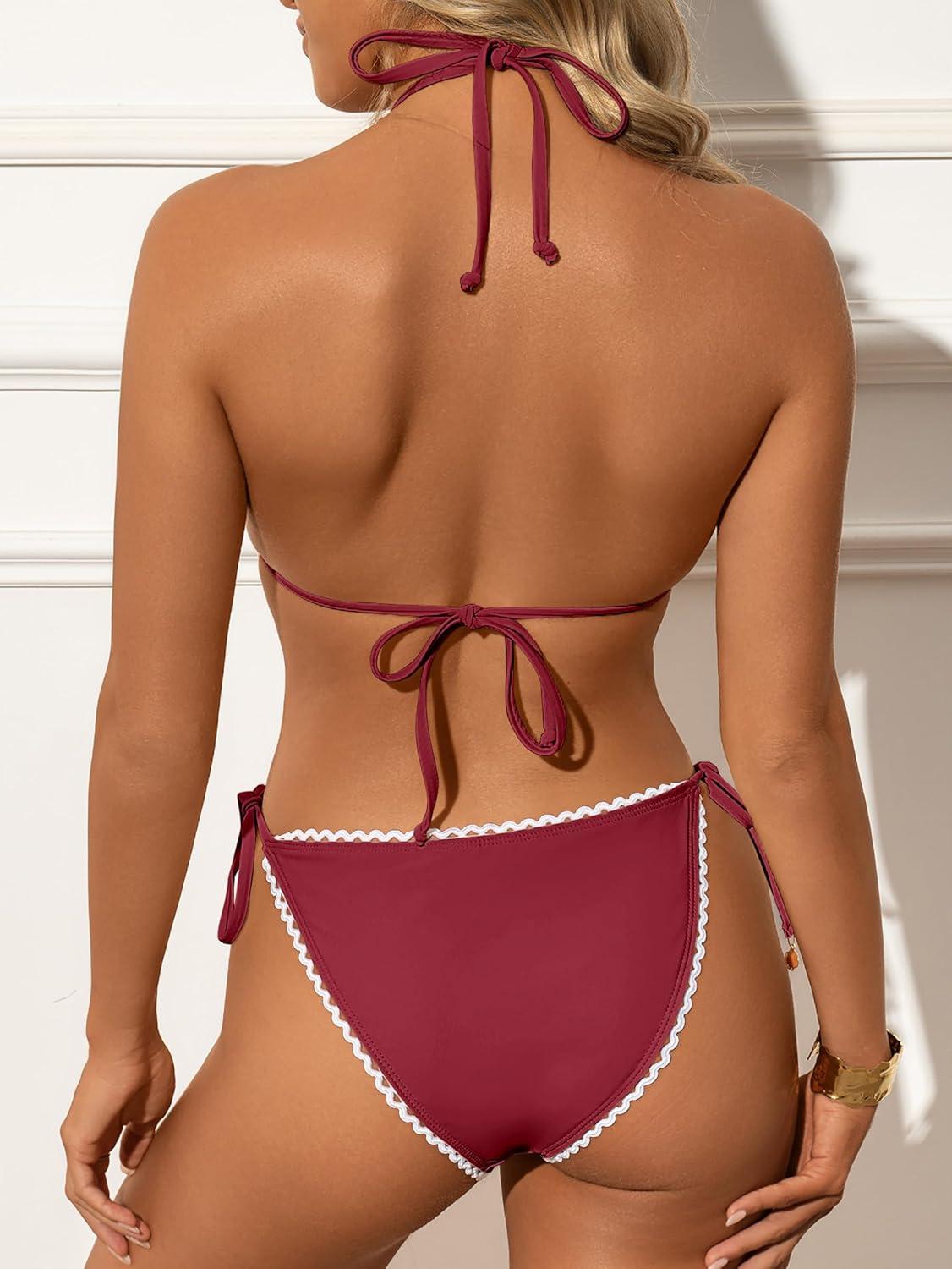 ANRABESS Women's Triangle Bikini Sets Sexy Halter String Two Piece Swimsuits Tie Lace Trim Bathing Suit Trendy Beach Swimwear(Deep Red)