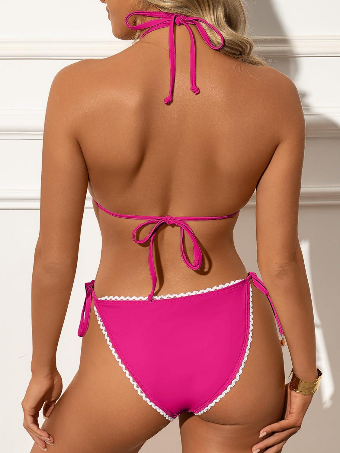 ANRABESS Women's Triangle Bikini Sets Sexy Halter String Two Piece Swimsuits Tie Lace Trim Bathing Suit Trendy Beach Swimwear(Hot Pink)