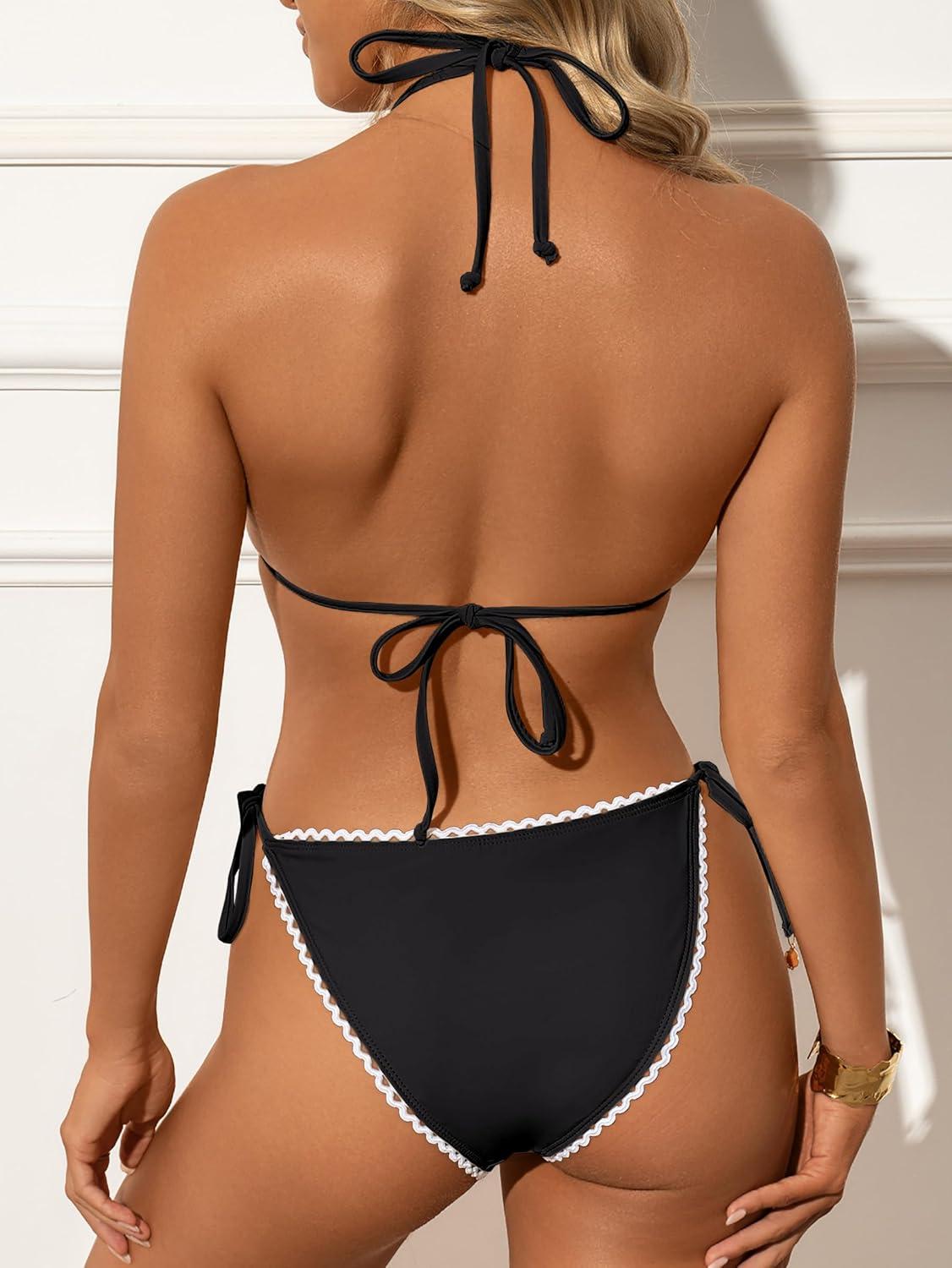 ANRABESS Women's Triangle Bikini Sets Sexy Halter String Two Piece Swimsuits Tie Lace Trim Bathing Suit Trendy Beach Swimwear(Lily Flowers Black)