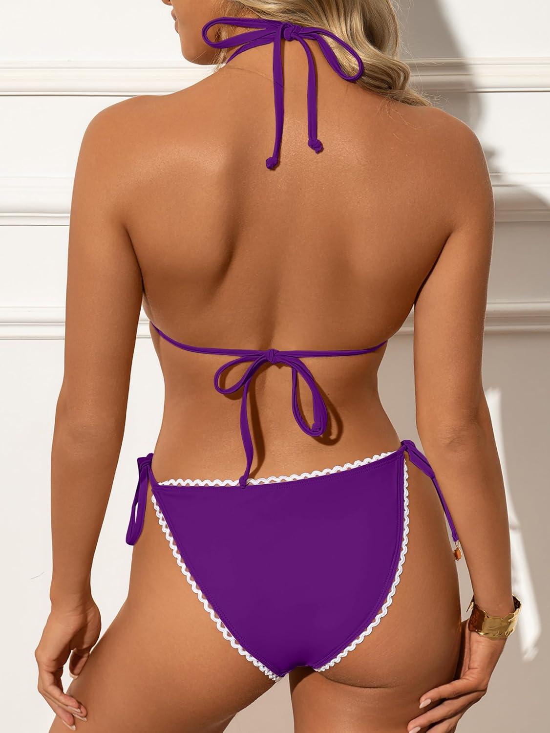 ANRABESS Women's Triangle Bikini Sets Sexy Halter String Two Piece Swimsuits Tie Lace Trim Bathing Suit Trendy Beach Swimwear(Purple)