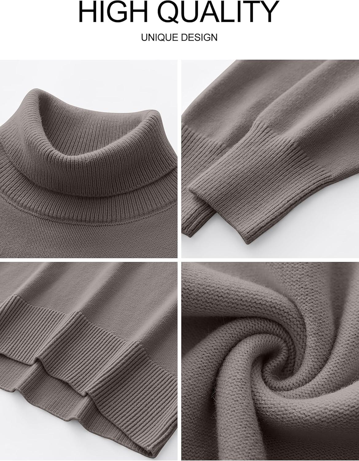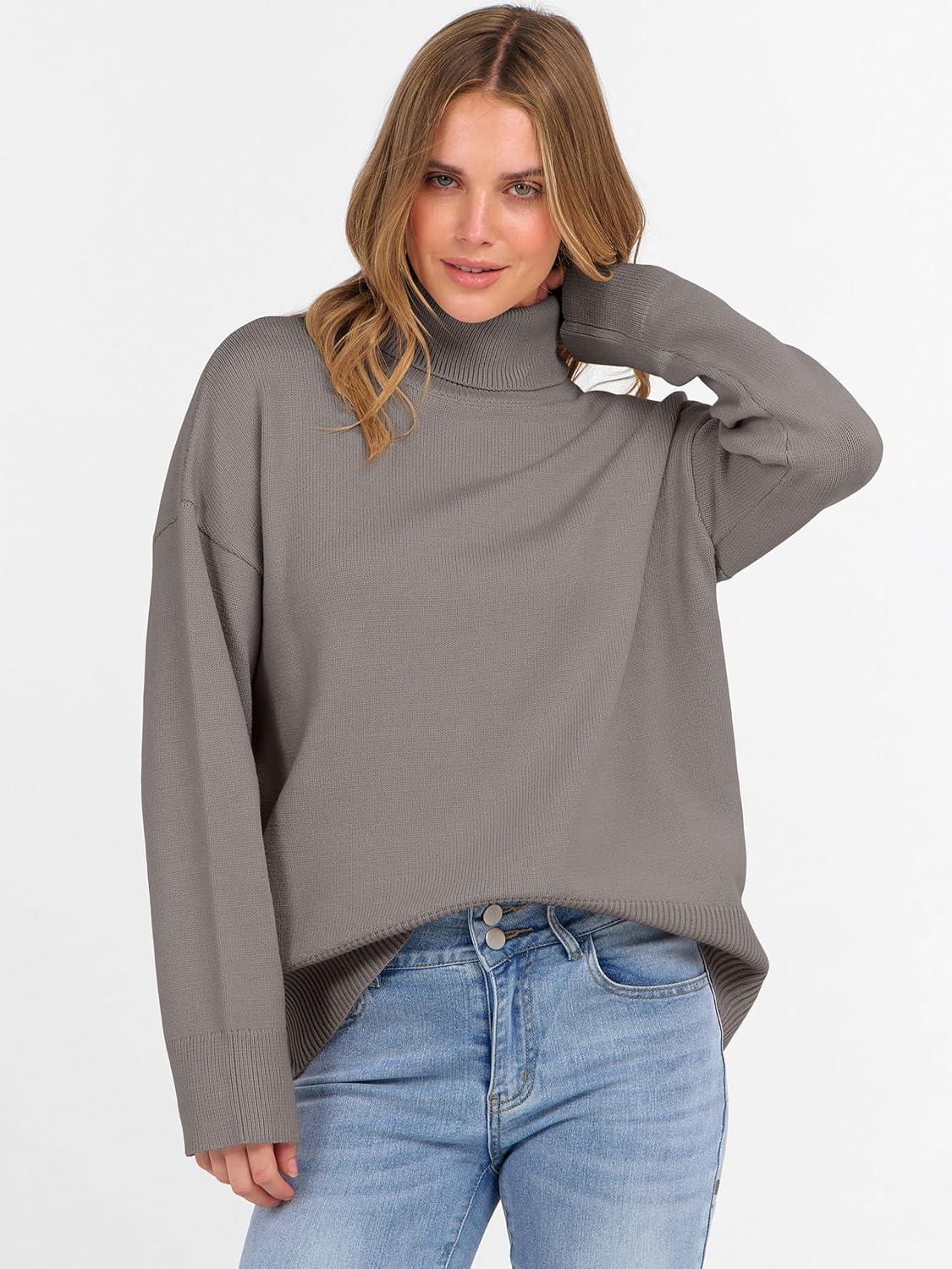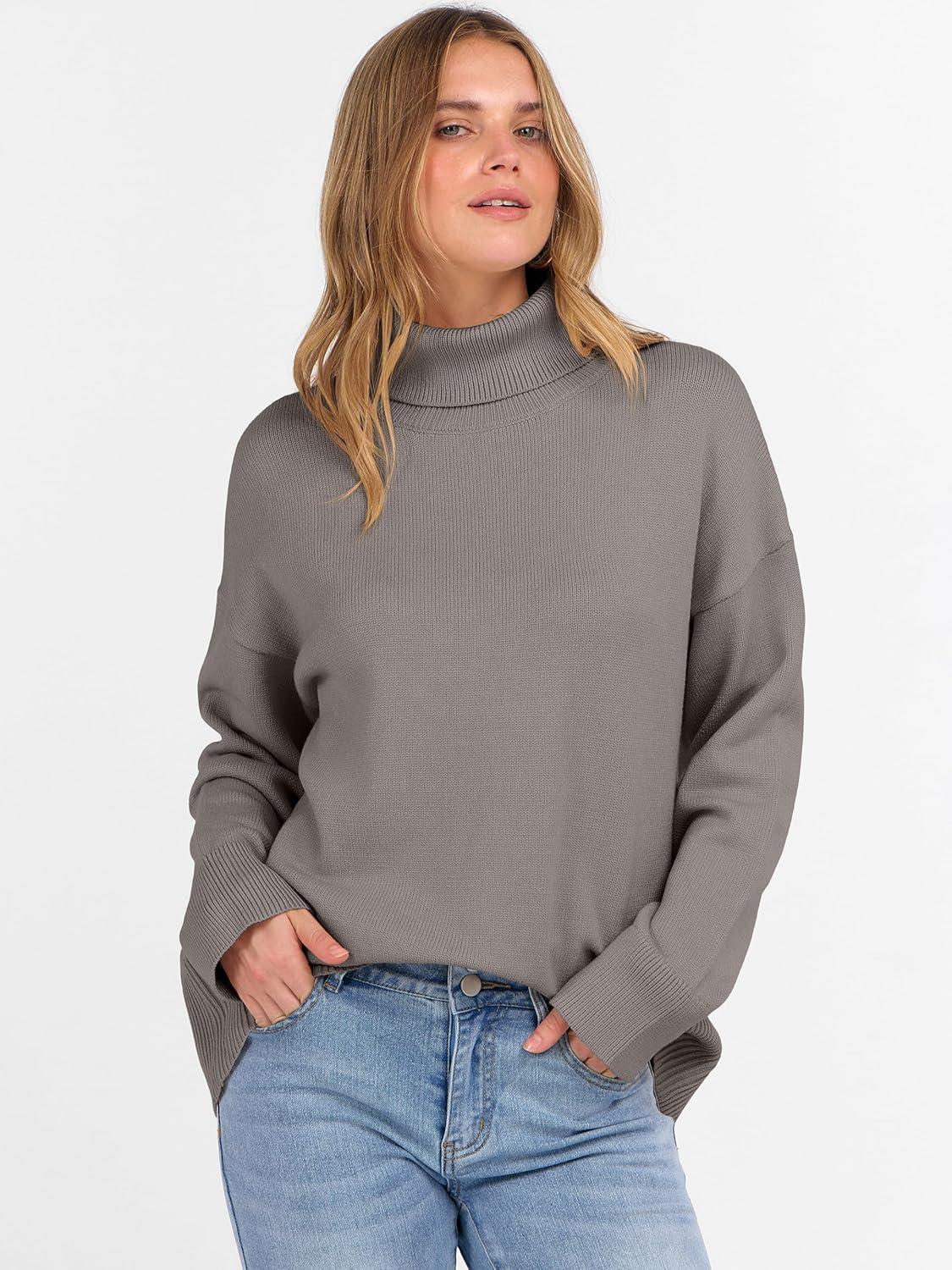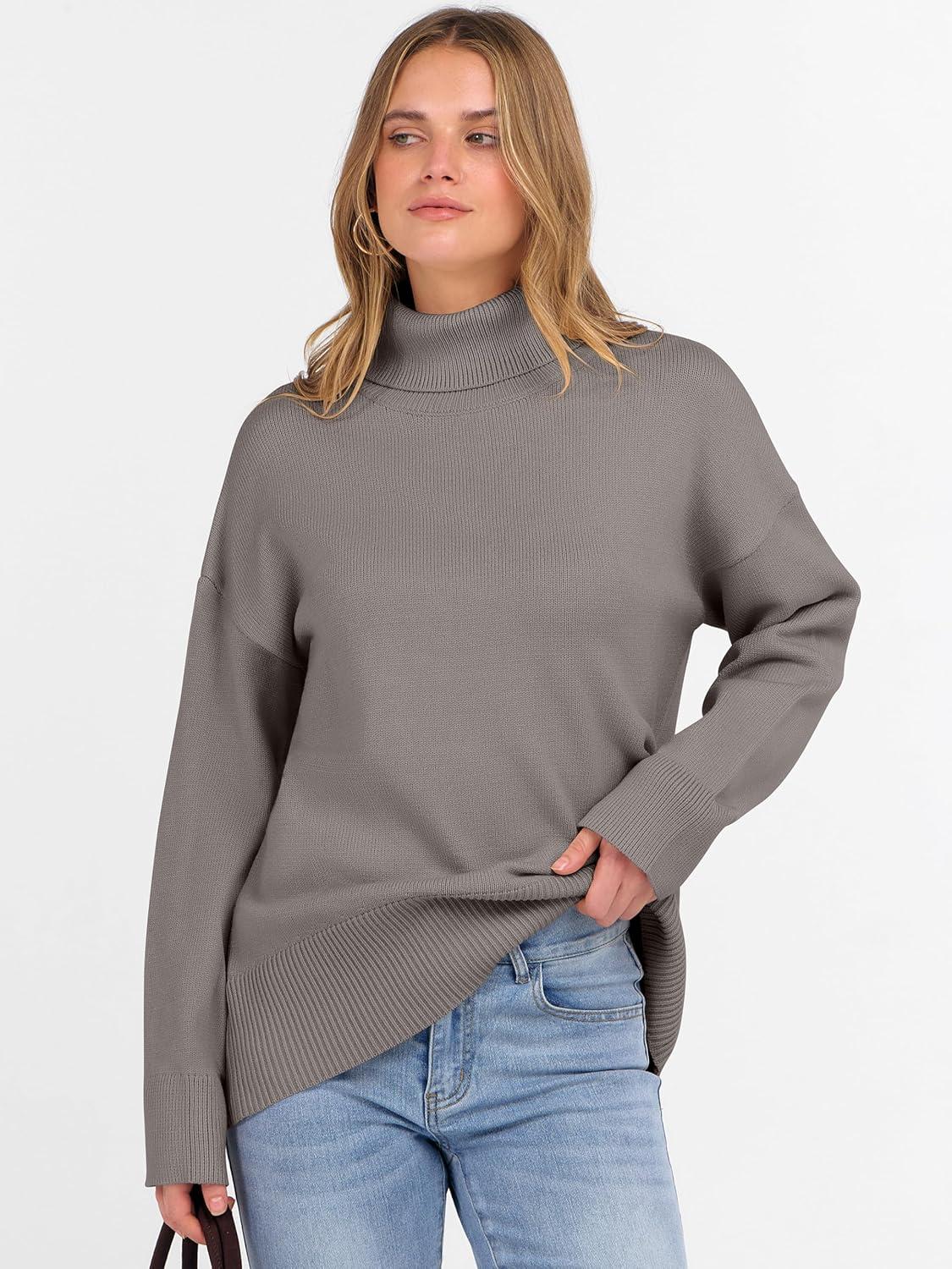 ANRABESS Womens Turtleneck Sweaters Oversized Chunky Long Sleeve Knit High Low Hem Pullover Top 2026 Fall Winter Fashion(Grey Khaki)