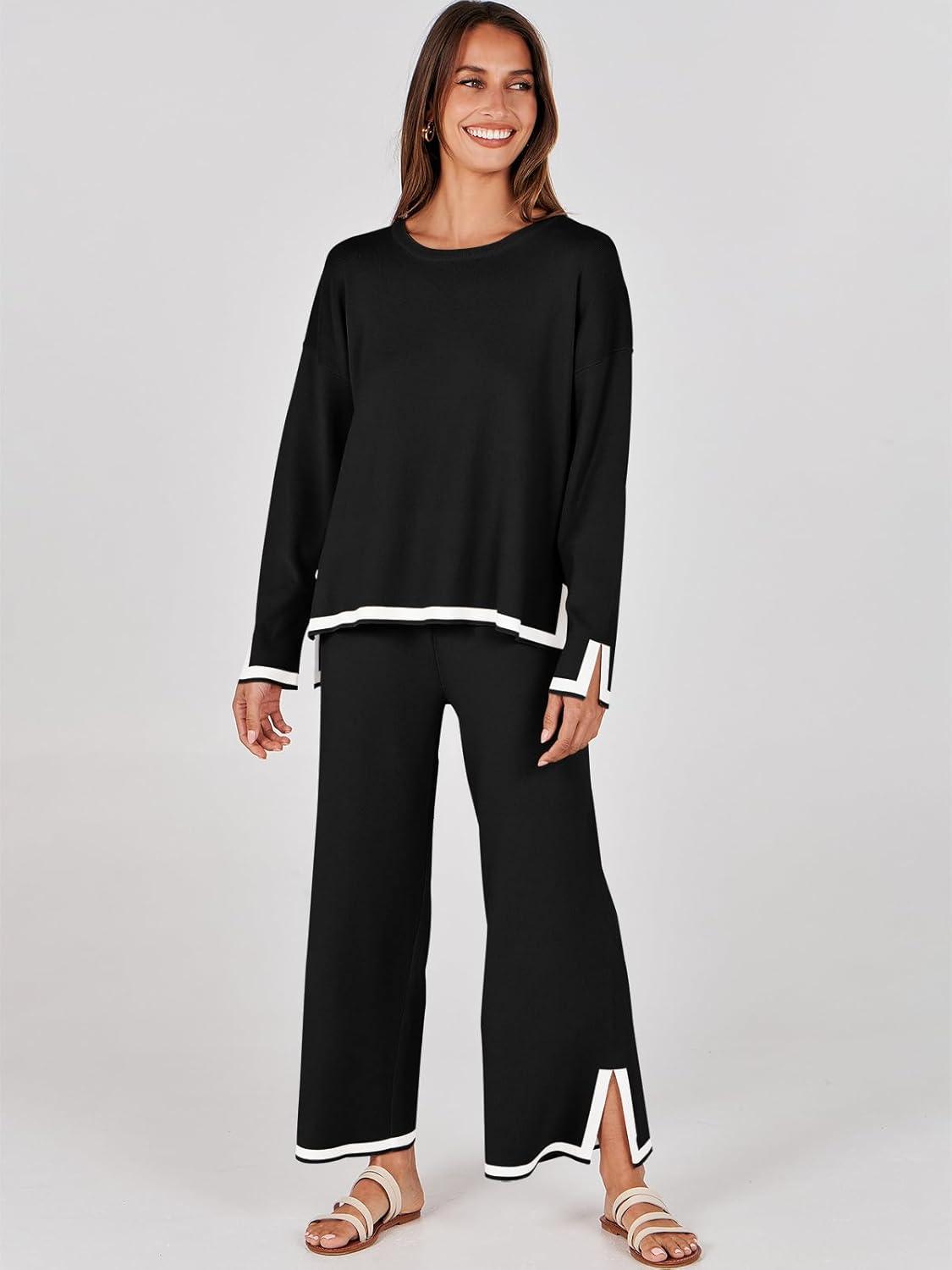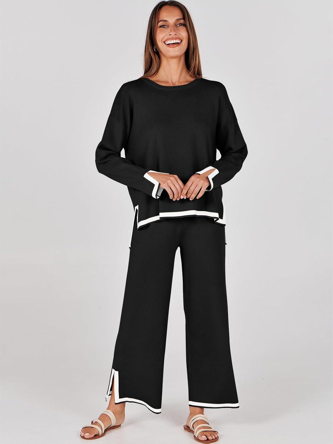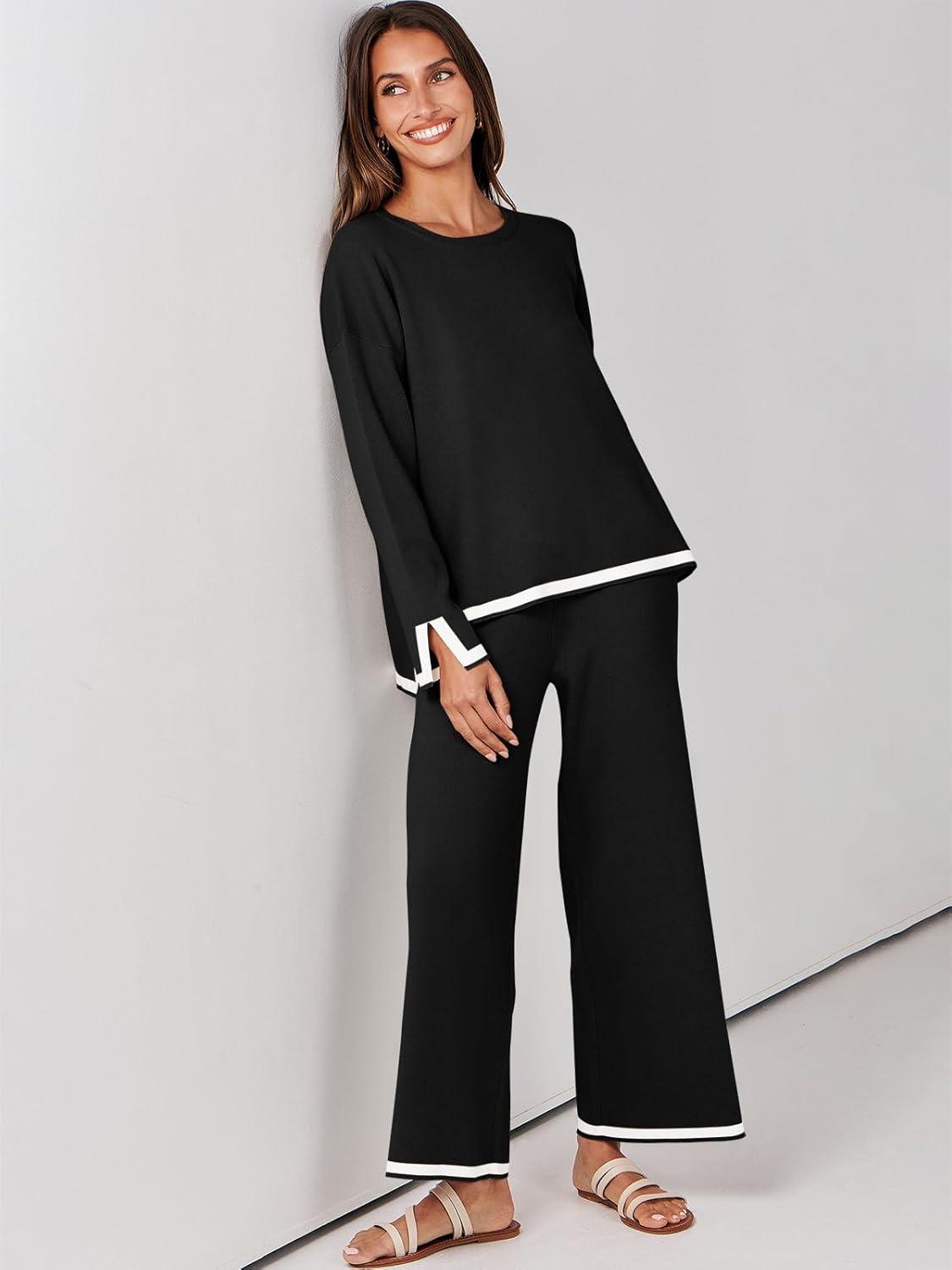 ANRABESS Women’s Two Piece Outfits Knit Pullover Sweater Tops & Wide leg Pants Lounge Matching Sweatsuit Tracksuits Sets(Black)