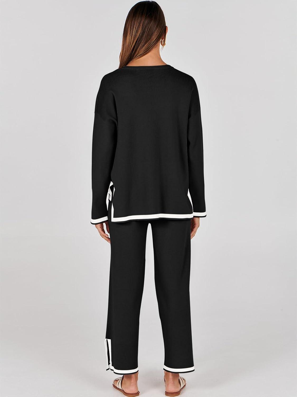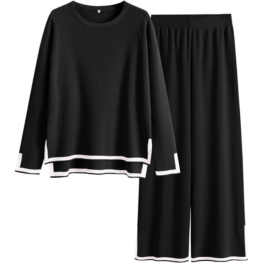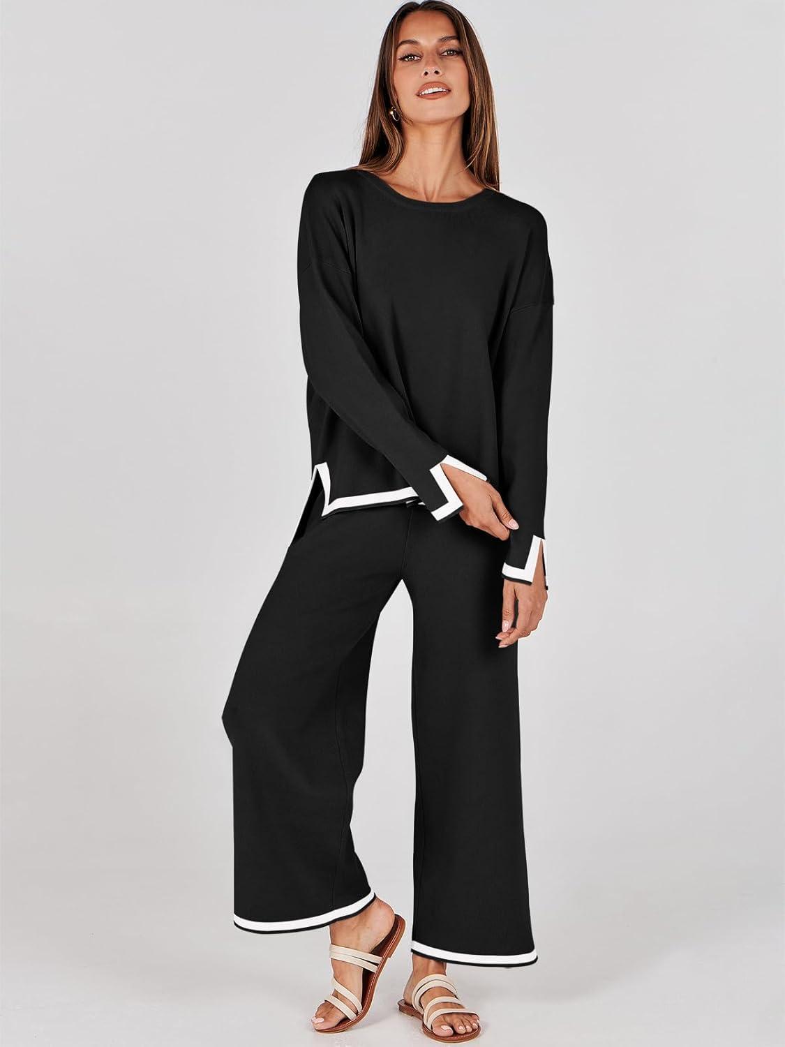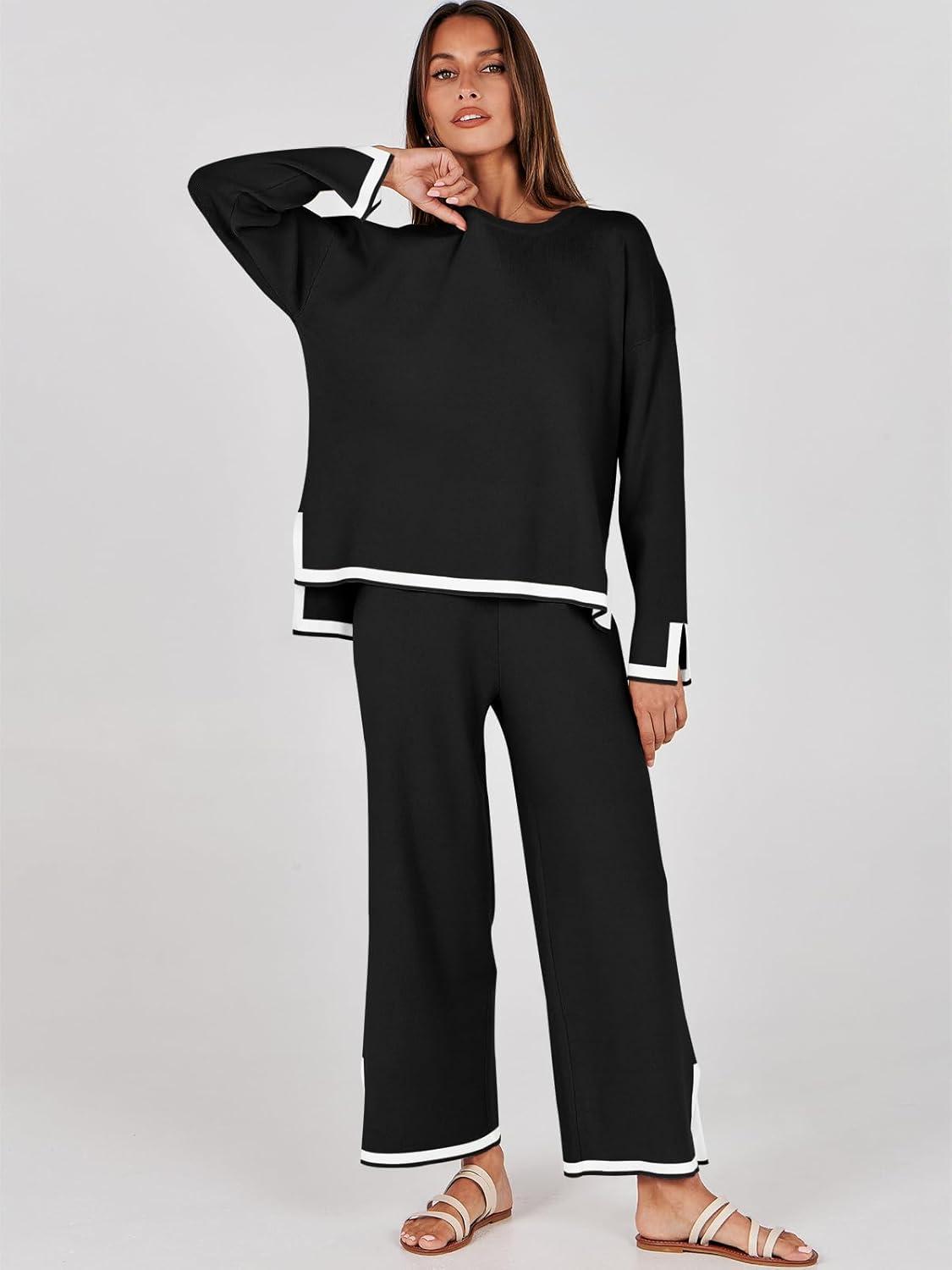 ANRABESS Women’s Two Piece Outfits Knit Pullover Sweater Tops & Wide leg Pants Lounge Matching Sweatsuit Tracksuits Sets(Black)