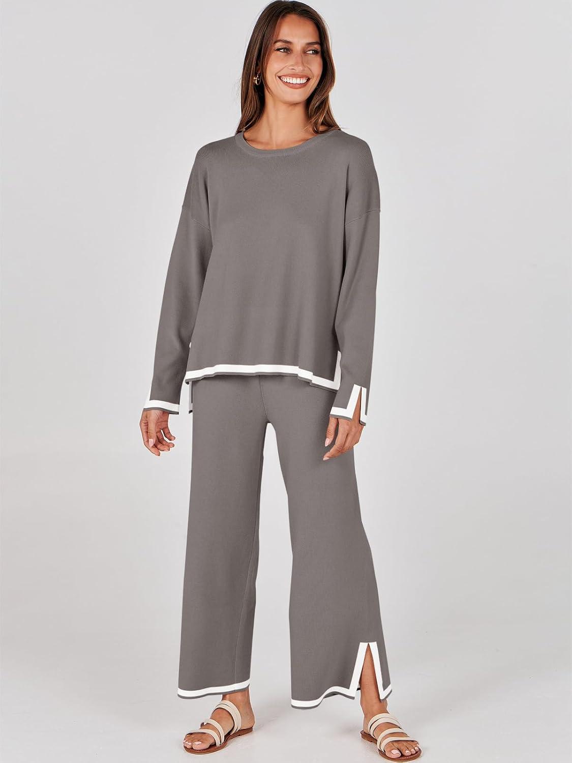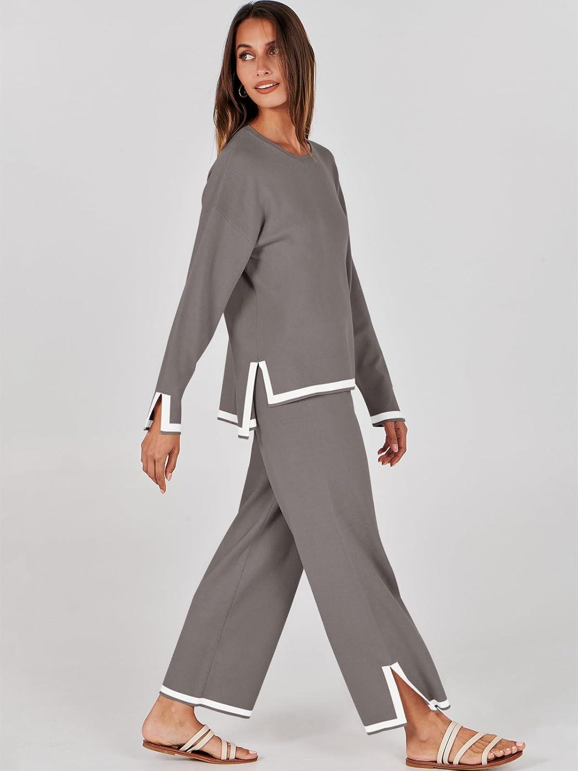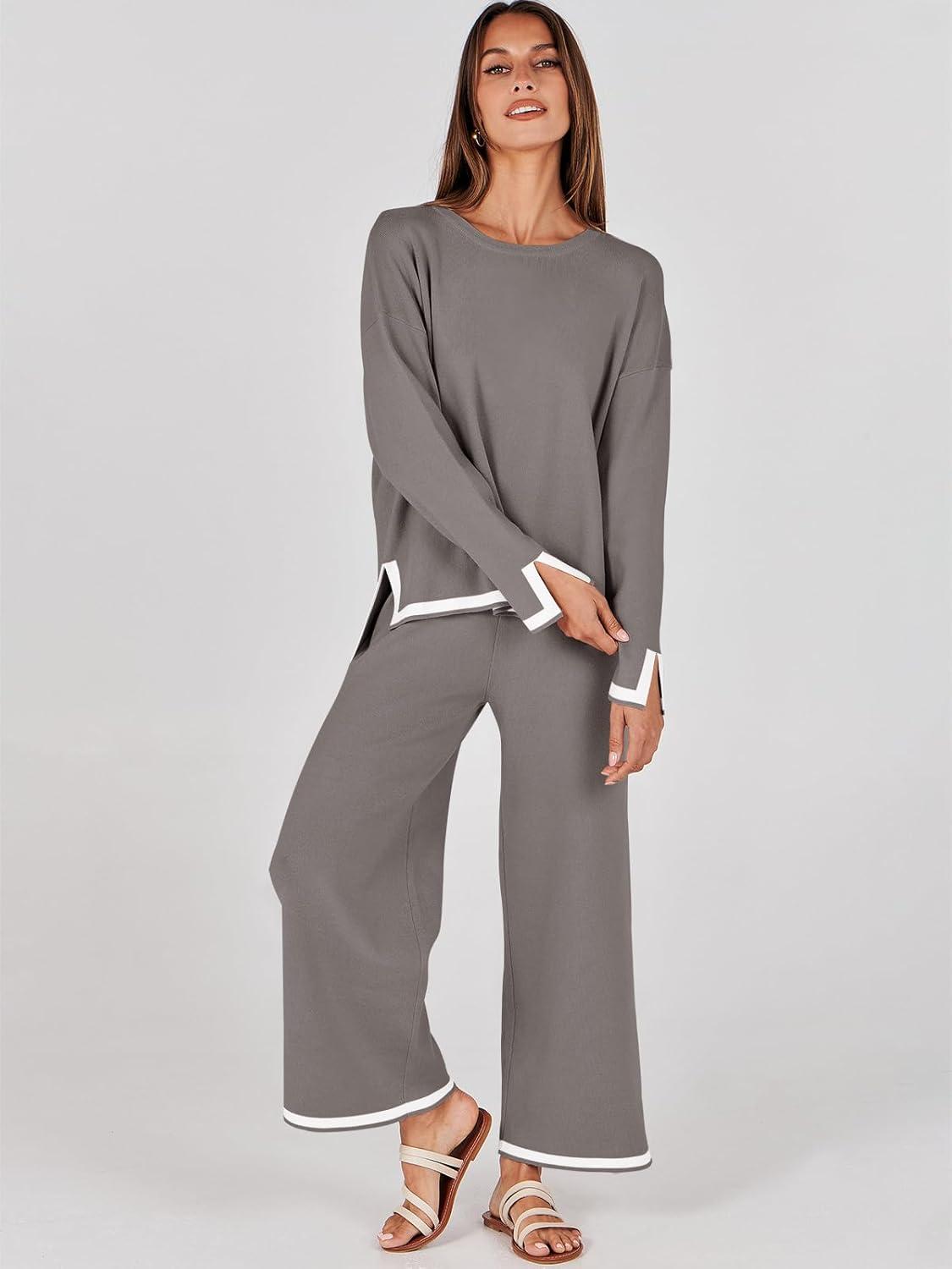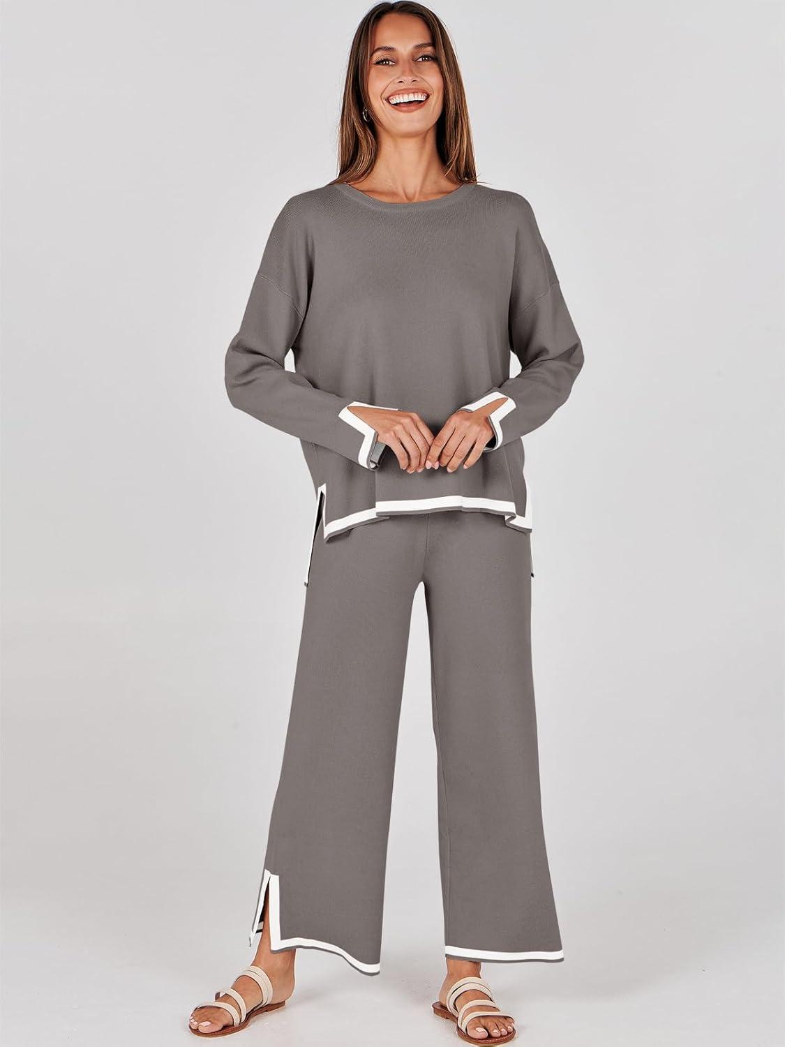 ANRABESS Women’s Two Piece Outfits Knit Pullover Sweater Tops & Wide leg Pants Lounge Matching Sweatsuit Tracksuits Sets(Grey)