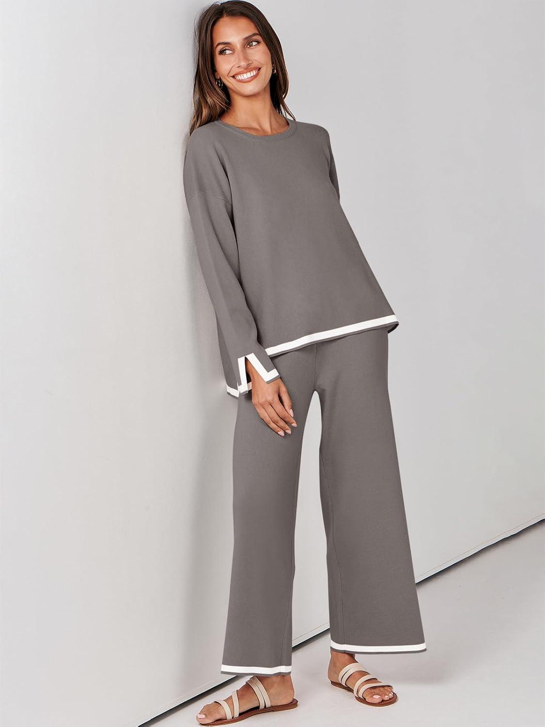 imageANRABESS Womens Two Piece Outfits Knit Pullover Sweater Tops ampamp Wide leg Pants Lounge Matching Sweatsuit Tracksuits SetsGrey