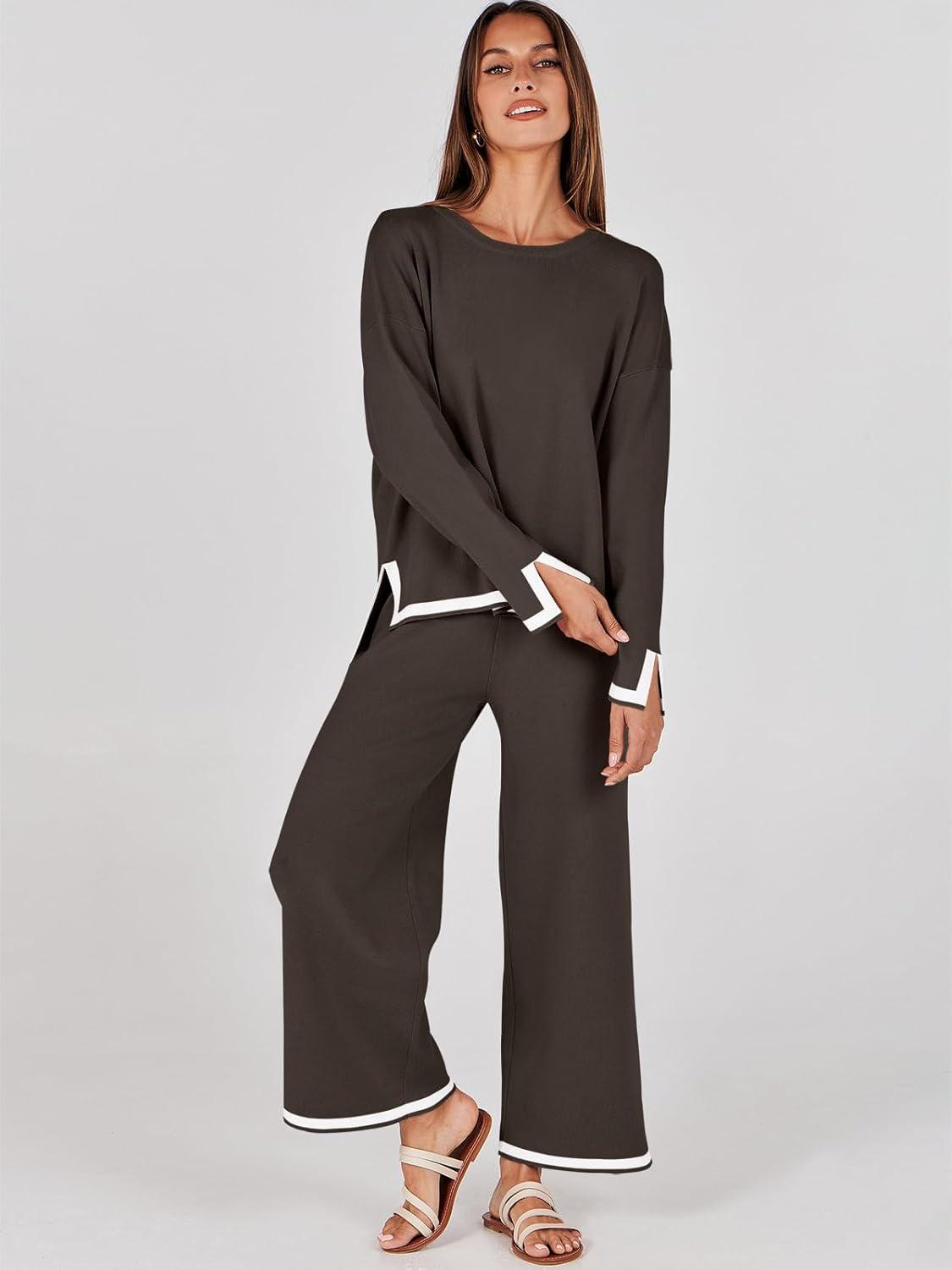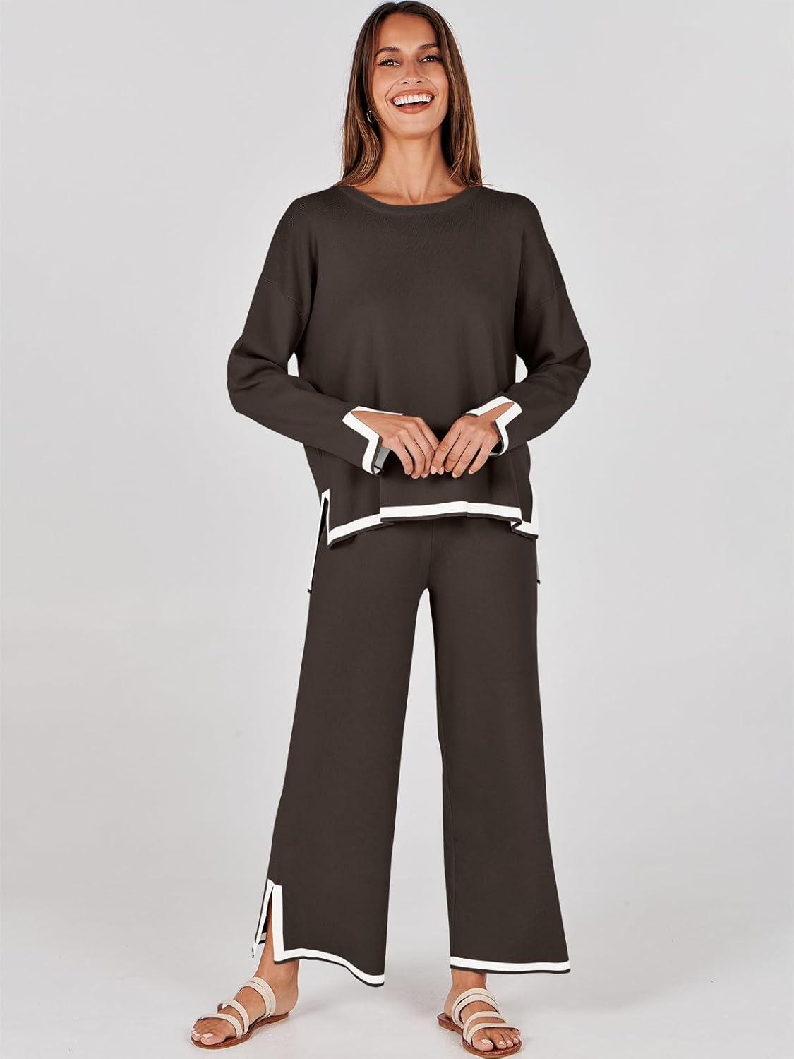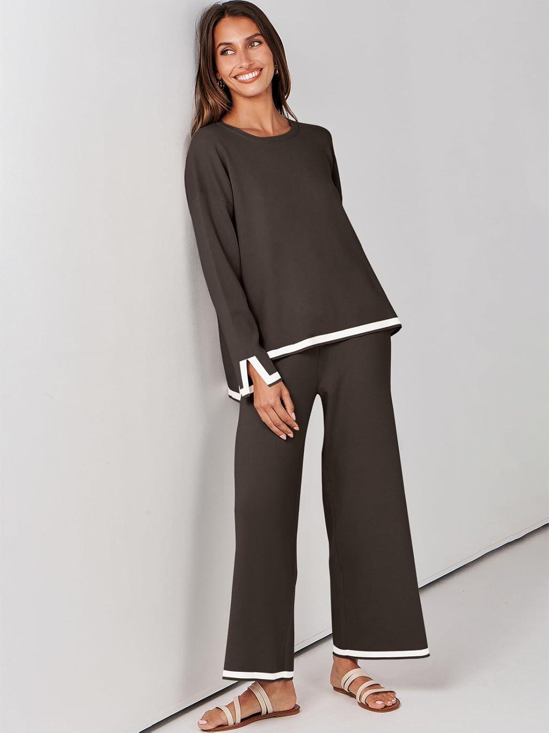 ANRABESS Women’s Two Piece Outfits Knit Pullover Sweater Tops & Wide leg Pants Lounge Matching Sweatsuit Tracksuits Sets(Coffee Grey)