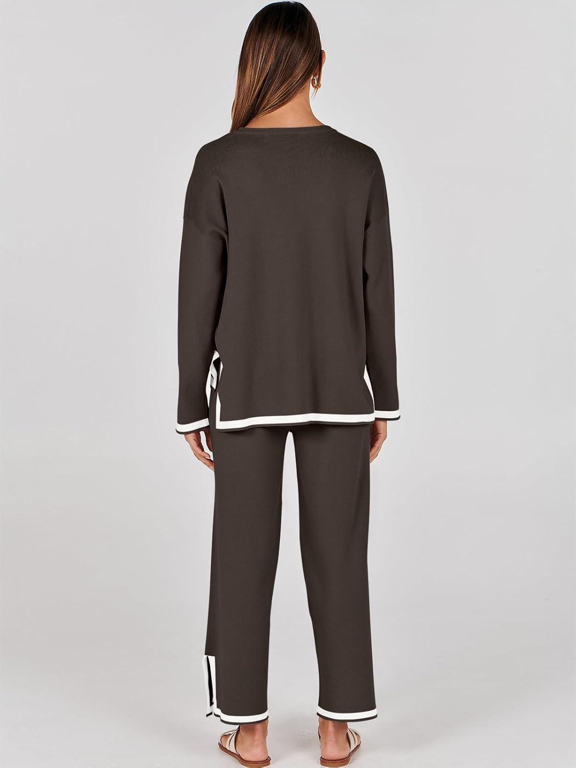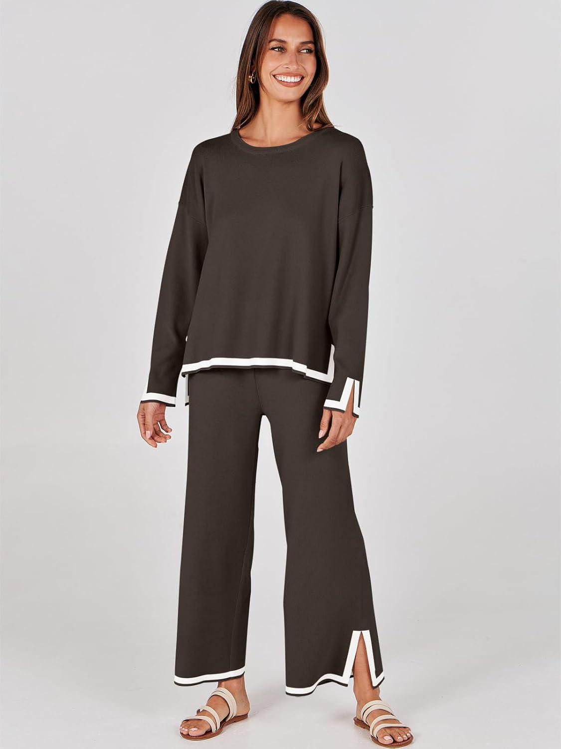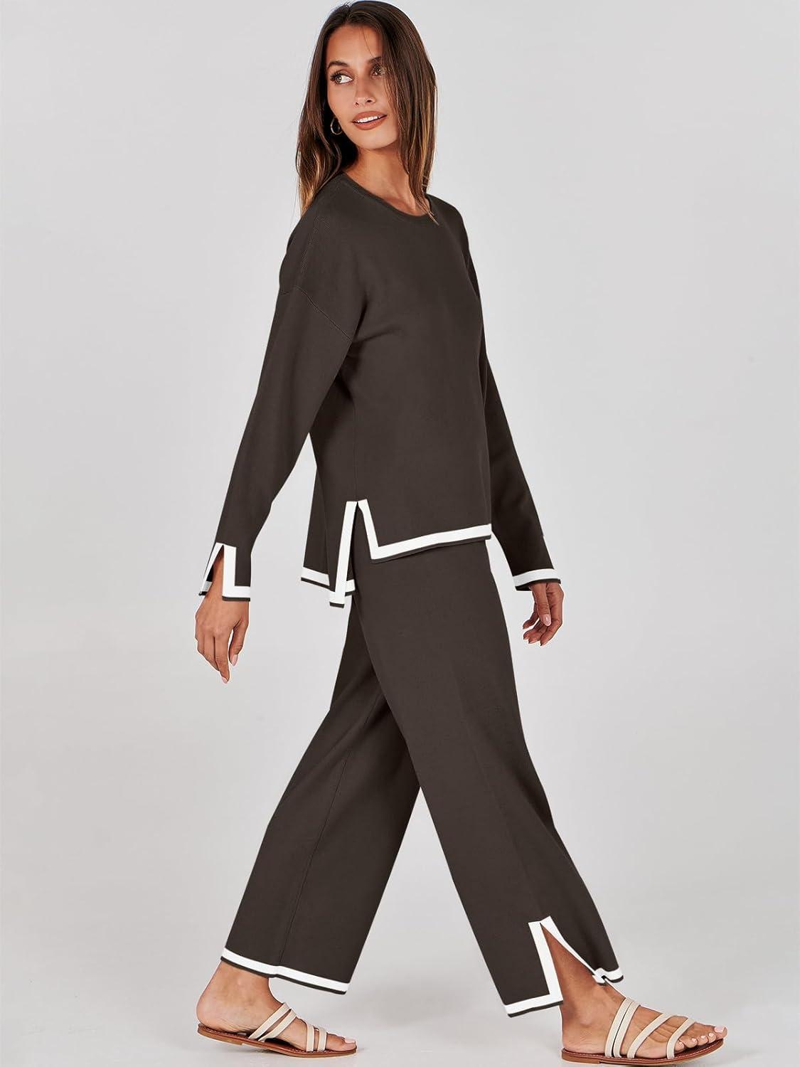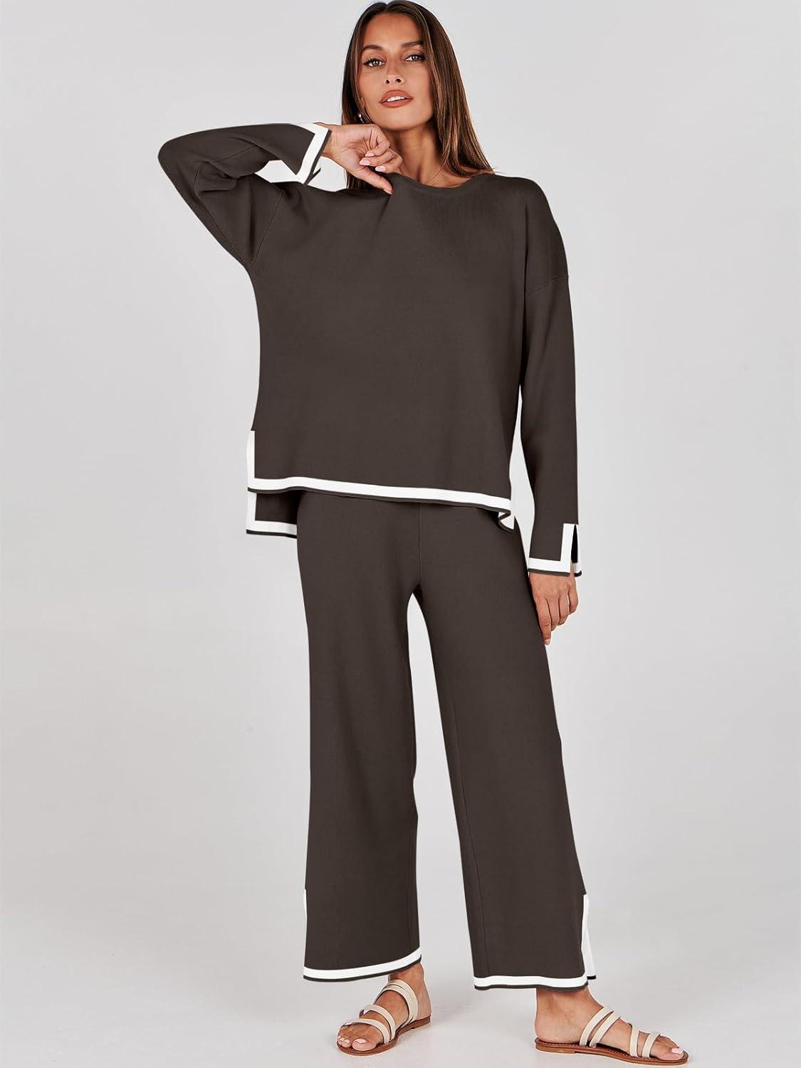 ANRABESS Women’s Two Piece Outfits Knit Pullover Sweater Tops & Wide leg Pants Lounge Matching Sweatsuit Tracksuits Sets(Coffee Grey)
