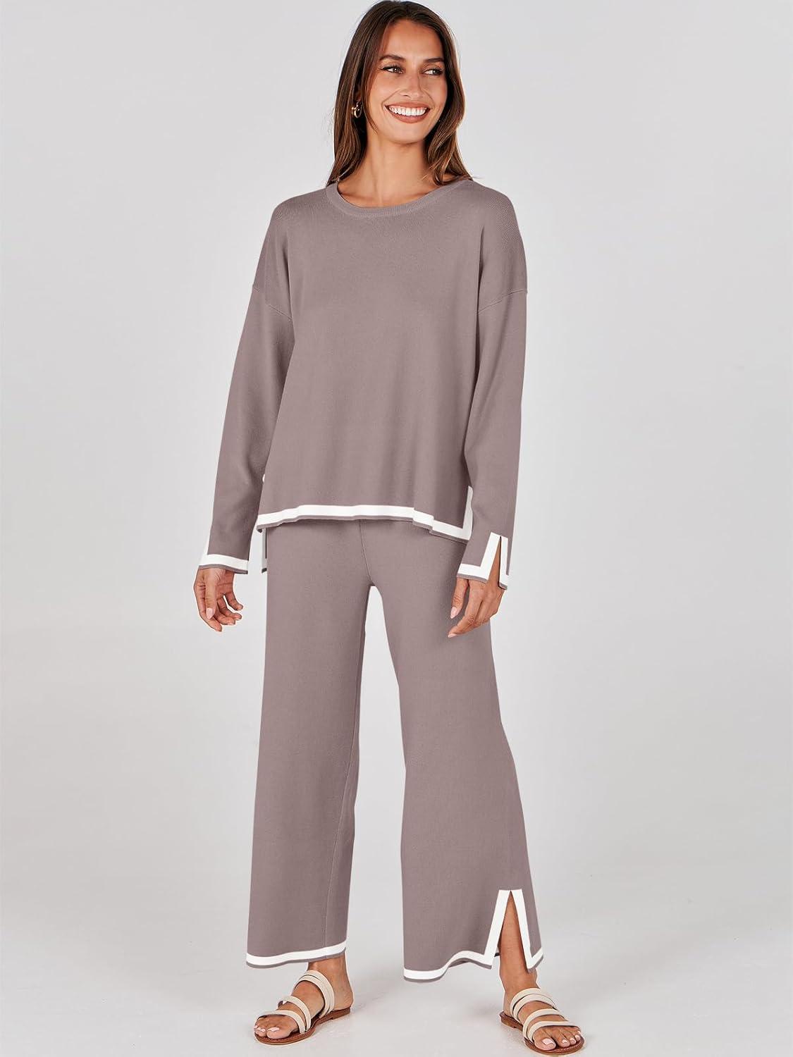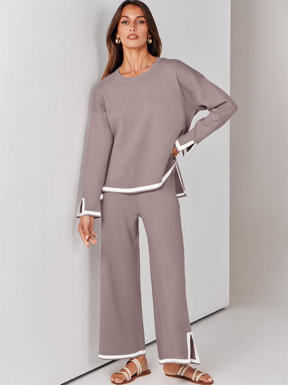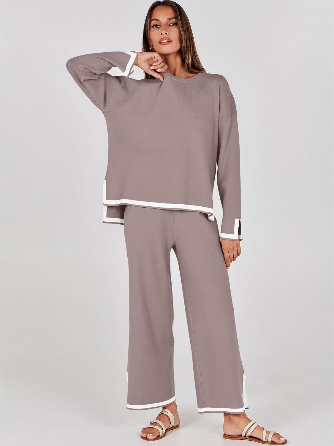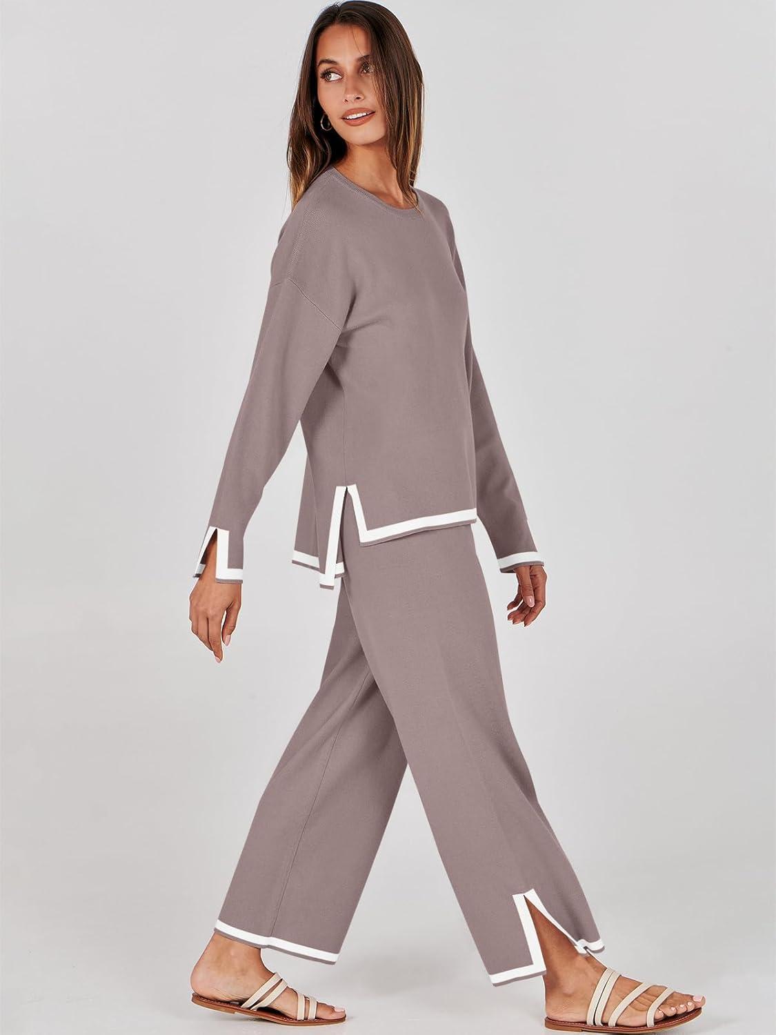 imageANRABESS Womens Two Piece Outfits Knit Pullover Sweater Tops ampamp Wide leg Pants Lounge Matching Sweatsuit Tracksuits SetsGrey