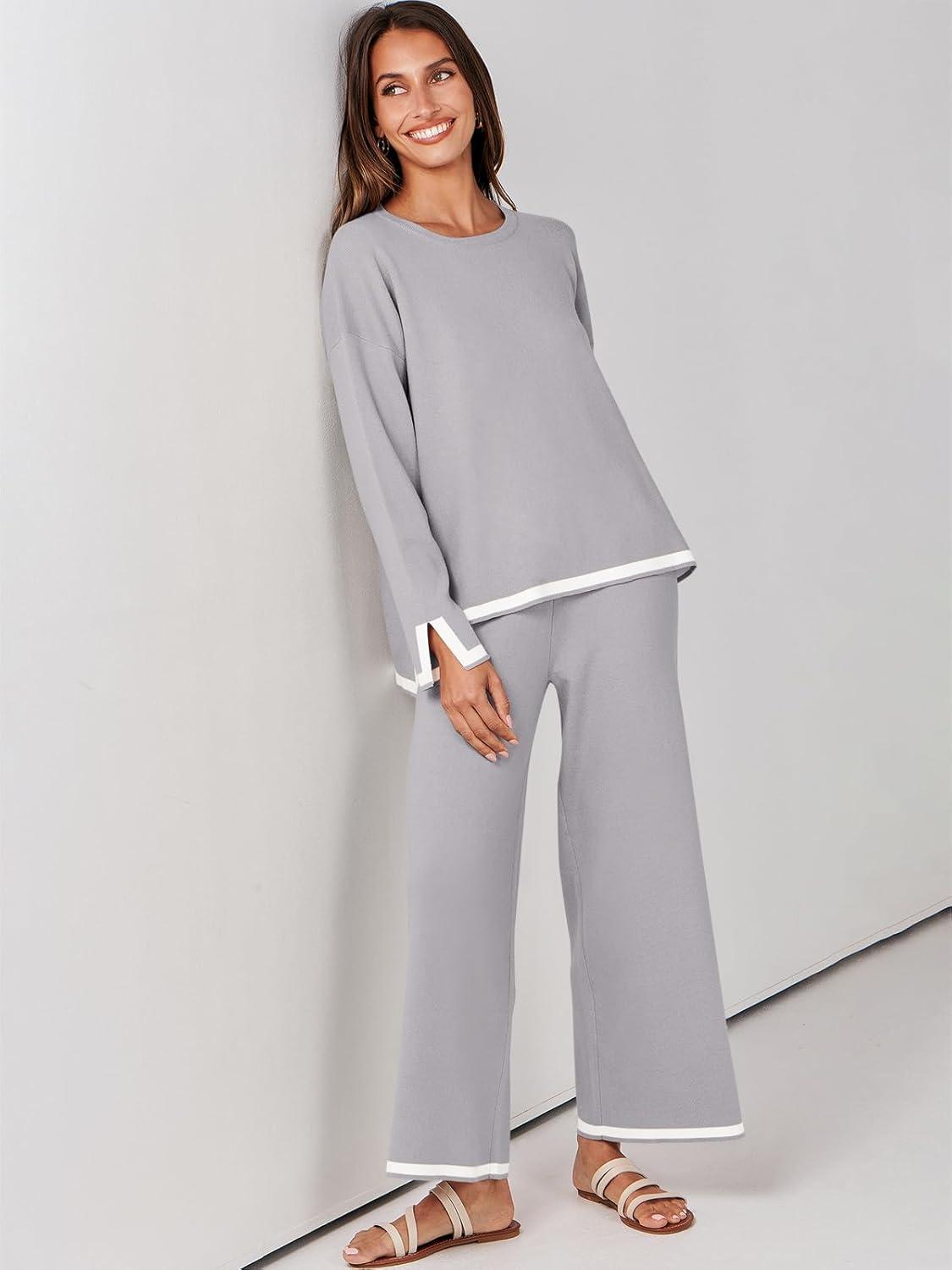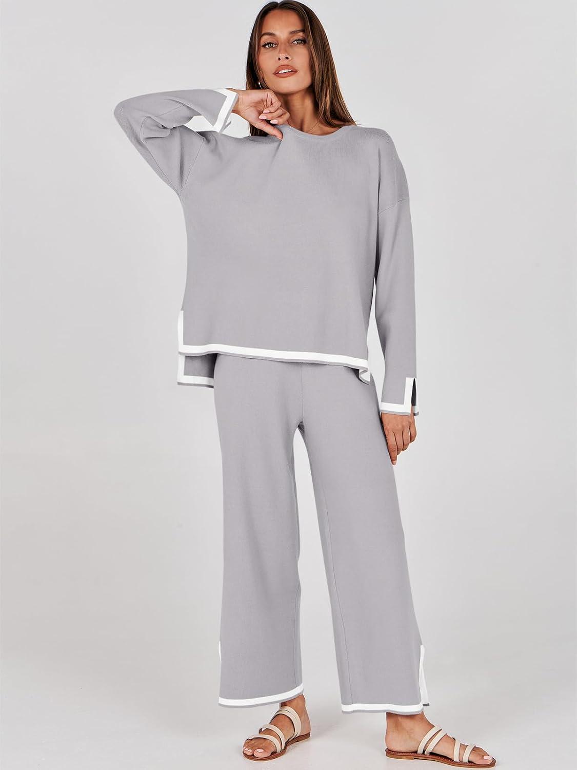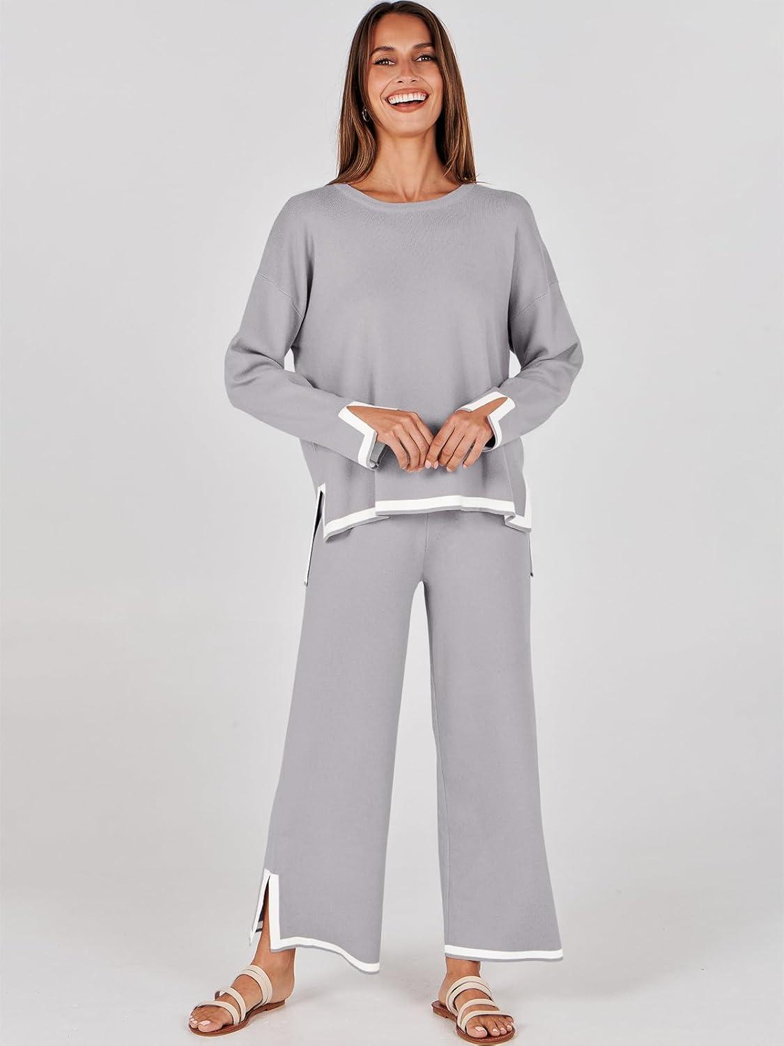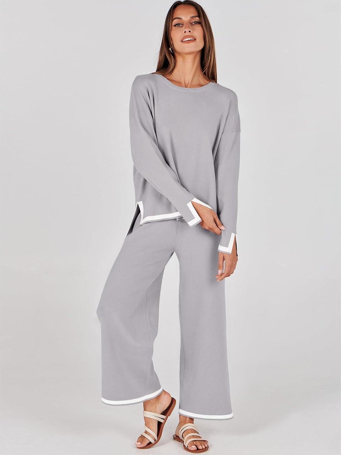 ANRABESS Women's Two Piece Outfits Knit Pullover Sweater Tops & Wide leg Pants Lounge Matching Sweatsuit Tracksuits Sets(Silver Grey)
