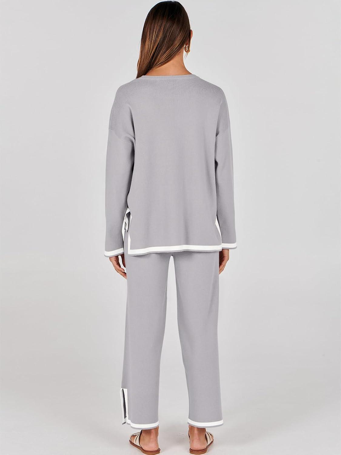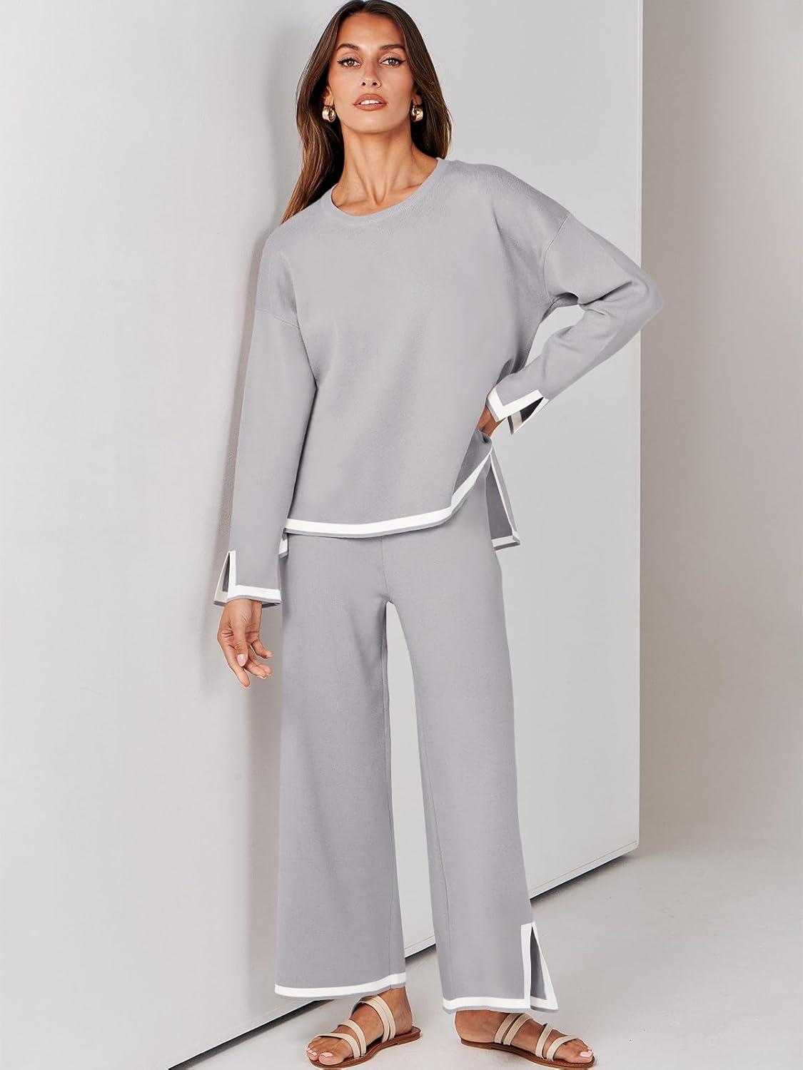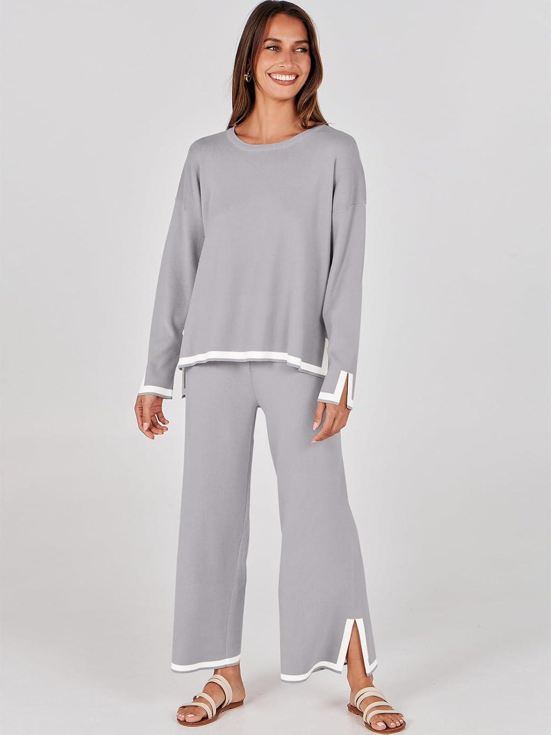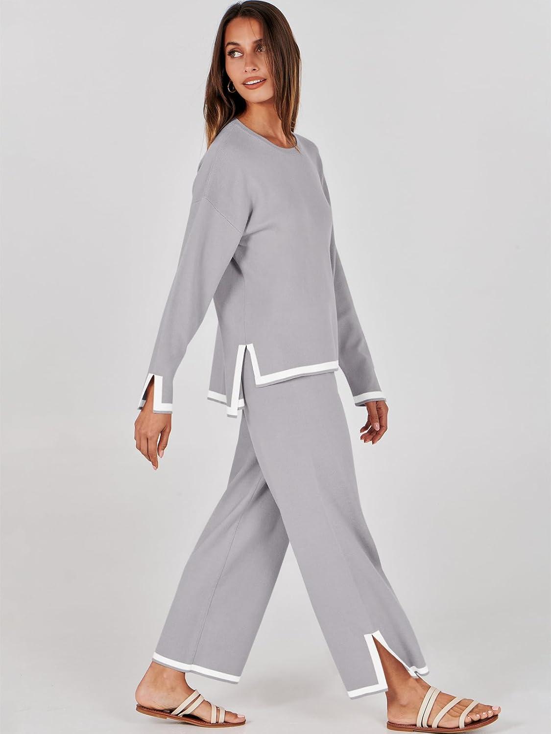 ANRABESS Women's Two Piece Outfits Knit Pullover Sweater Tops & Wide leg Pants Lounge Matching Sweatsuit Tracksuits Sets(Silver Grey)