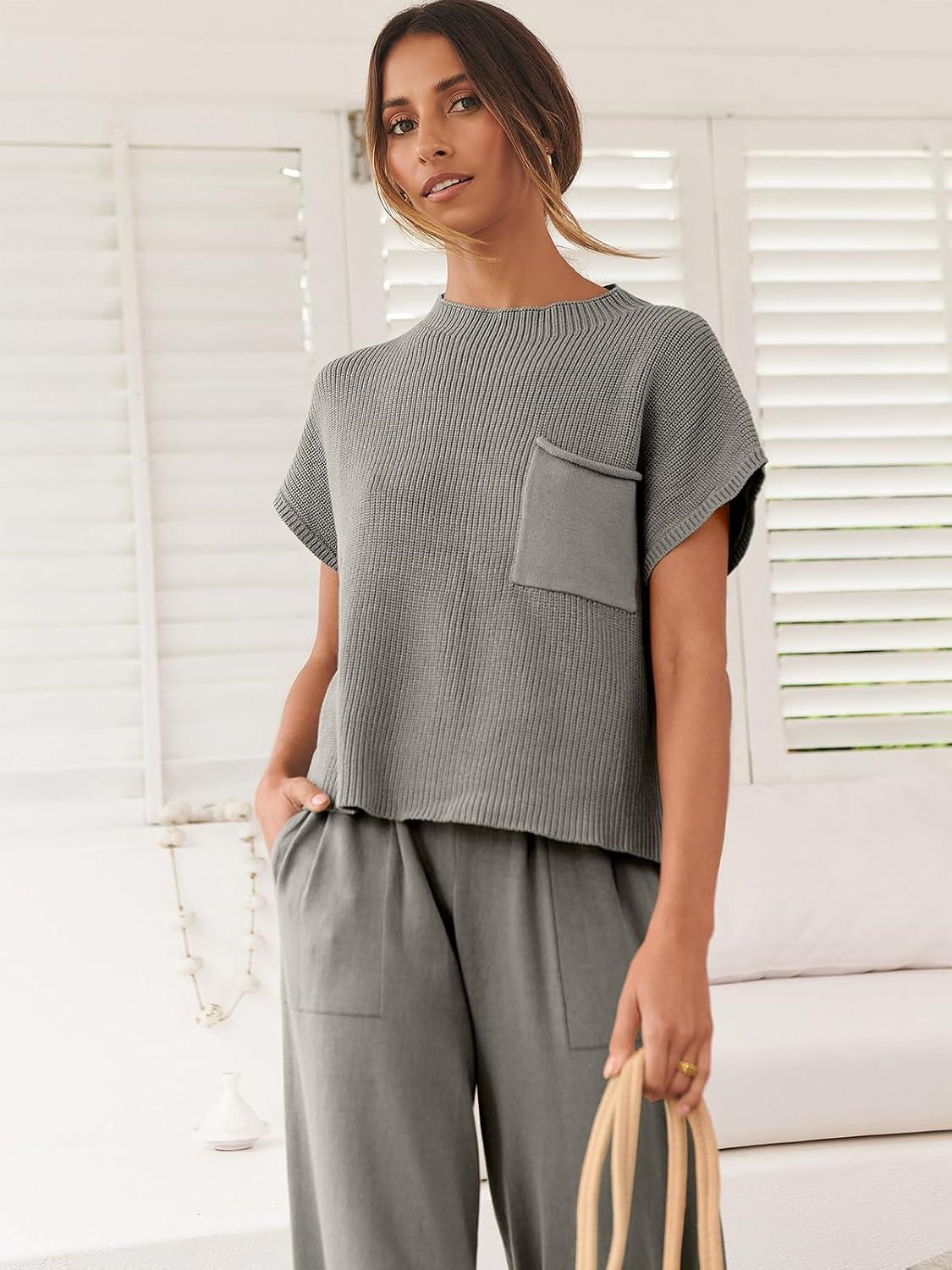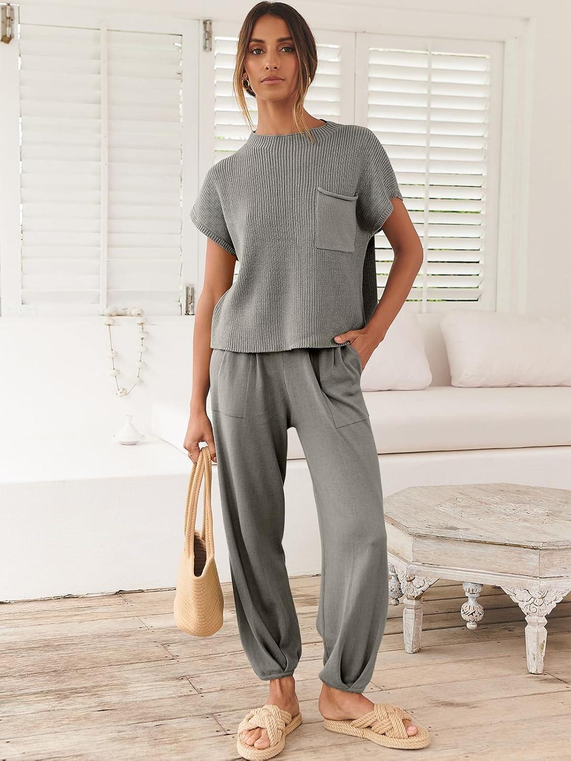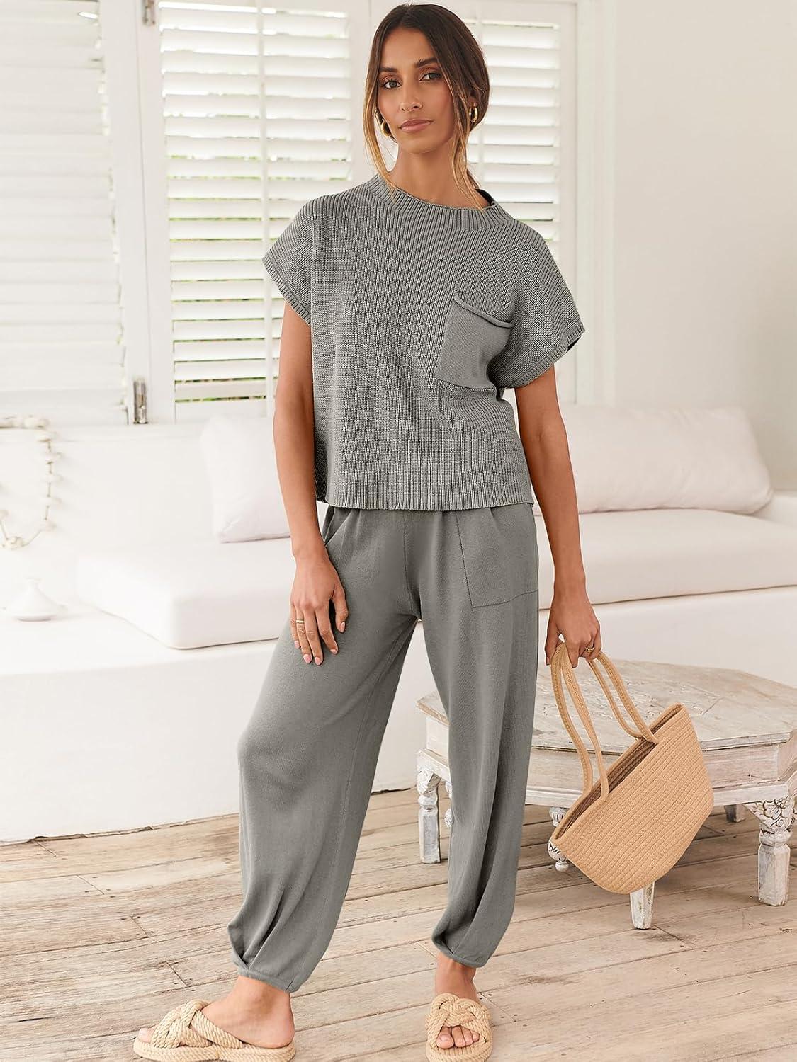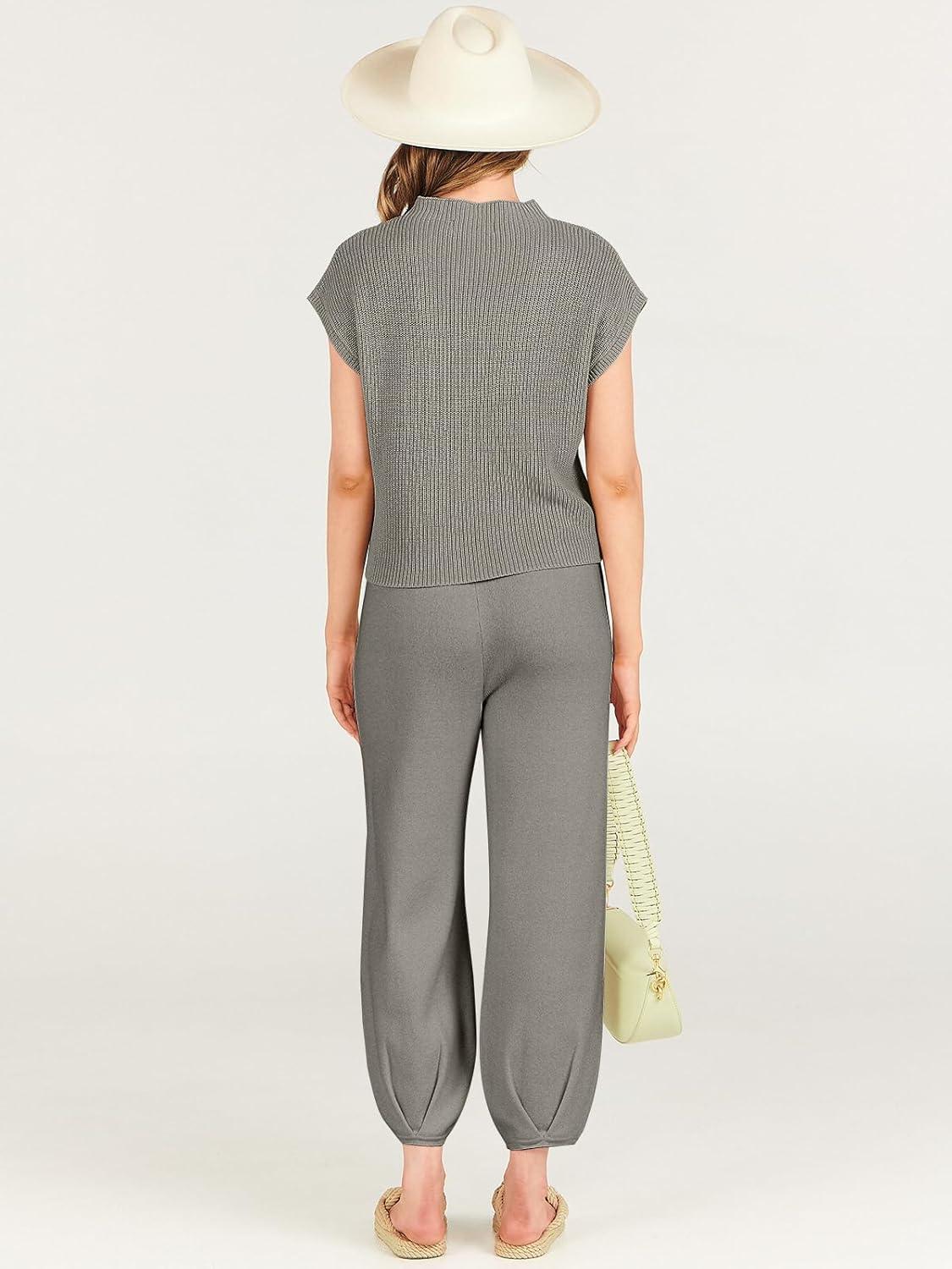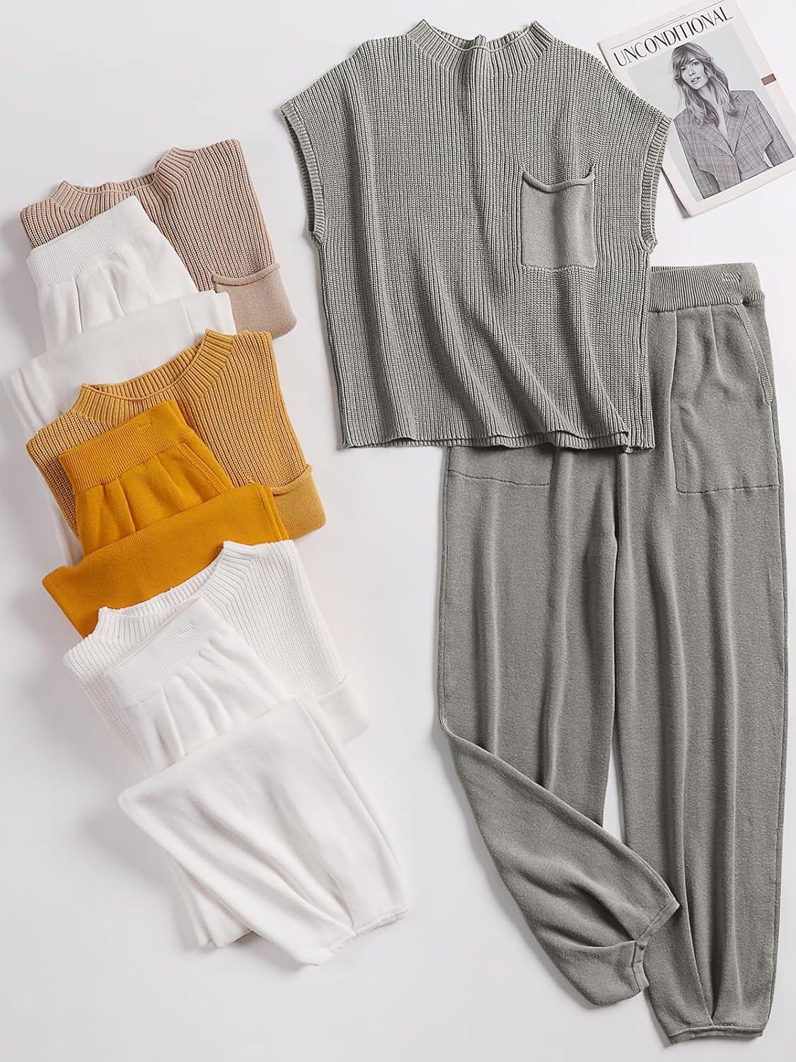 ANRABESS Women's Two Piece Outfits Knit Sweater Vest Crop Top Pants Lounge Matching Tracksuit Sweatsuit Travel Clothes Sets(Grey)