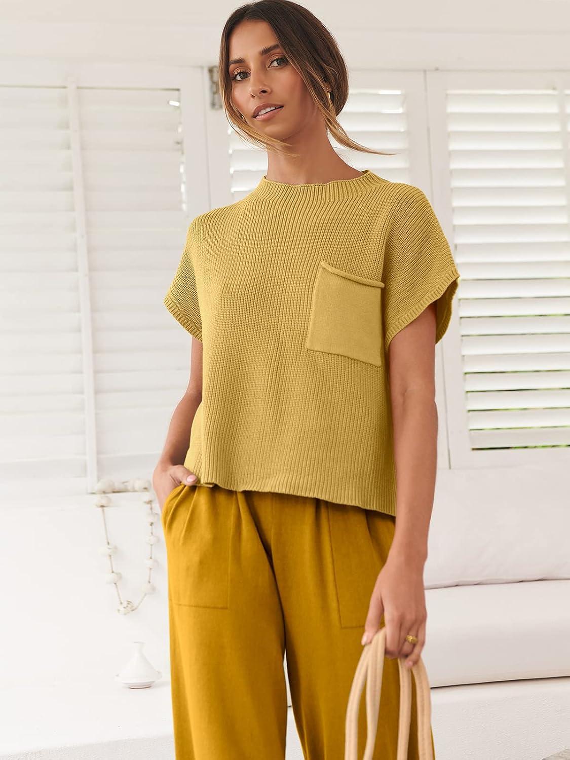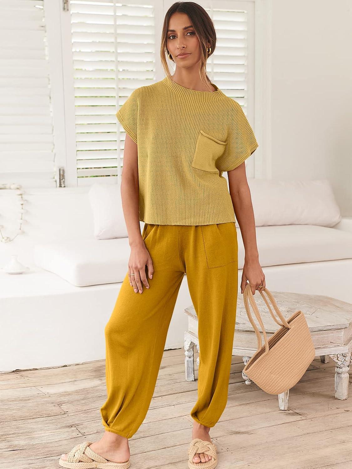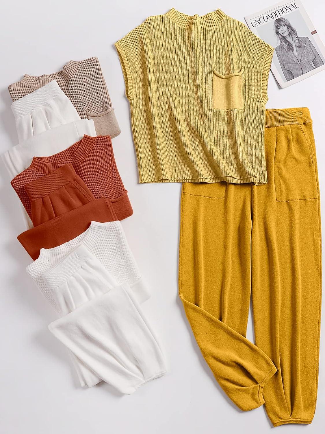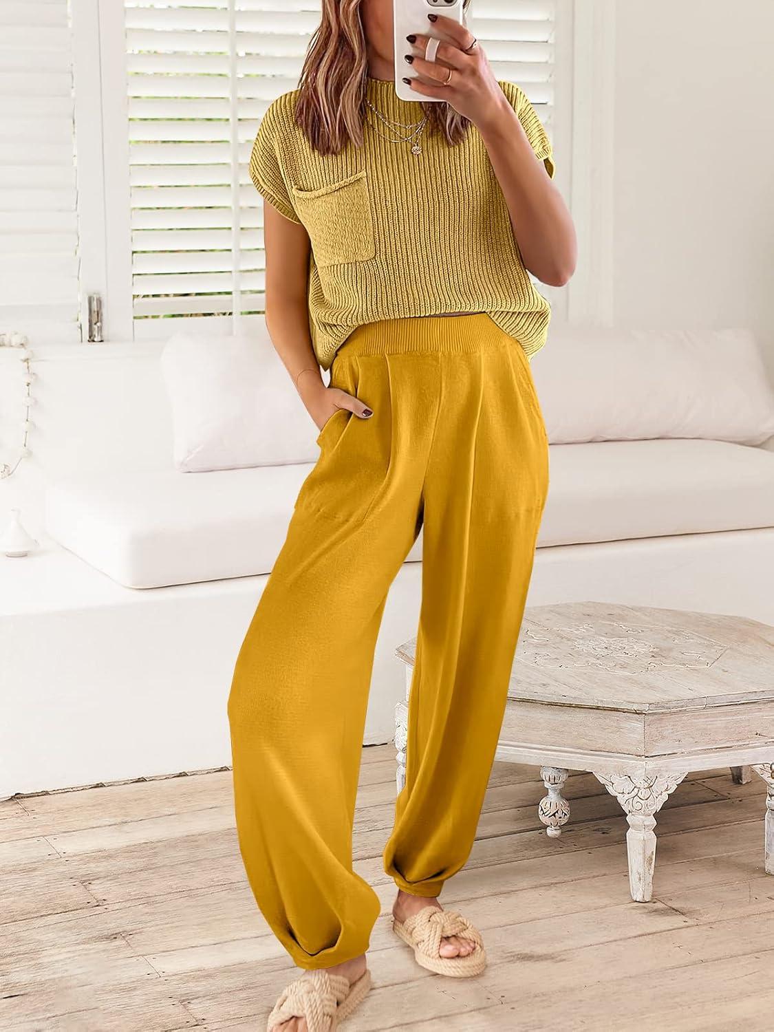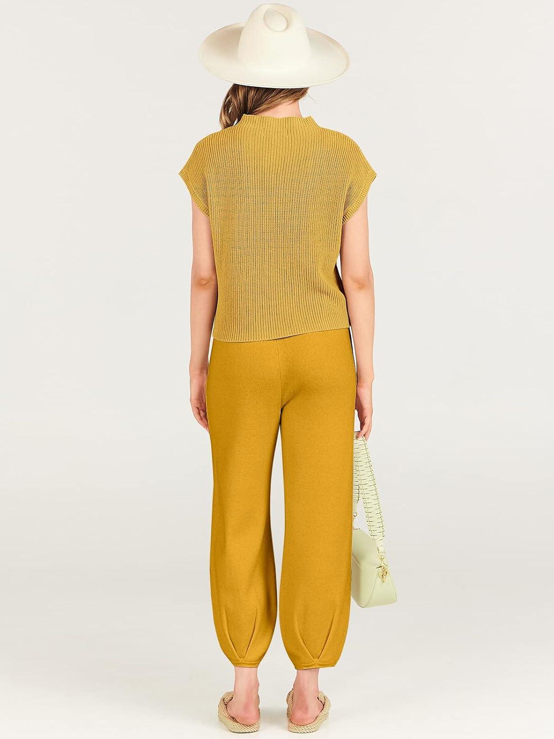ANRABESS Women's Two Piece Outfits Knit Sweater Vest Crop Top Pants Lounge Matching Tracksuit Sweatsuit Travel Clothes Sets(Yellow)