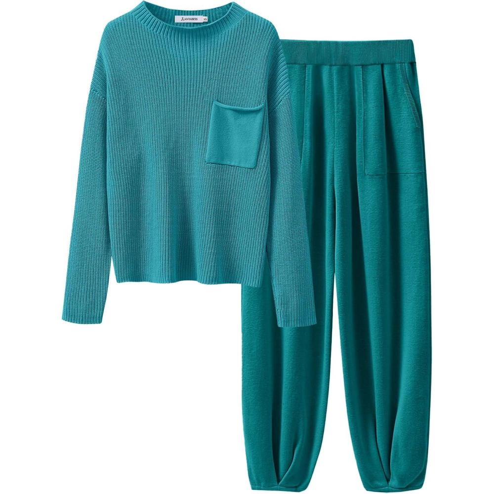 ANRABESS Women’s Two Piece Outfits Long Sleeve Knit Top Fall Sweater Set Oversized Pants Tracksuit Lounge Sets(Deep Green)