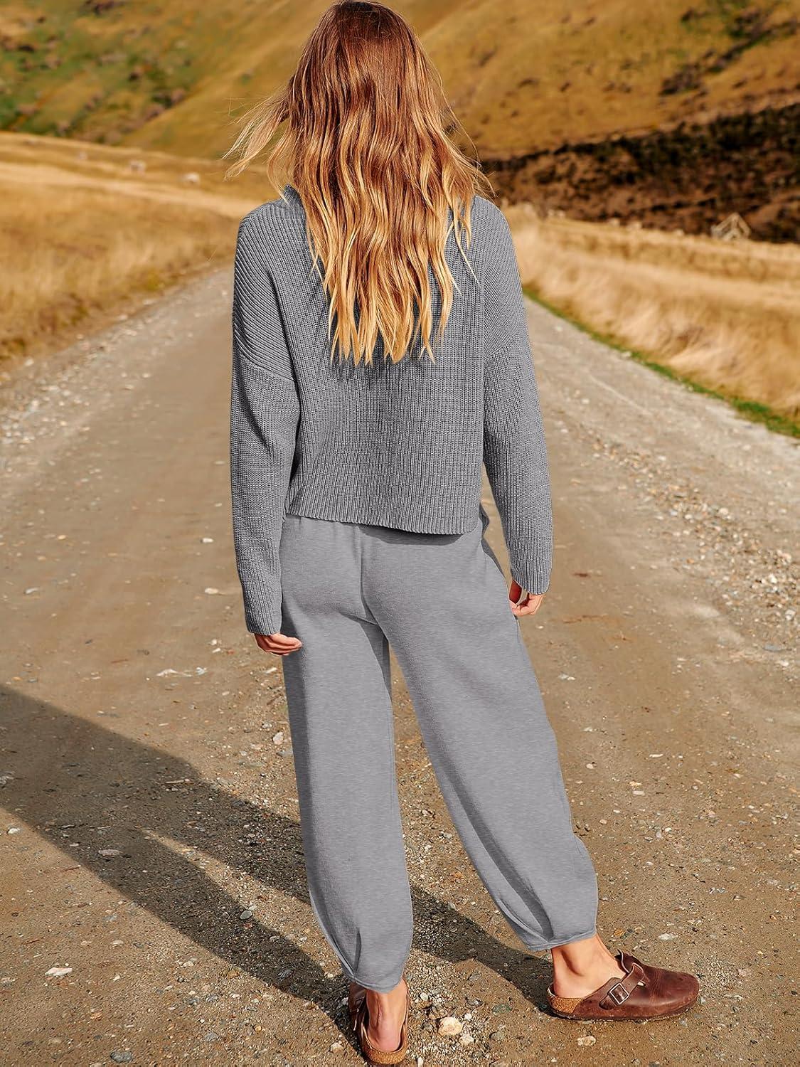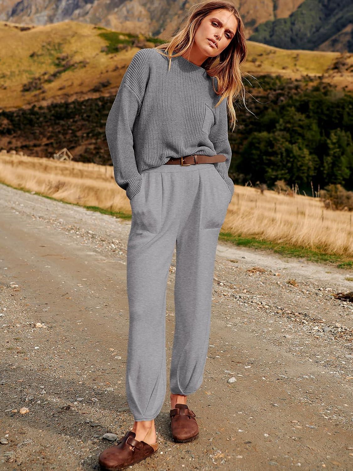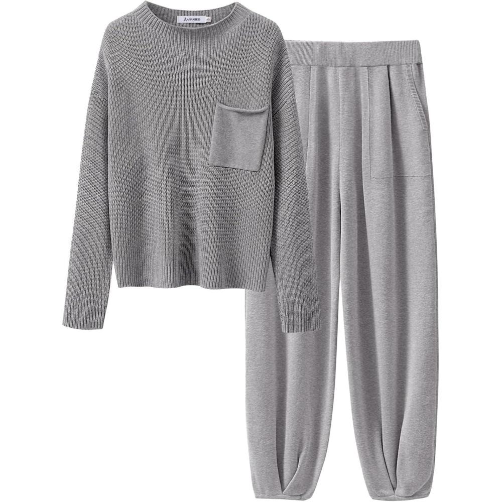 ANRABESS Women's Two Piece Outfits Long Sleeve Knit Top Fall Sweater Set Oversized Pants Tracksuit Lounge Sets(Light Grey)