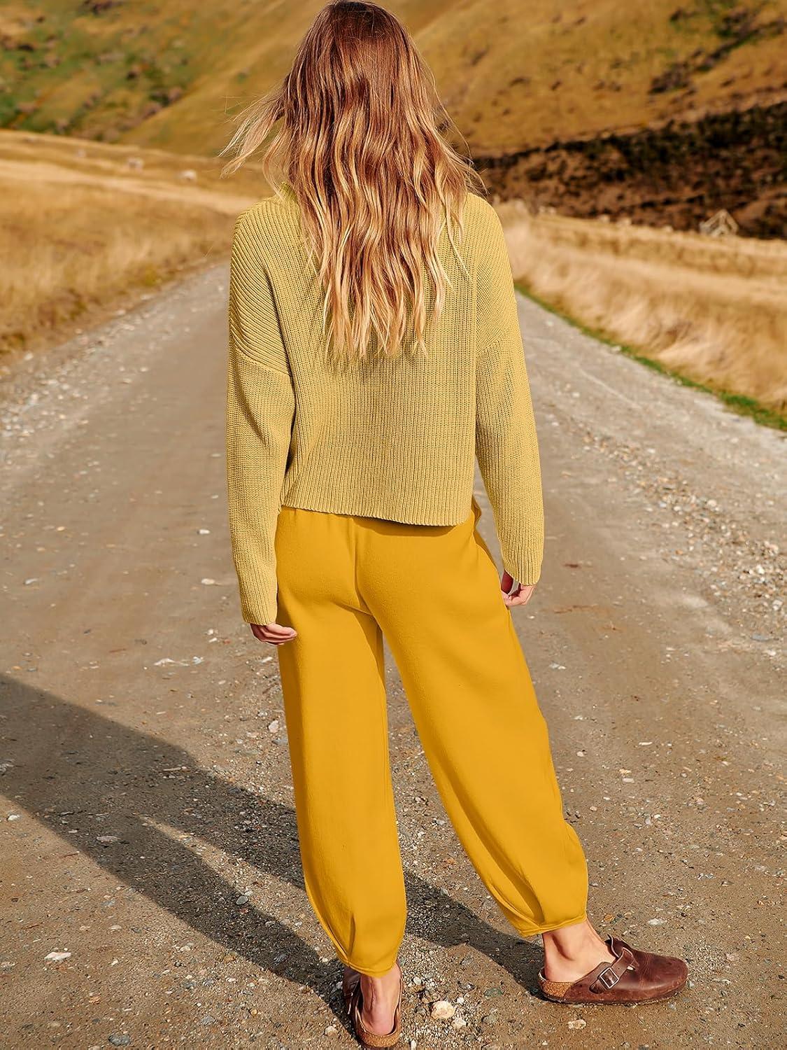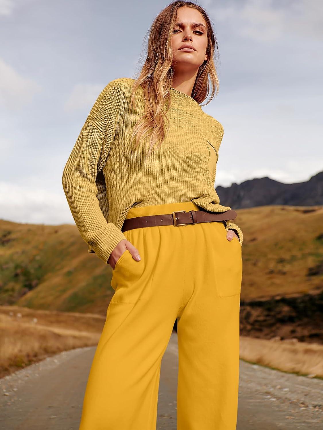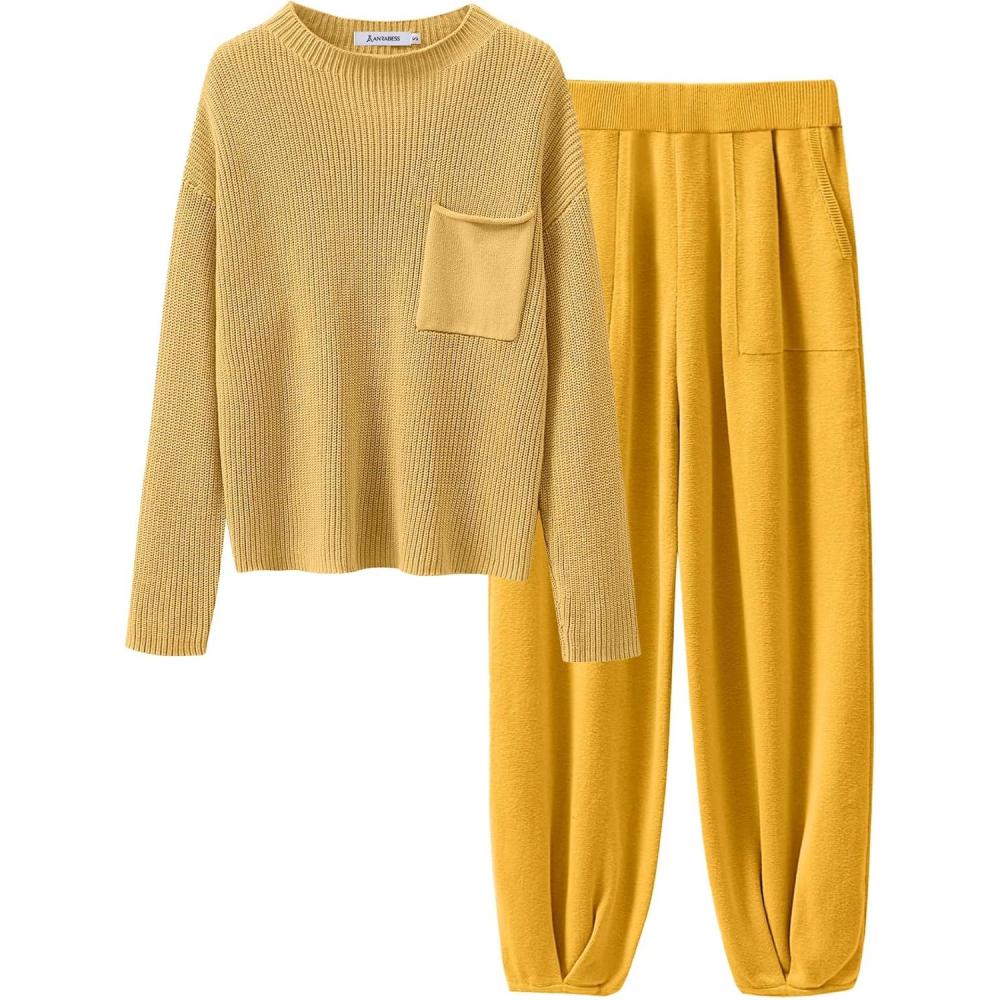ANRABESS Women's Two Piece Outfits Long Sleeve Knit Top Fall Sweater Set Oversized Pants Tracksuit Lounge Sets(Yellow)