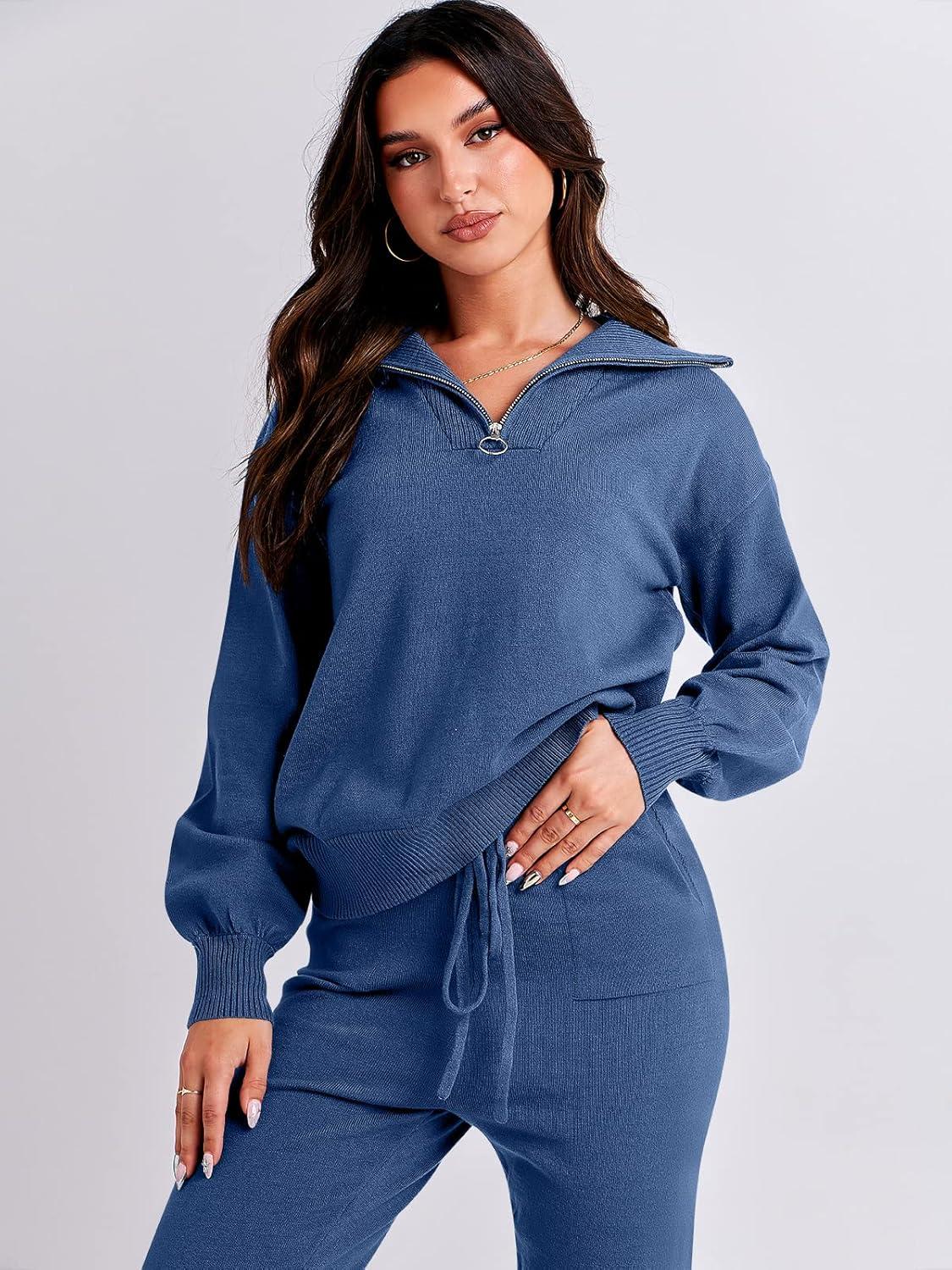 imageANRABESS Womens Two Piece Outfits Sweater Lounge Sets Long Sleeve Zip Up Knit Pullover Jogger Pants Tracksuit Travel OutfitsDark Blue