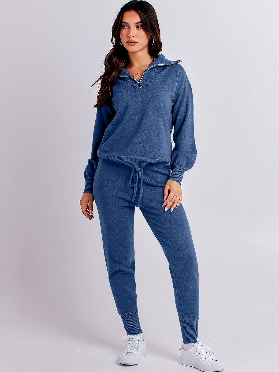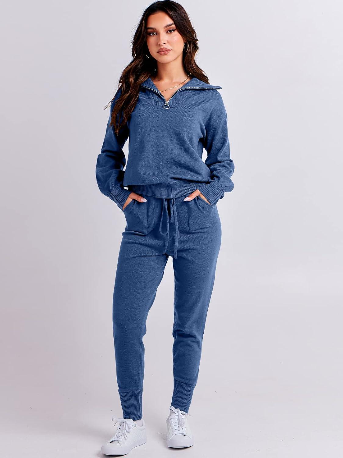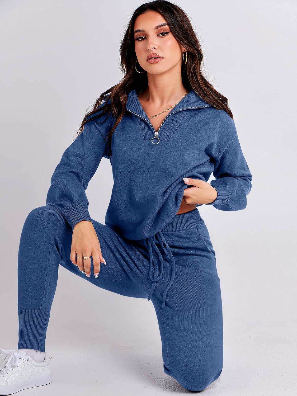 ANRABESS Women's Two Piece Outfits Sweater Lounge Sets Long Sleeve Zip Up Knit Pullover Jogger Pants Tracksuit Travel Outfits(Dark Blue)