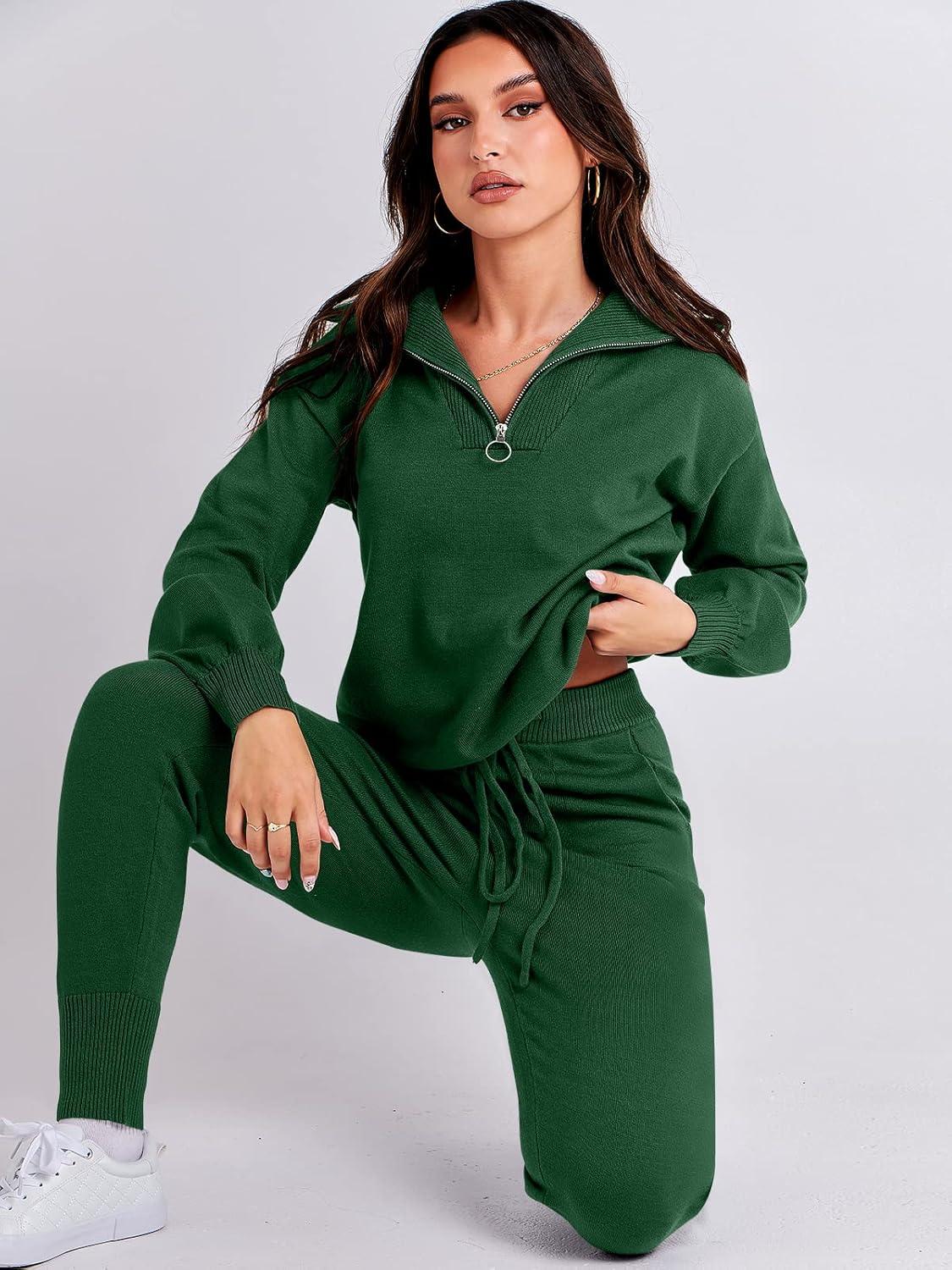 ANRABESS Women’s Two Piece Outfits Sweater Lounge Sets Long Sleeve Zip Up Knit Pullover Jogger Pants Tracksuit Travel Outfits(Deep Green)
