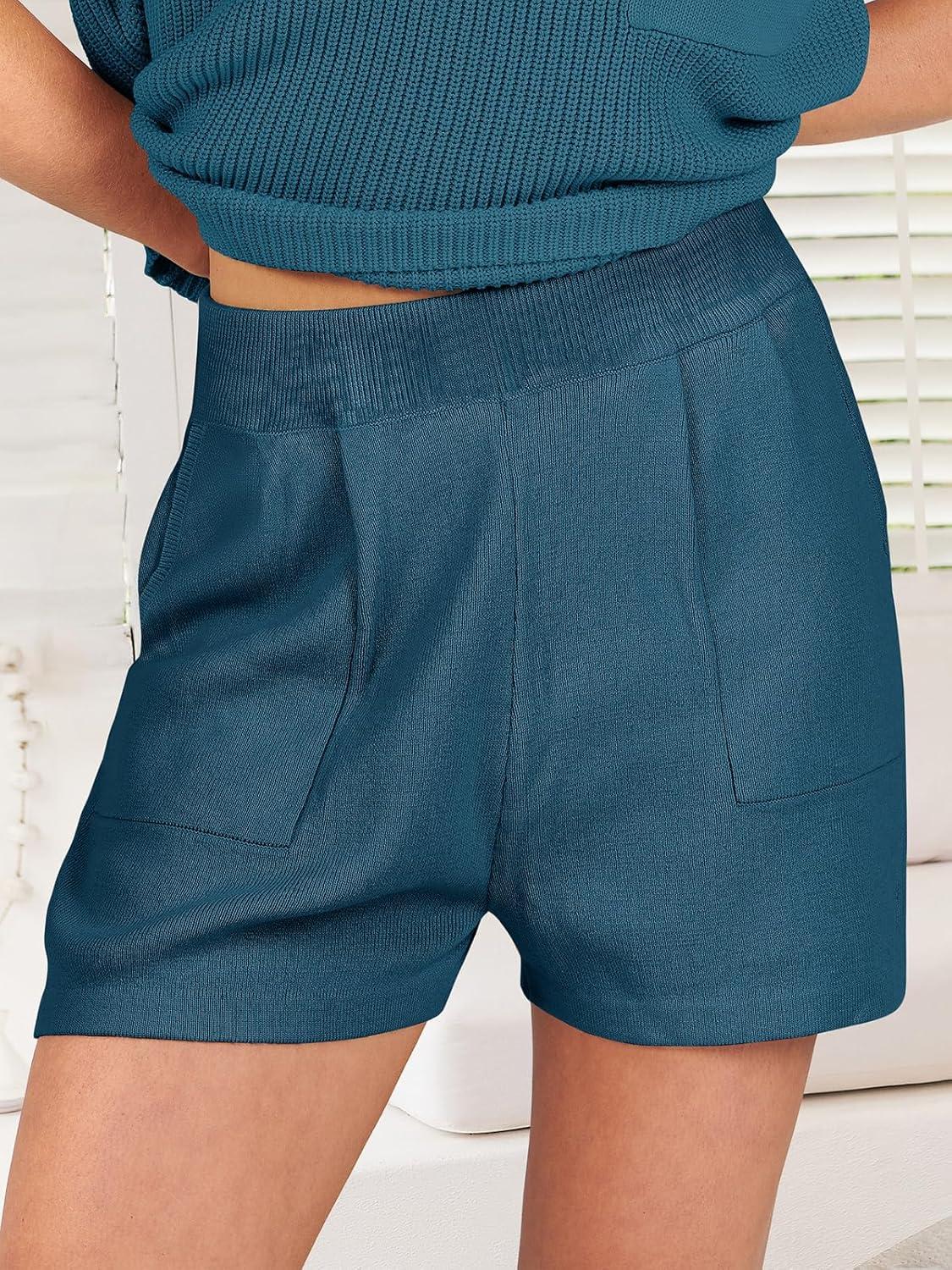ANRABESS Women’s Two Piece Summer Outfits Knit Sweater Short Sets Pullover Tops & Shorts Lounge Matching Clothes Set(Blue)