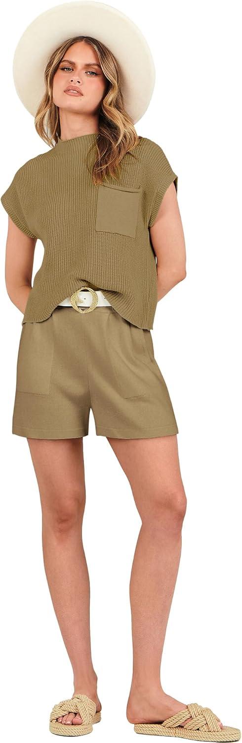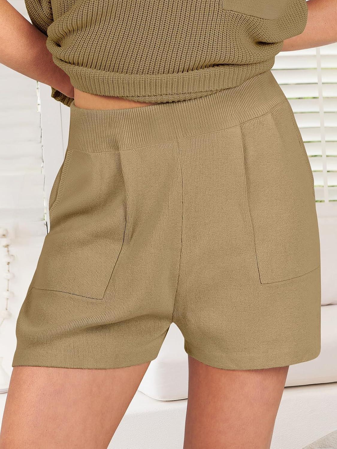 ANRABESS Women’s Two Piece Summer Outfits Knit Sweater Short Sets Pullover Tops & Shorts Lounge Matching Clothes Set(Brown)