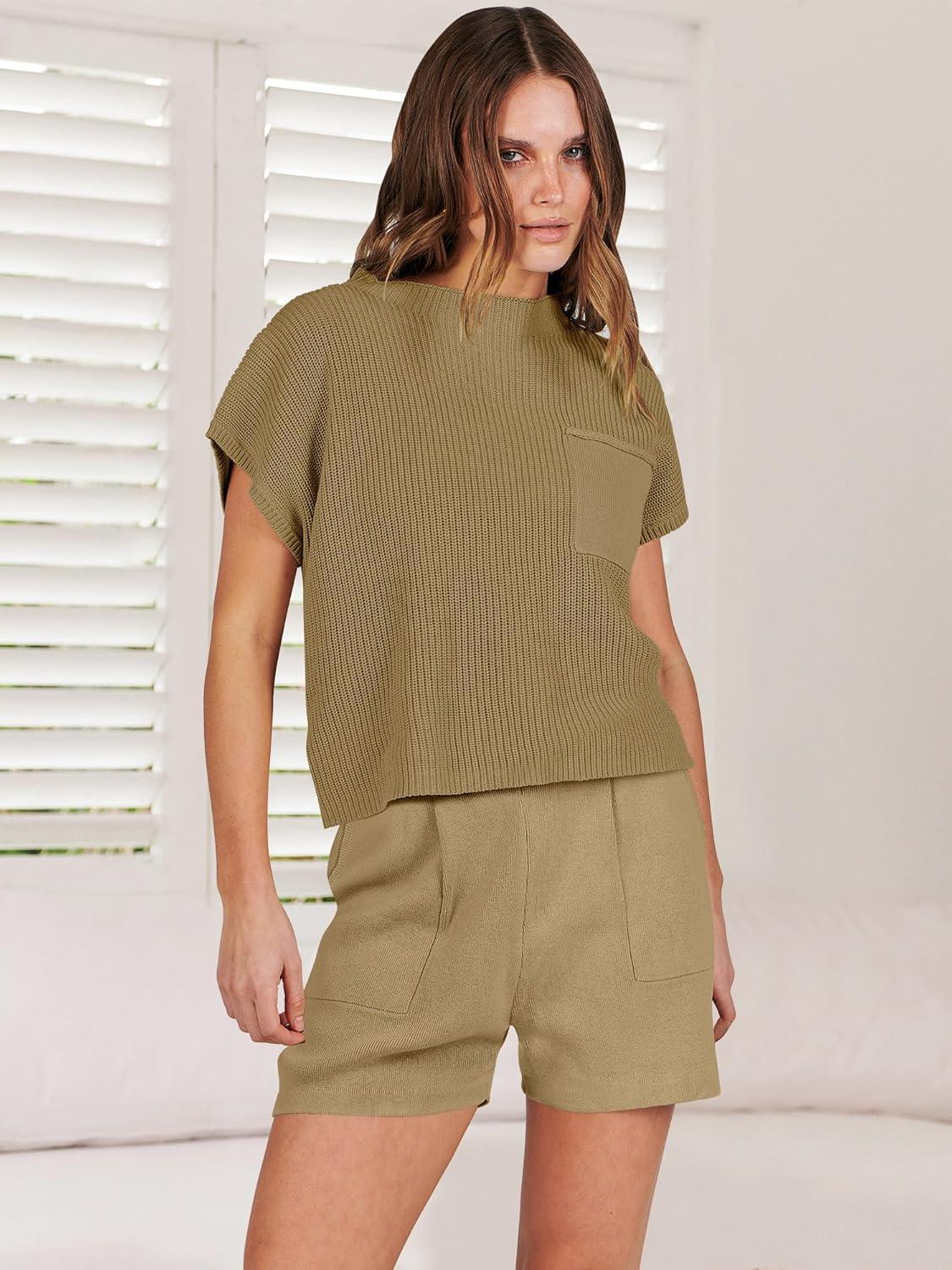 imageANRABESS Womens Two Piece Summer Outfits Knit Sweater Short Sets Pullover Tops amp Shorts Lounge Matching Clothes SetBrown
