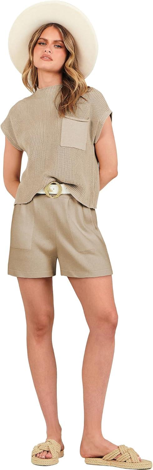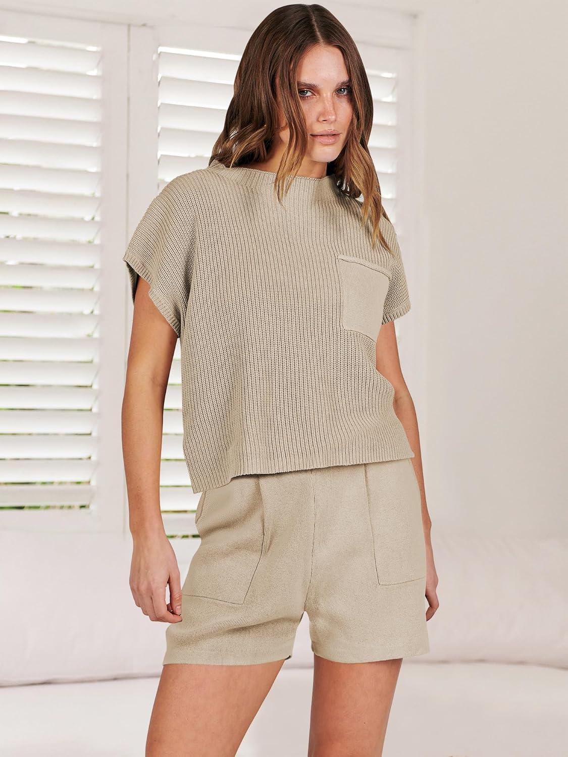 ANRABESS Women’s Two Piece Summer Outfits Knit Sweater Short Sets Pullover Tops & Shorts Lounge Matching Clothes Set(Khaki)