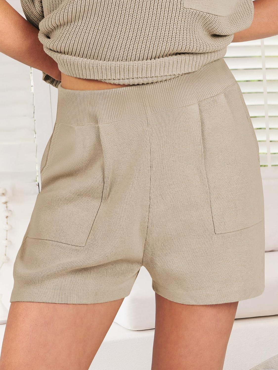 ANRABESS Women’s Two Piece Summer Outfits Knit Sweater Short Sets Pullover Tops & Shorts Lounge Matching Clothes Set(Khaki White)