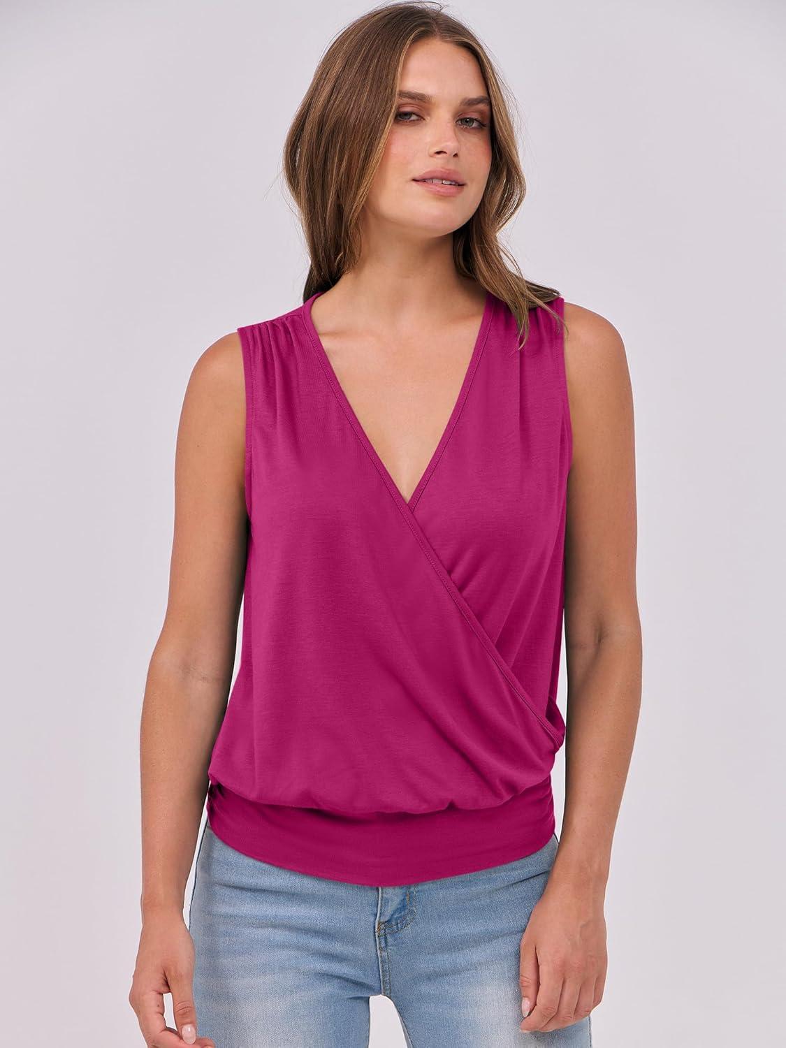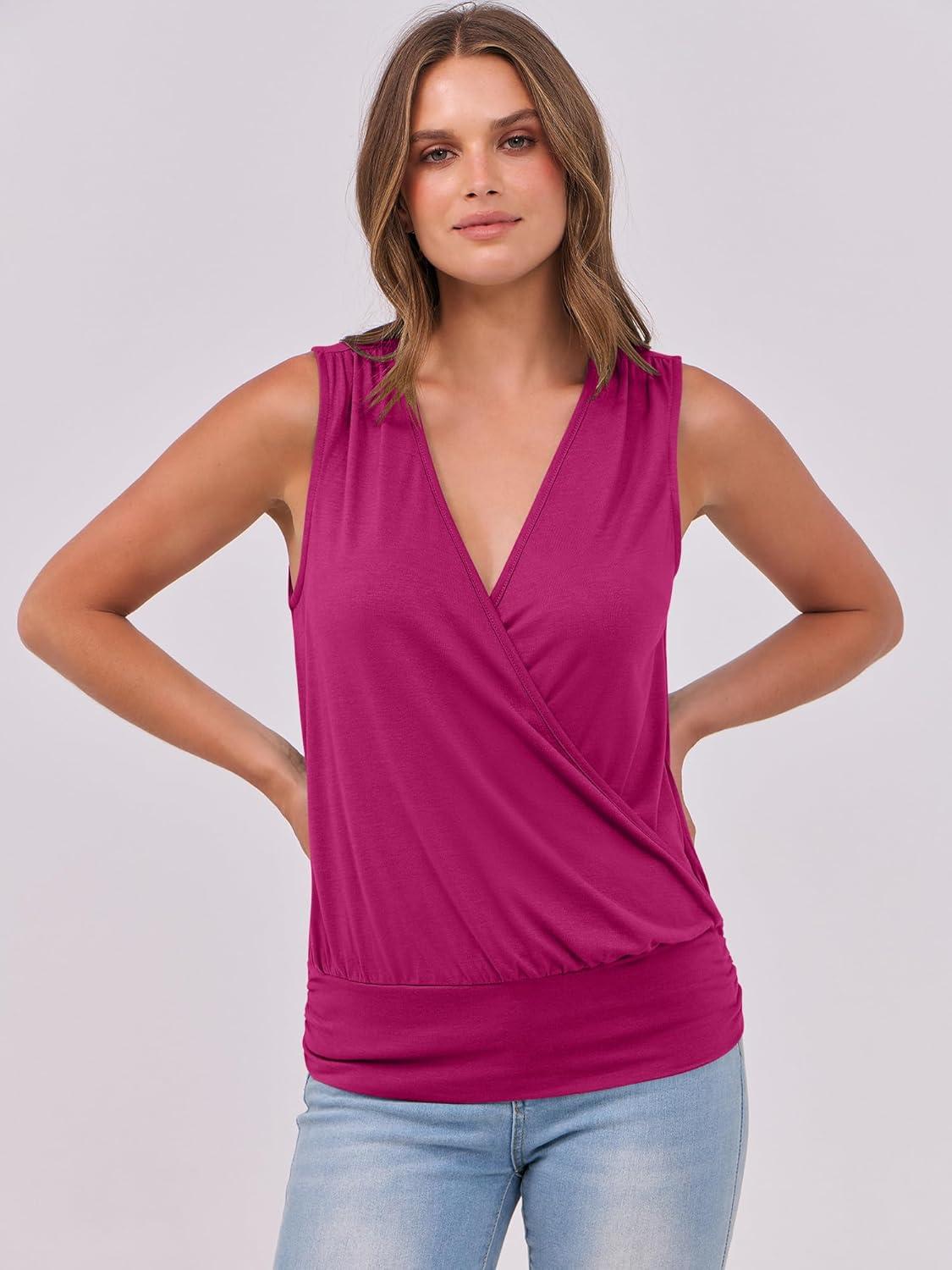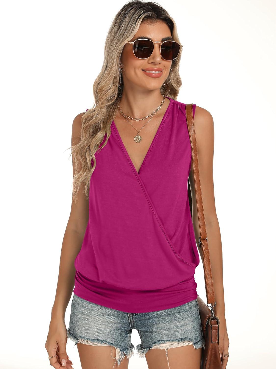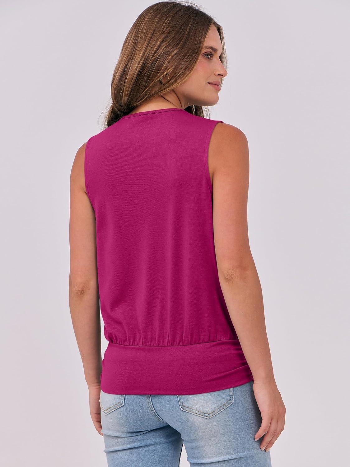 ANRABESS Womens V Neck Tank Tops Wrap Banded Hem Shirts Sleeveless Ruched Going Out Blouse 2026 Summer Fashion Clothing(Hot Pink)