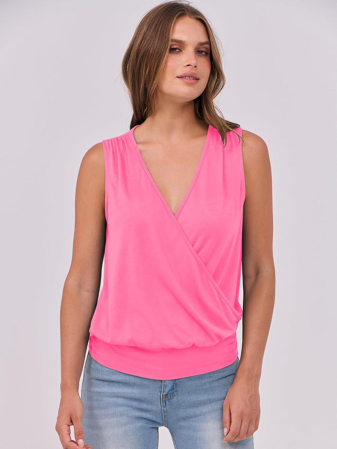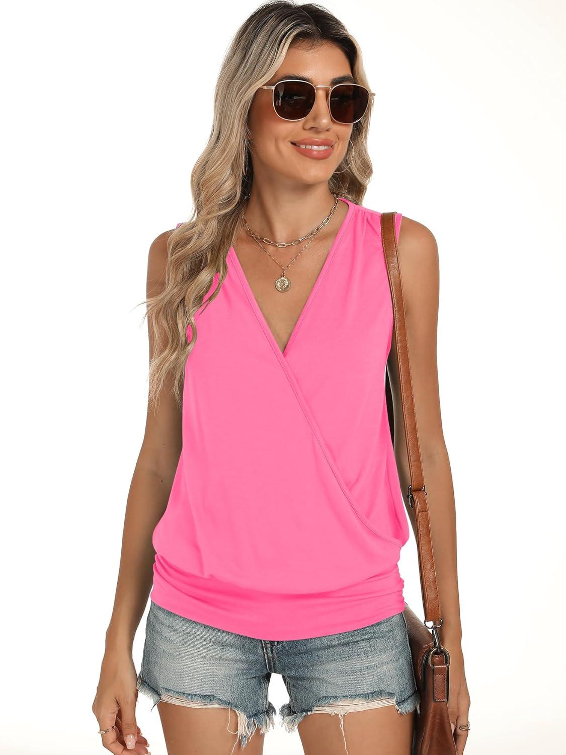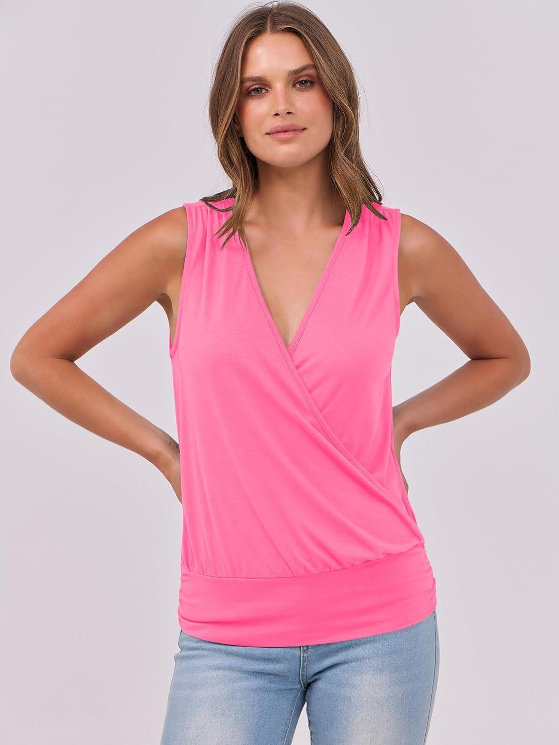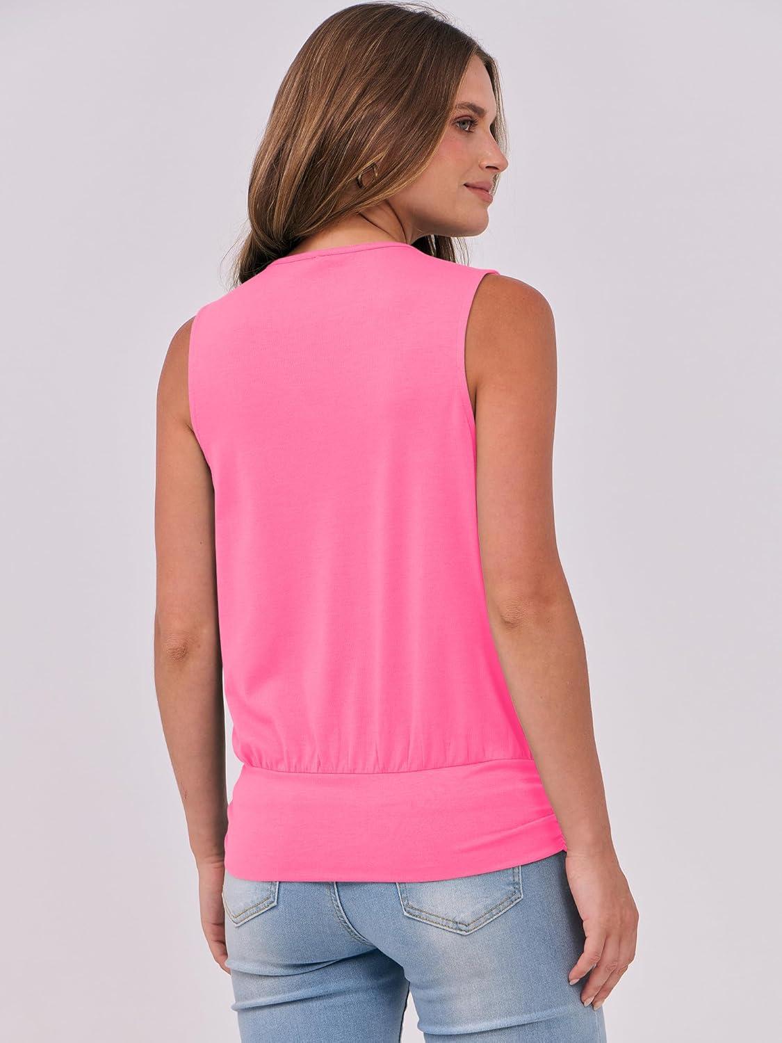 ANRABESS Womens V Neck Tank Tops Wrap Banded Hem Shirts Sleeveless Ruched Going Out Blouse 2026 Summer Fashion Clothing(Neon Hot Pink)