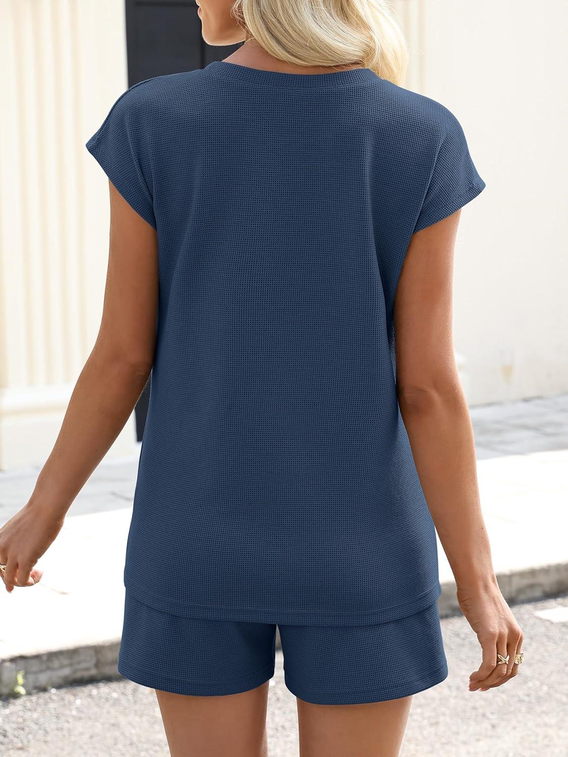 imageANRABESS Womens Waffle Knit 2 Piece Short Sets Cap Sleeve Summer 2026 Matching Lounge Outfits Travel Beach Vacation SweatsuitNavy Blue