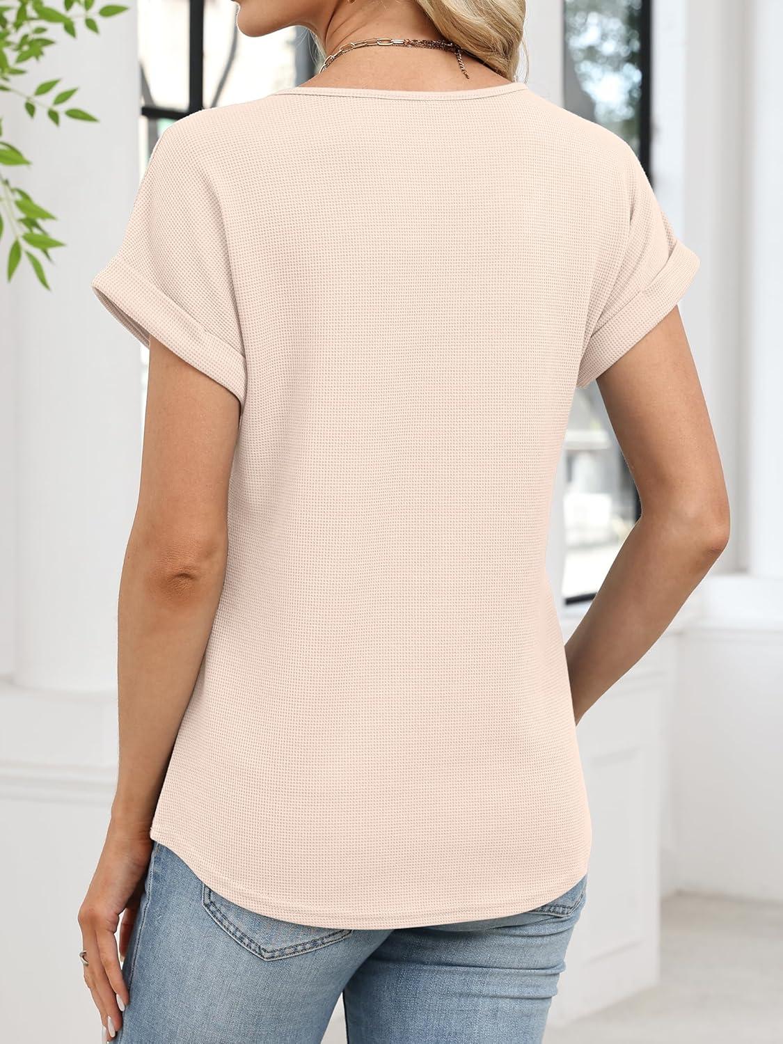 ANRABESS Womens Waffle Knit Tops 2026 Summer Casual Short Sleeve V Neck T Shirts Basic Work Tee Spring Vacation Blouses(Beige)