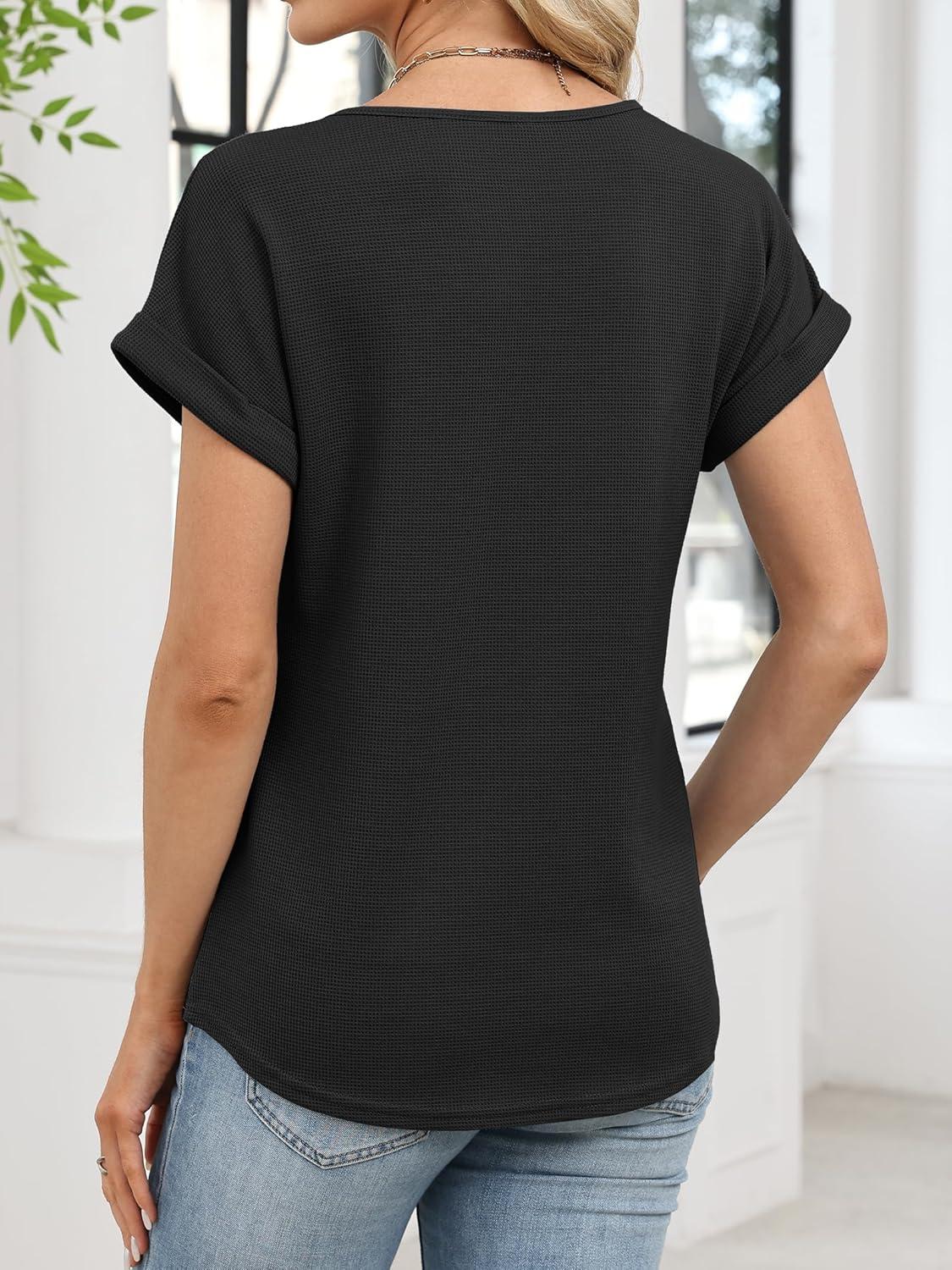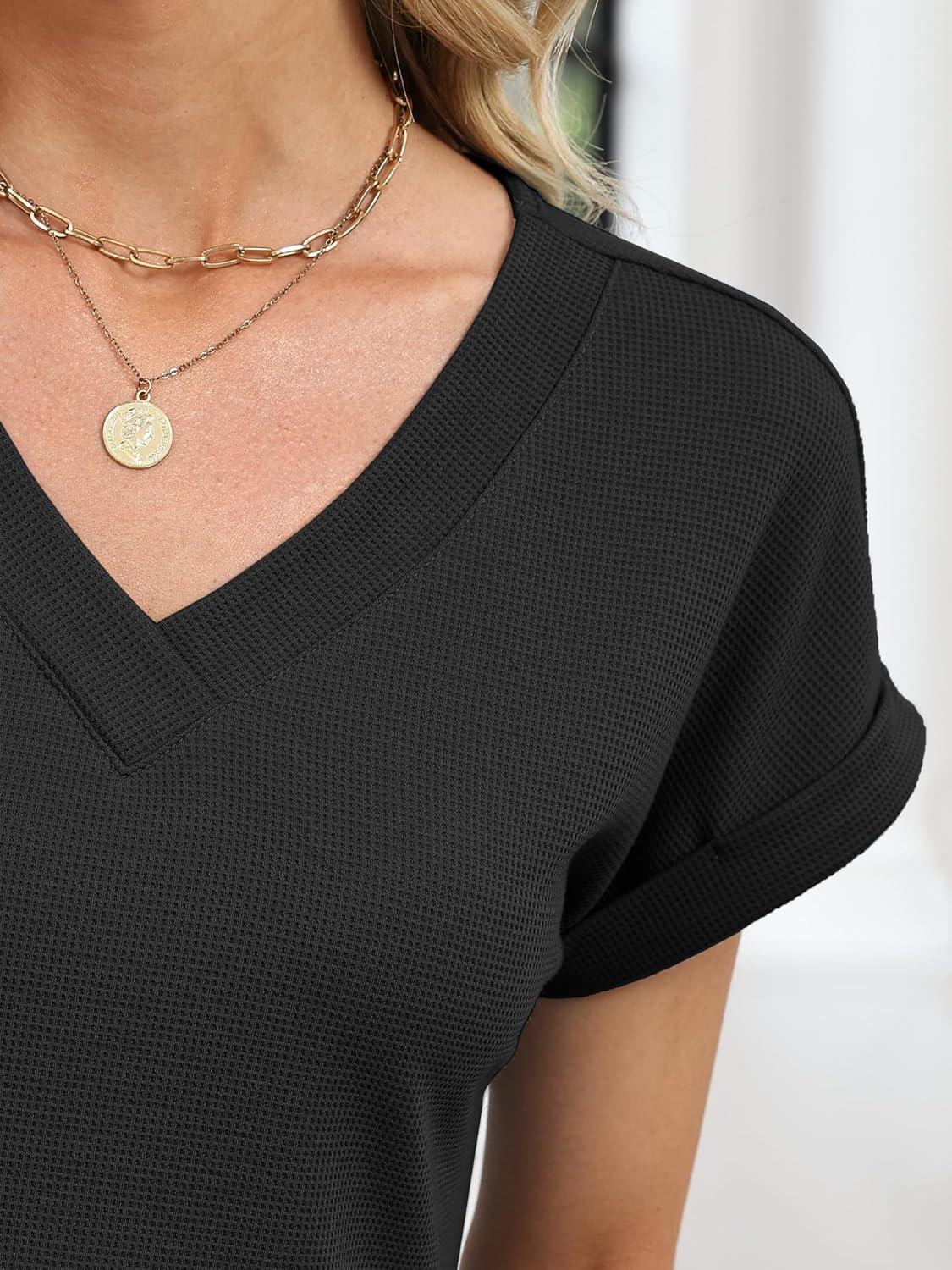 ANRABESS Womens Waffle Knit Tops 2026 Summer Casual Short Sleeve V Neck T Shirts Basic Work Tee Spring Vacation Blouses(Black)