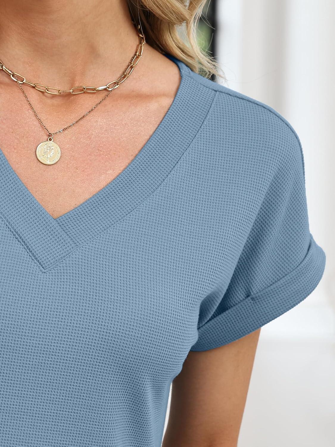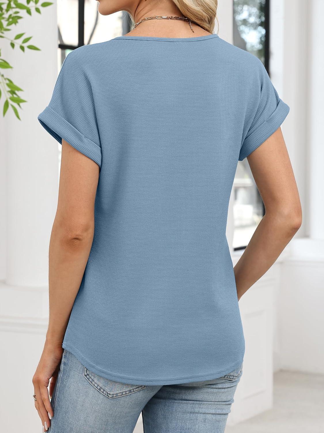 ANRABESS Womens Waffle Knit Tops 2026 Summer Casual Short Sleeve V Neck T Shirts Basic Work Tee Spring Vacation Blouses(Blue)