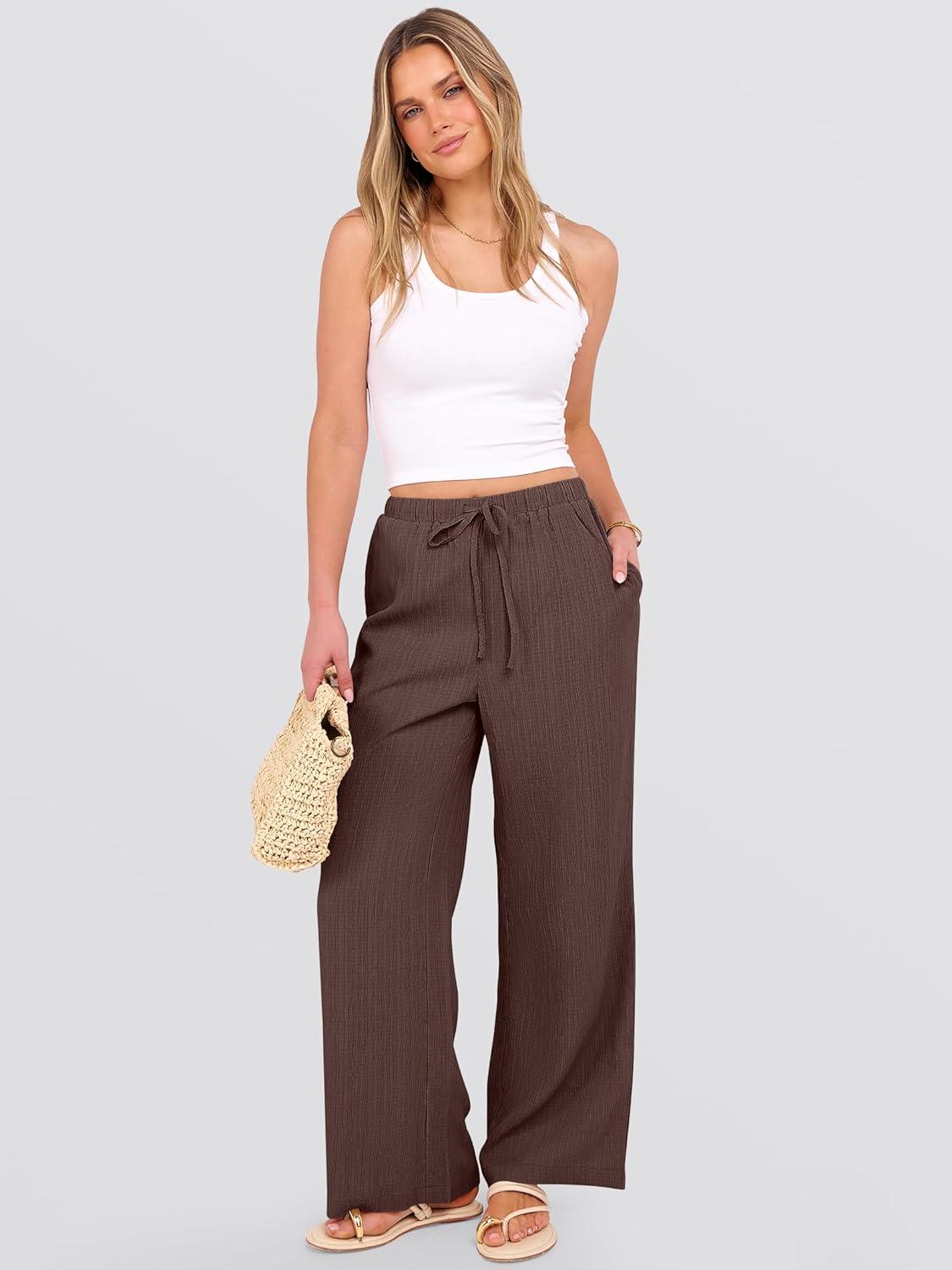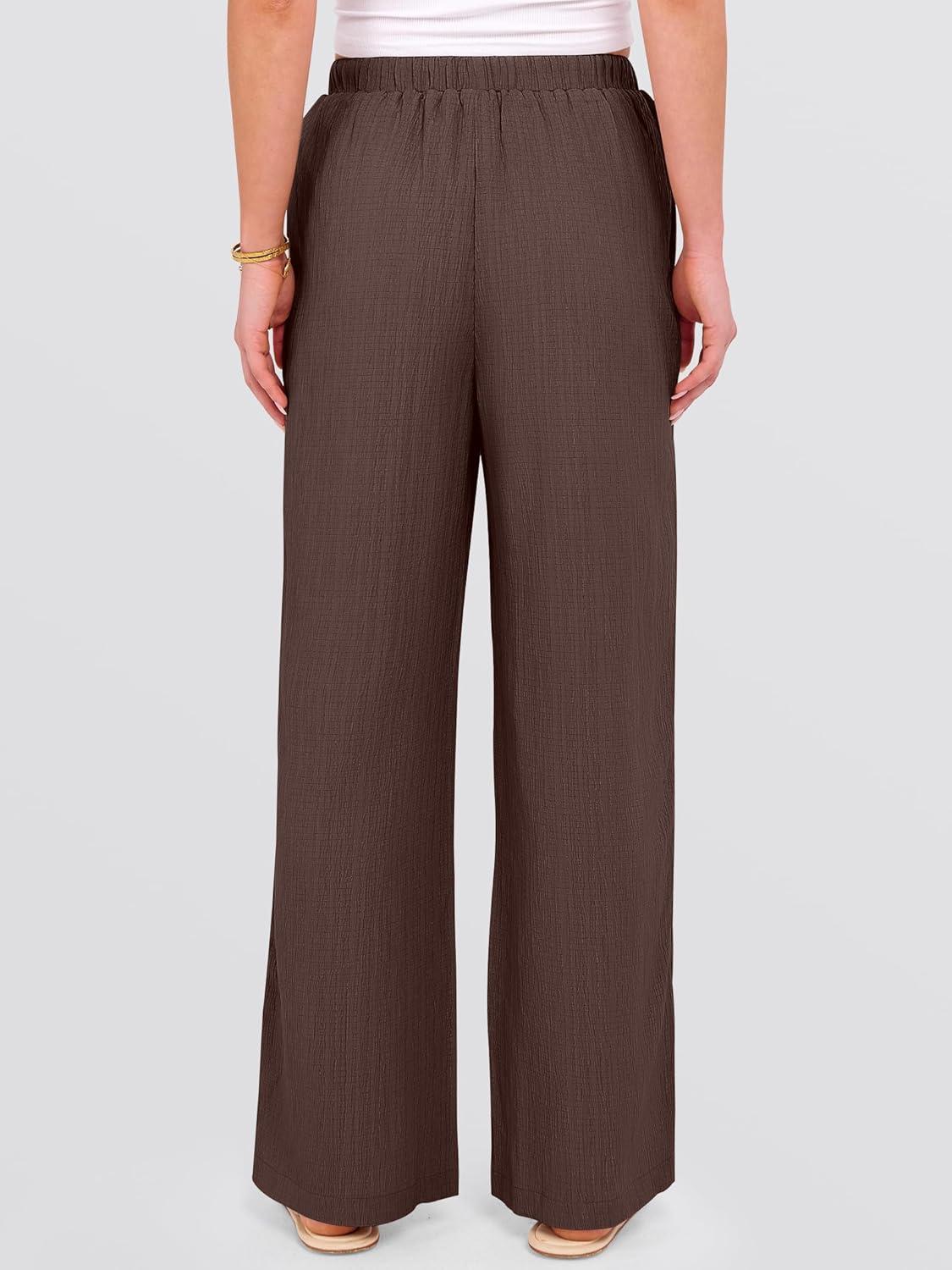 ANRABESS Women’s Wide Leg Beach Pants Elastic Waist Lightweight Casual Flowy Palazzo Lounge Trousers with Pockets(Brown)
