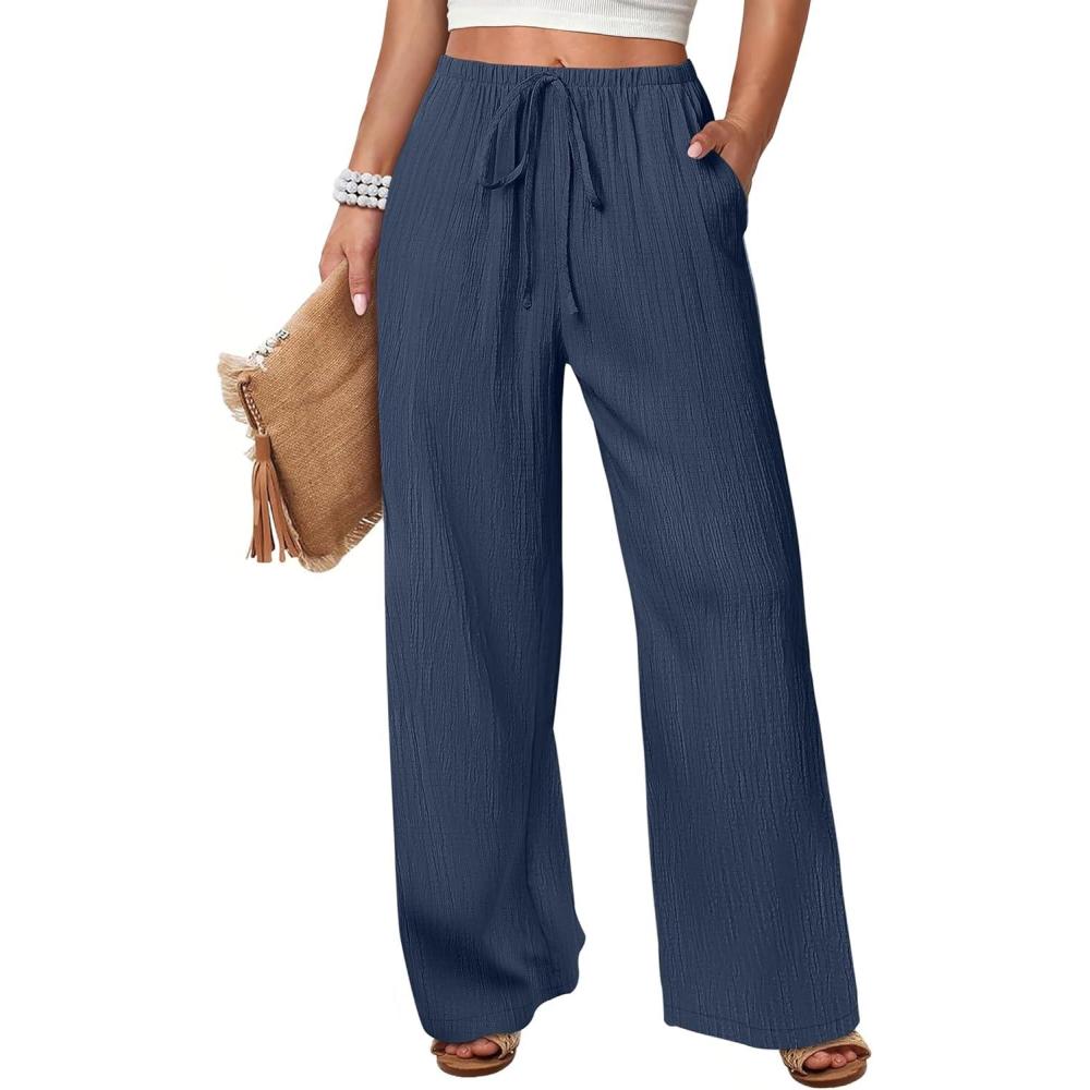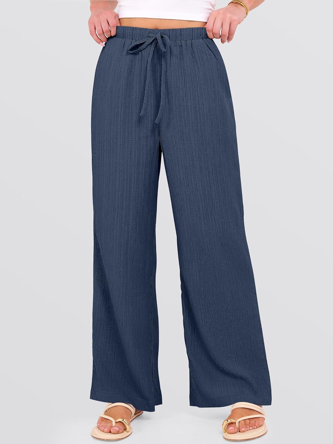 ANRABESS Women’s Wide Leg Beach Pants Elastic Waist Lightweight Casual Flowy Palazzo Lounge Trousers with Pockets(Lake Blue)